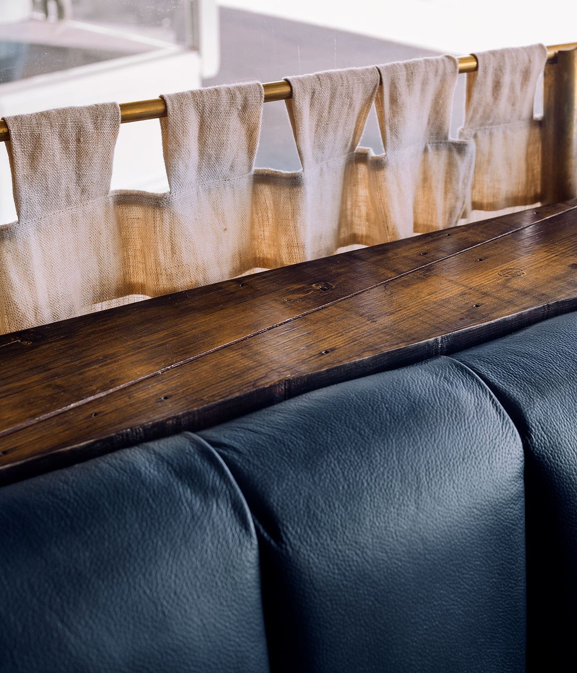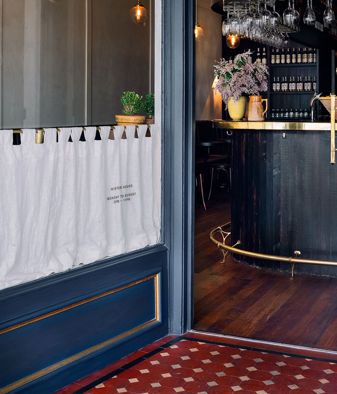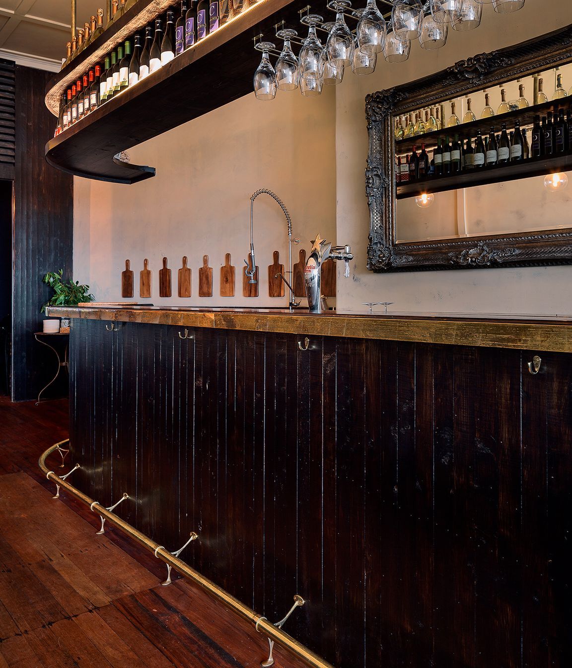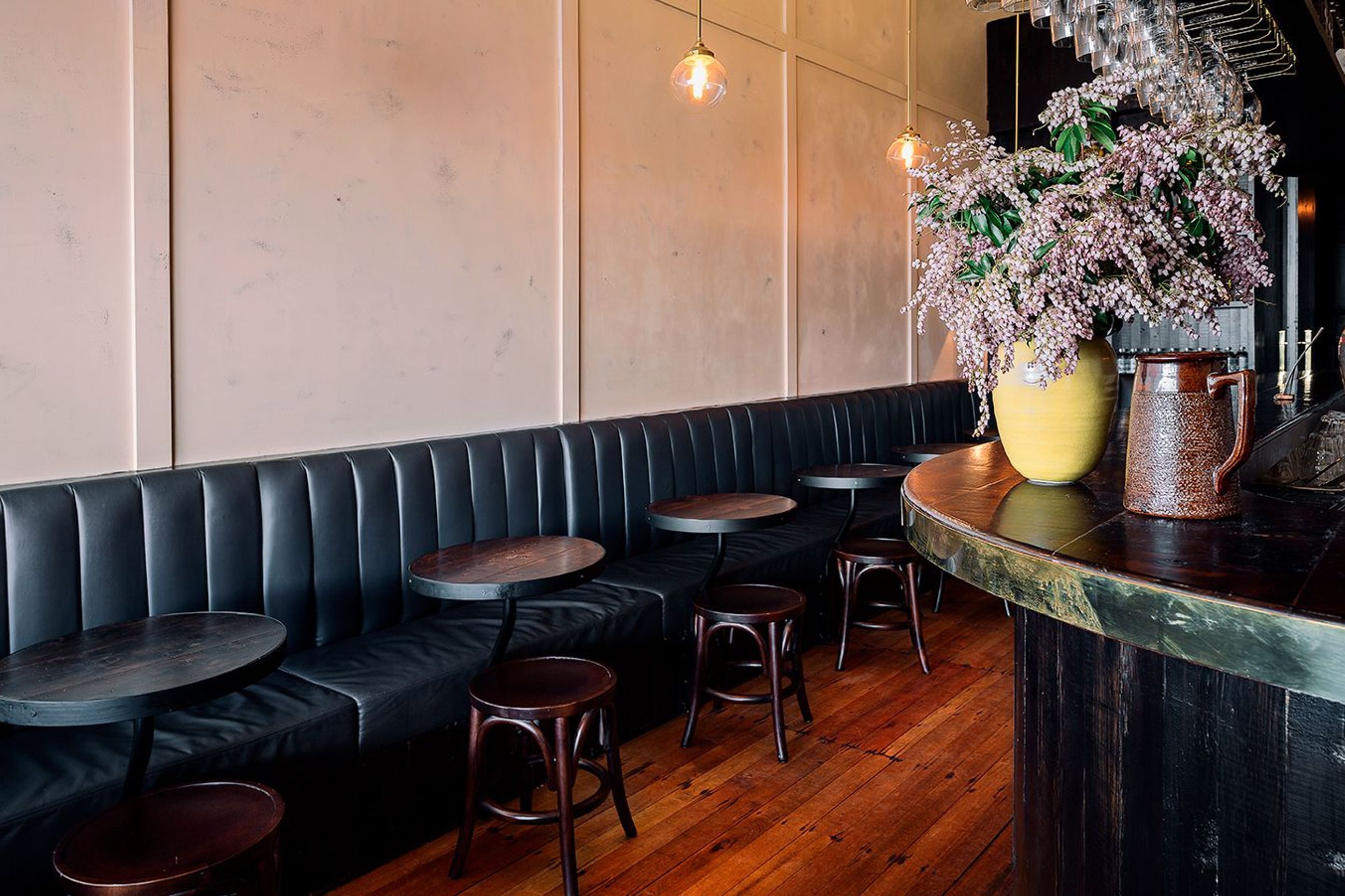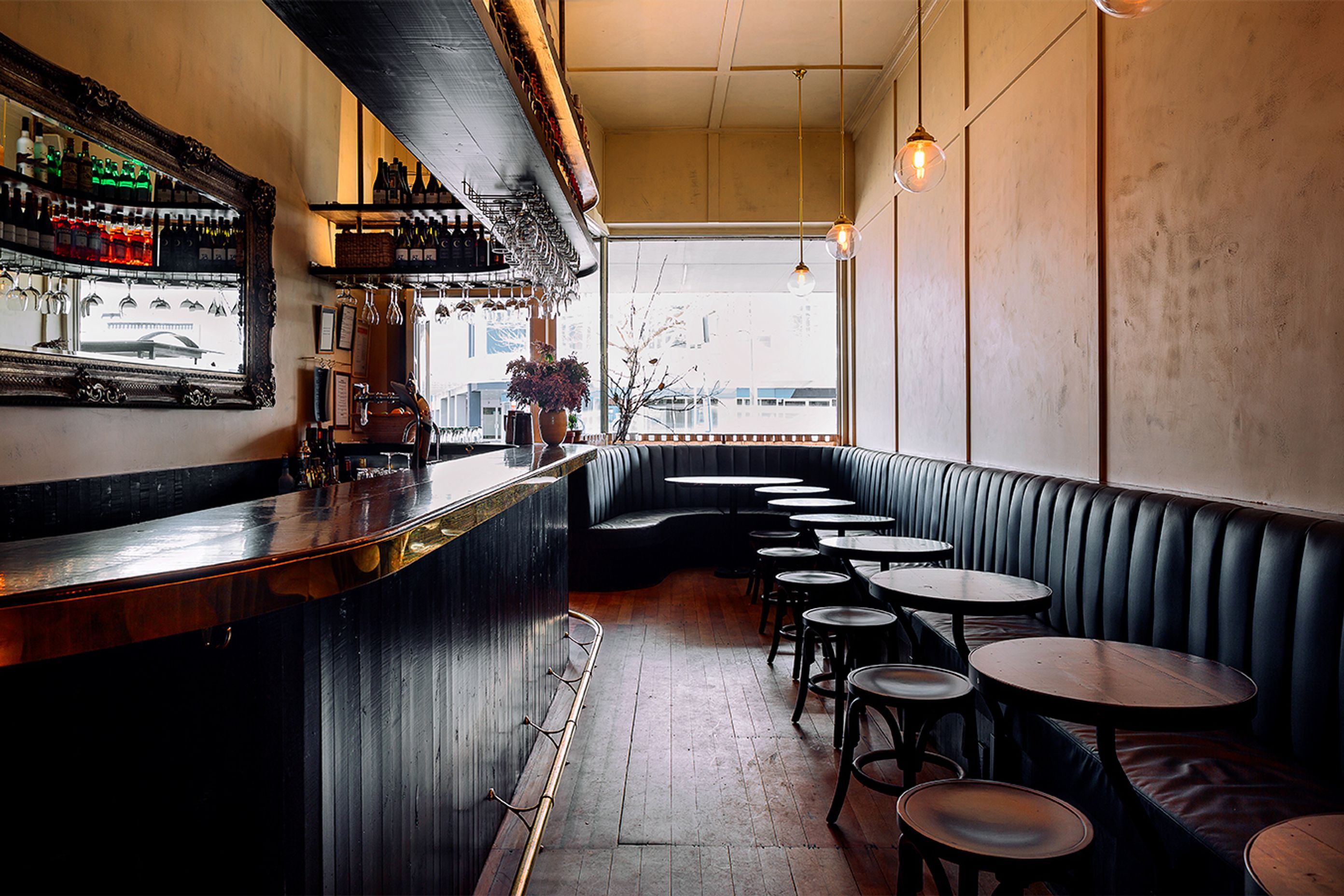 ArchiPro Project Summary - Elegant wine bar in Ponsonby featuring a handmade walnut veneer bar, brass detailing, and navy blue leather upholstery, designed for both beauty and functionality in a limited seating space.