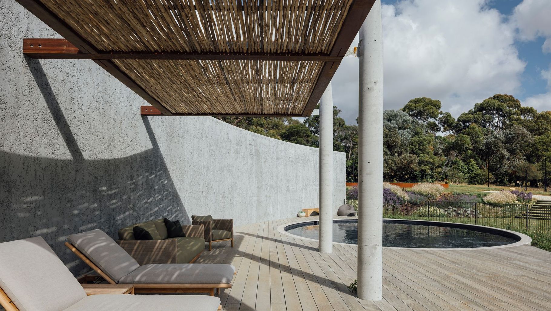 ArchiPro Project Summary - A minimalist masterpiece featuring a captivating swimming pool that harmonizes with the raw exterior and unembellished landscape of the Archadian House, embodying the essence of simplicity and elegance in its serene courtyard setting.