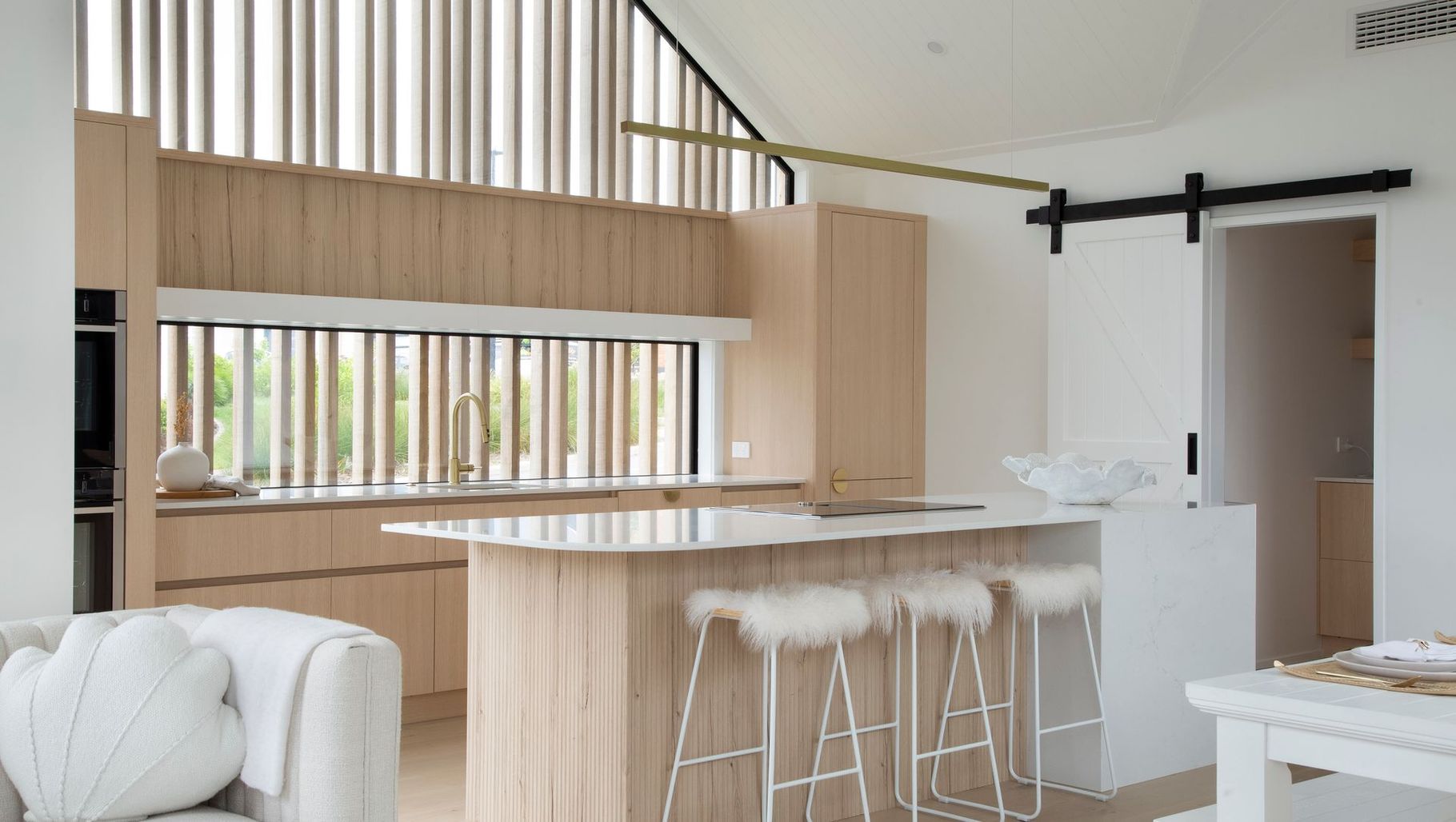 ArchiPro Project Summary - A stunning modern kitchen featuring the Dezignatek Prague profile in Cambridge Oak, showcasing a unique fluted design that enhances the space with a stylish backsplash and under-bench statement, complemented by elegant pillar features.