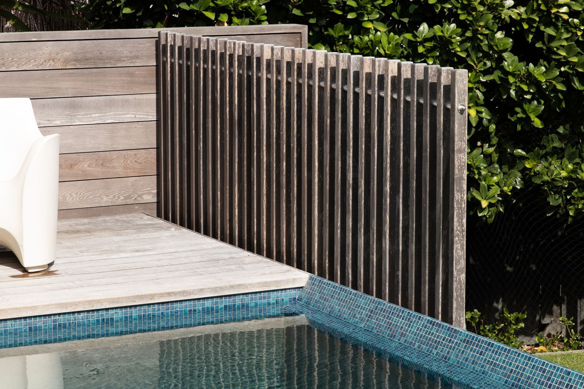 ArchiPro Project Summary - A robust recreation area featuring a creatively elevated pool design, complemented by patterned concrete forms and privacy screens, tailored for a family with four teenage boys.