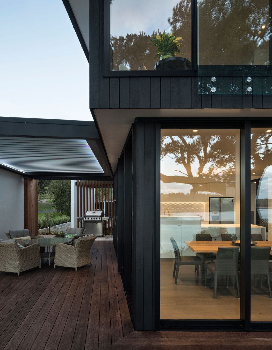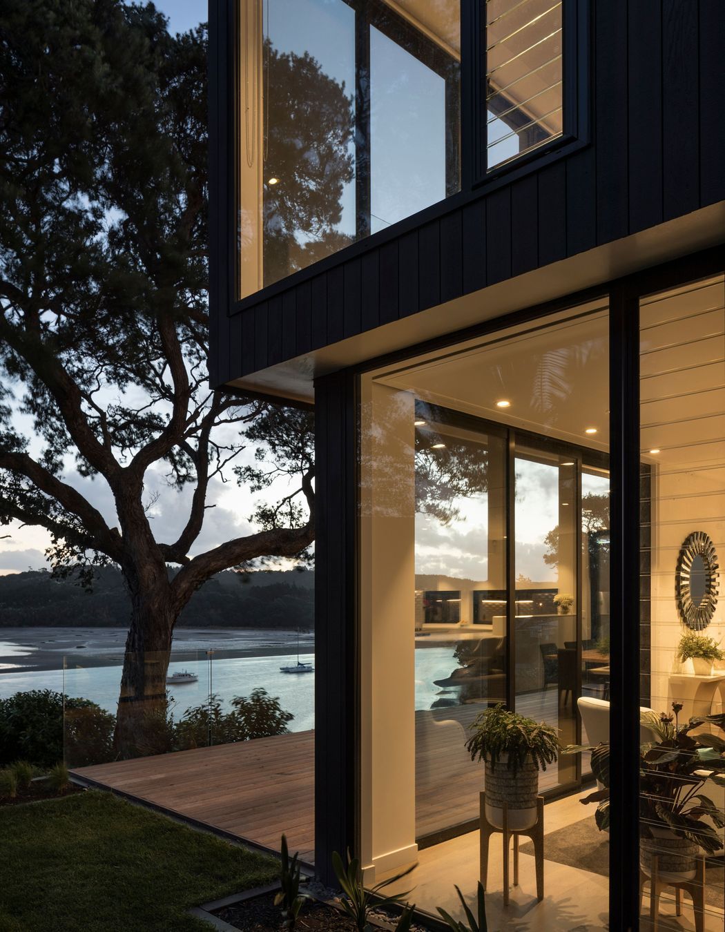 ArchiPro Project Summary - A stunning four-bedroom residence in Whangaparaoa, designed for privacy and breathtaking views of the Wade River and Arkles Bay, featuring a striking angular form, vertical metal cladding, and generous outdoor living spaces.