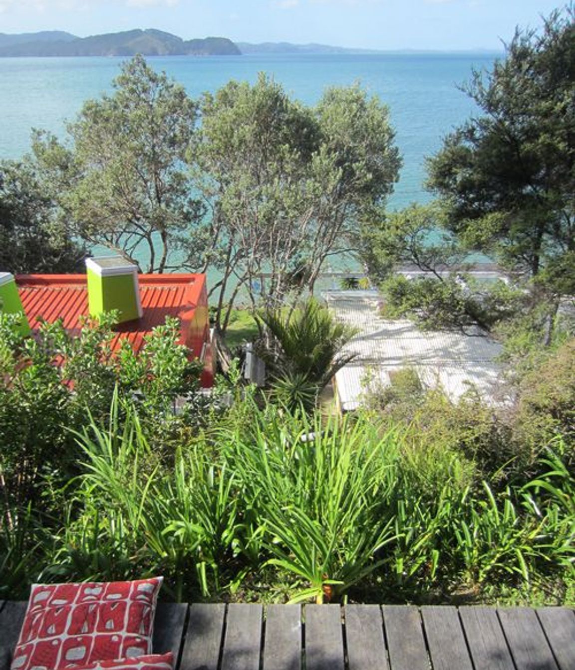 ArchiPro Project Summary - A vibrant treehouse design featuring a multifunctional space nestled among pohutukawa branches, with a striking red exterior that echoes the colors of traditional beachfront baches.