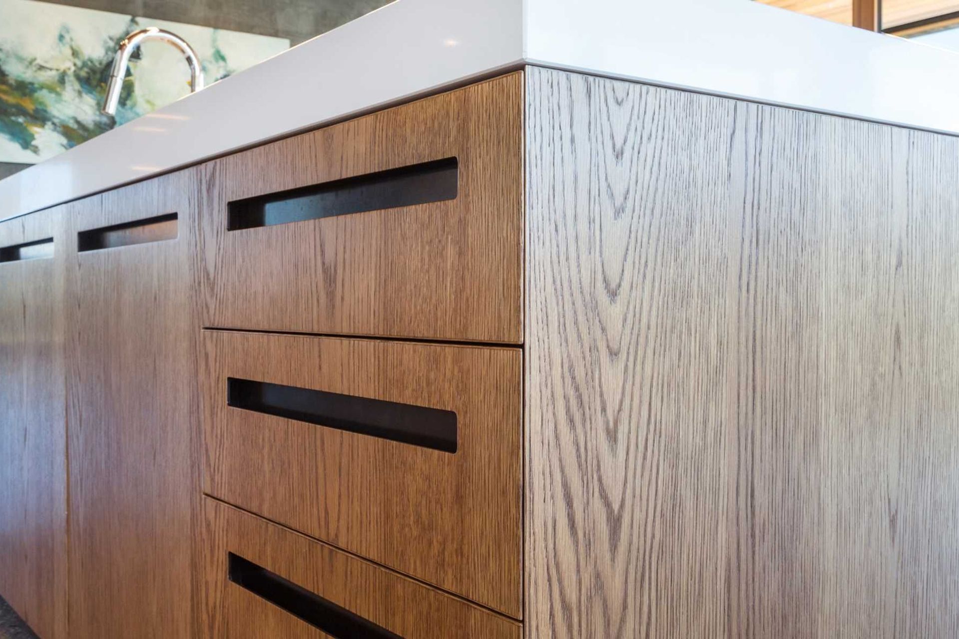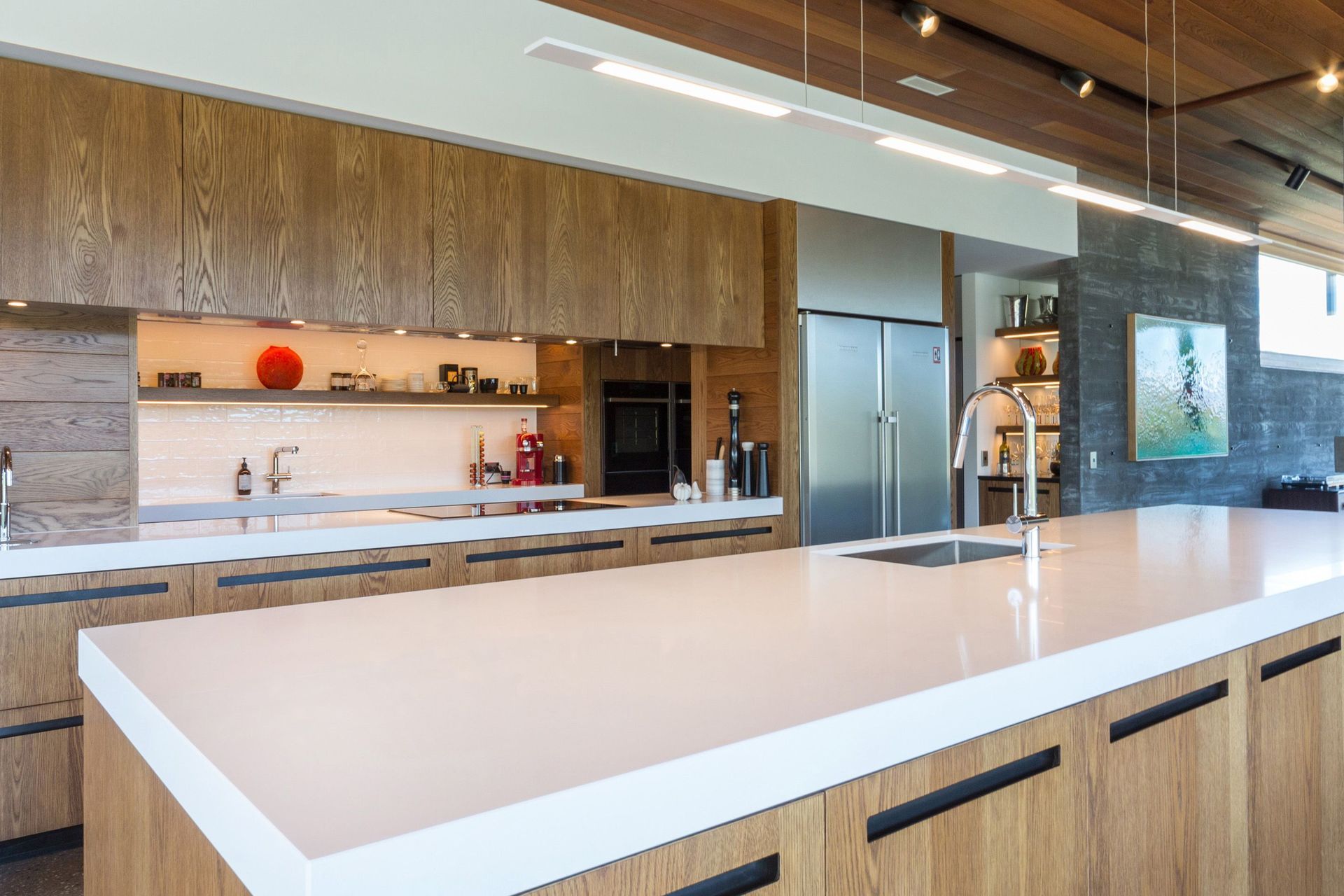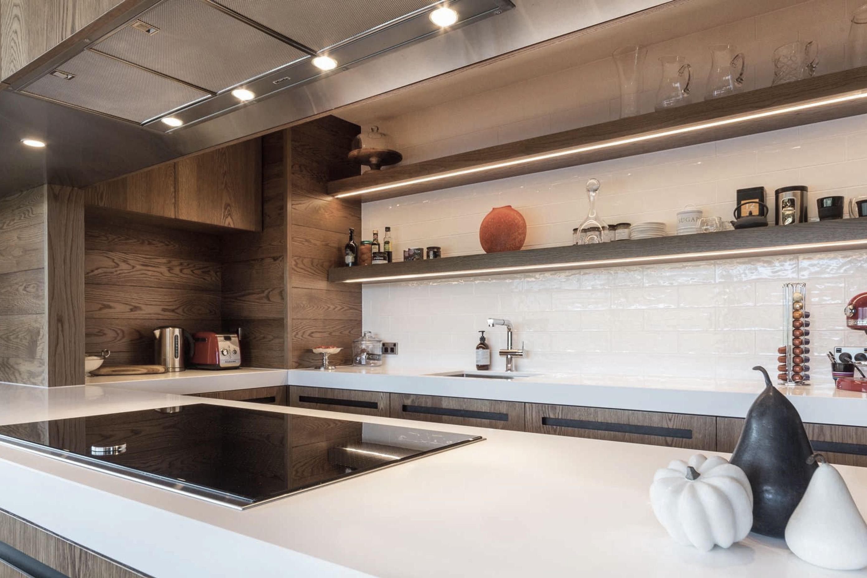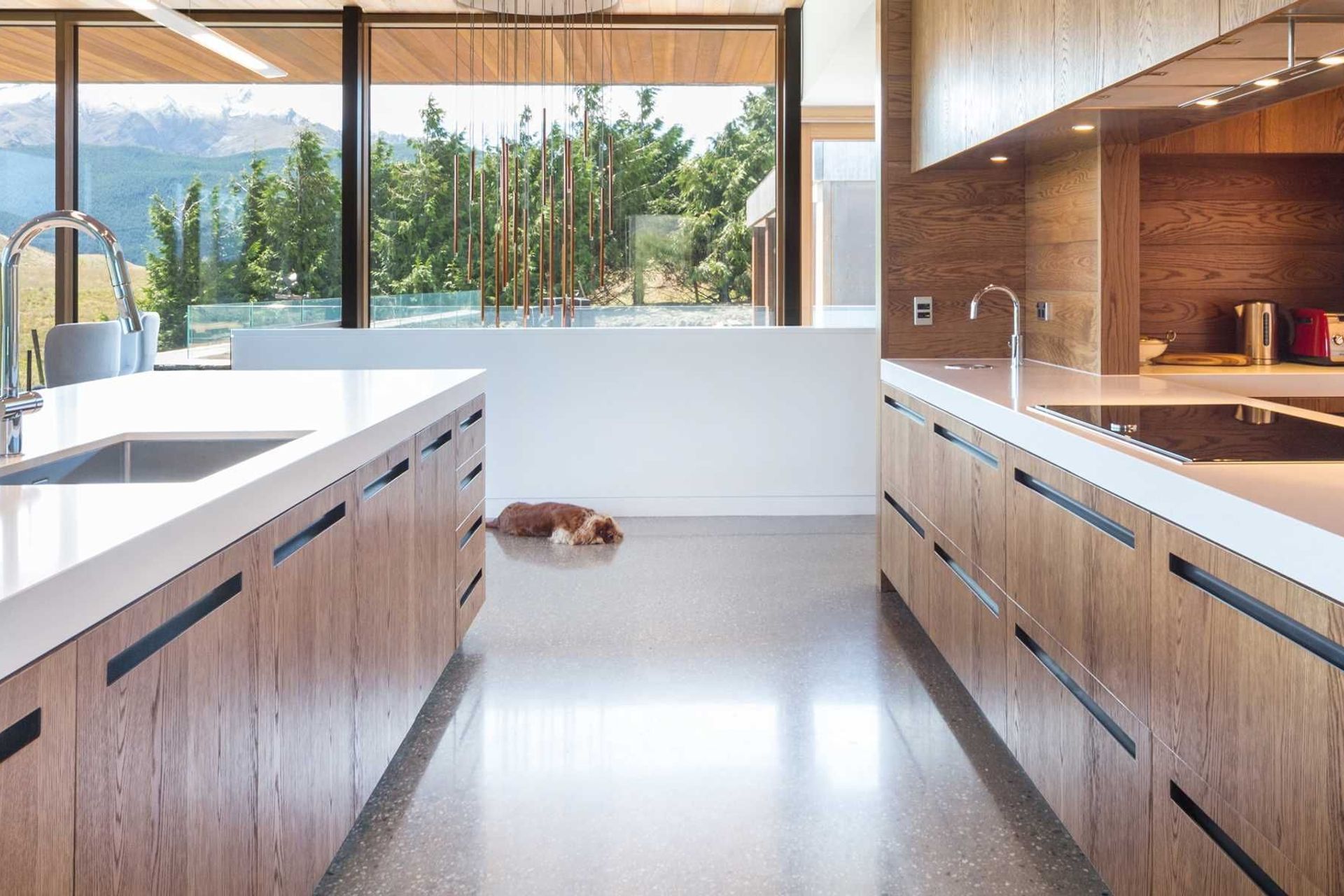 ArchiPro Project Summary - Stunning kitchen featuring planked American Oak Veneer from the Prime Art Veneer range, designed to enhance the textural beauty of real wood while providing breathtaking views of the surrounding mountains.