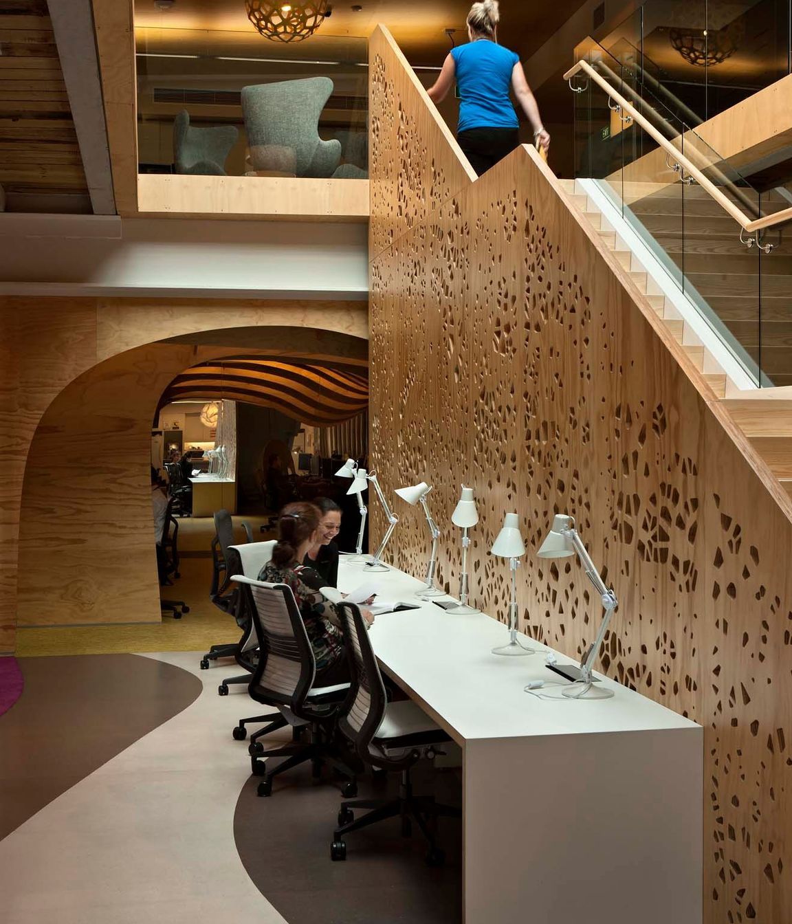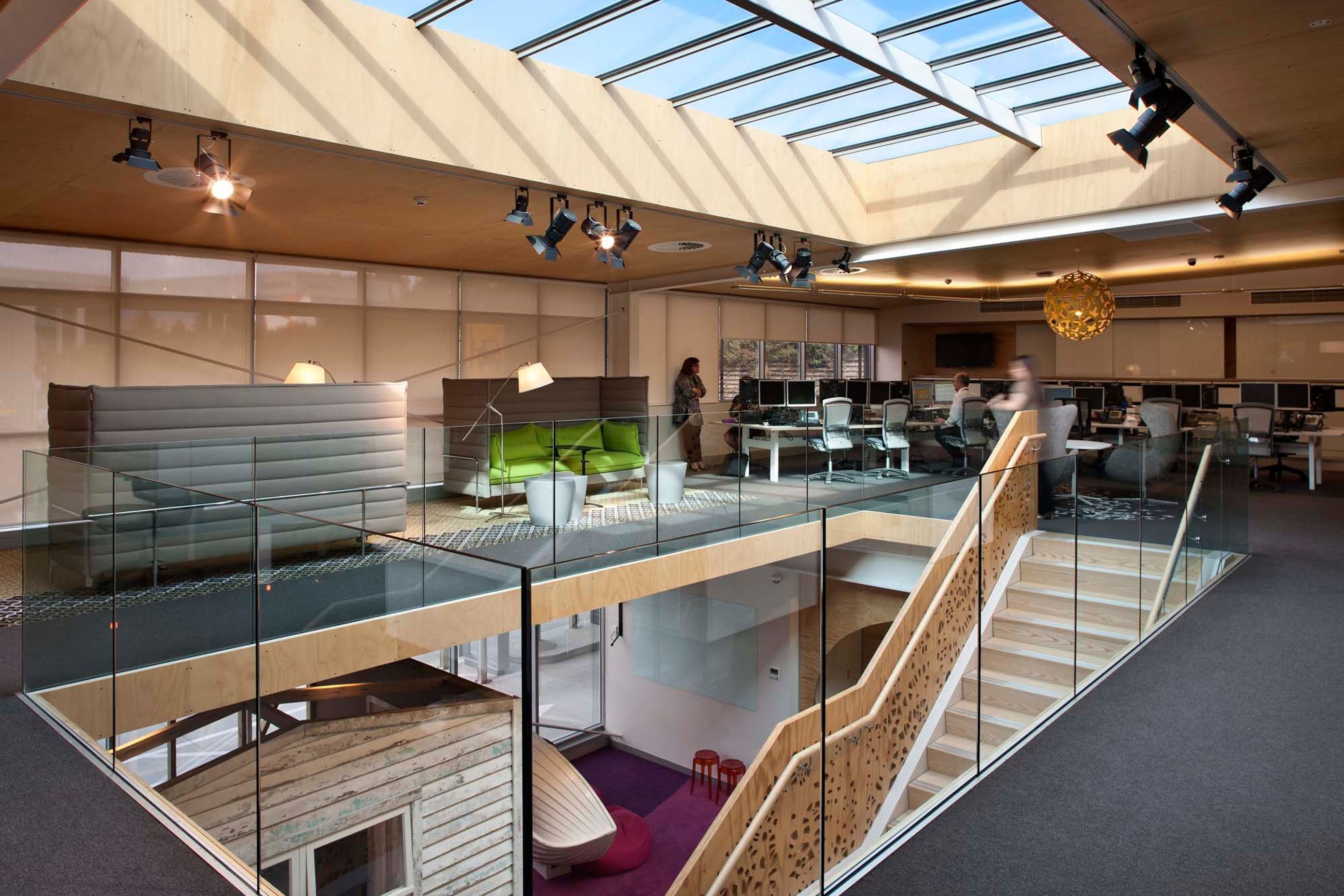 ArchiPro Project Summary - ASB Regional Office features a beach-themed design with 620m2 of office fitout across two levels, incorporating unique elements like a boatshed and cave, alongside high-spec electrical, mechanical, and audio-visual services, and premium finishes.