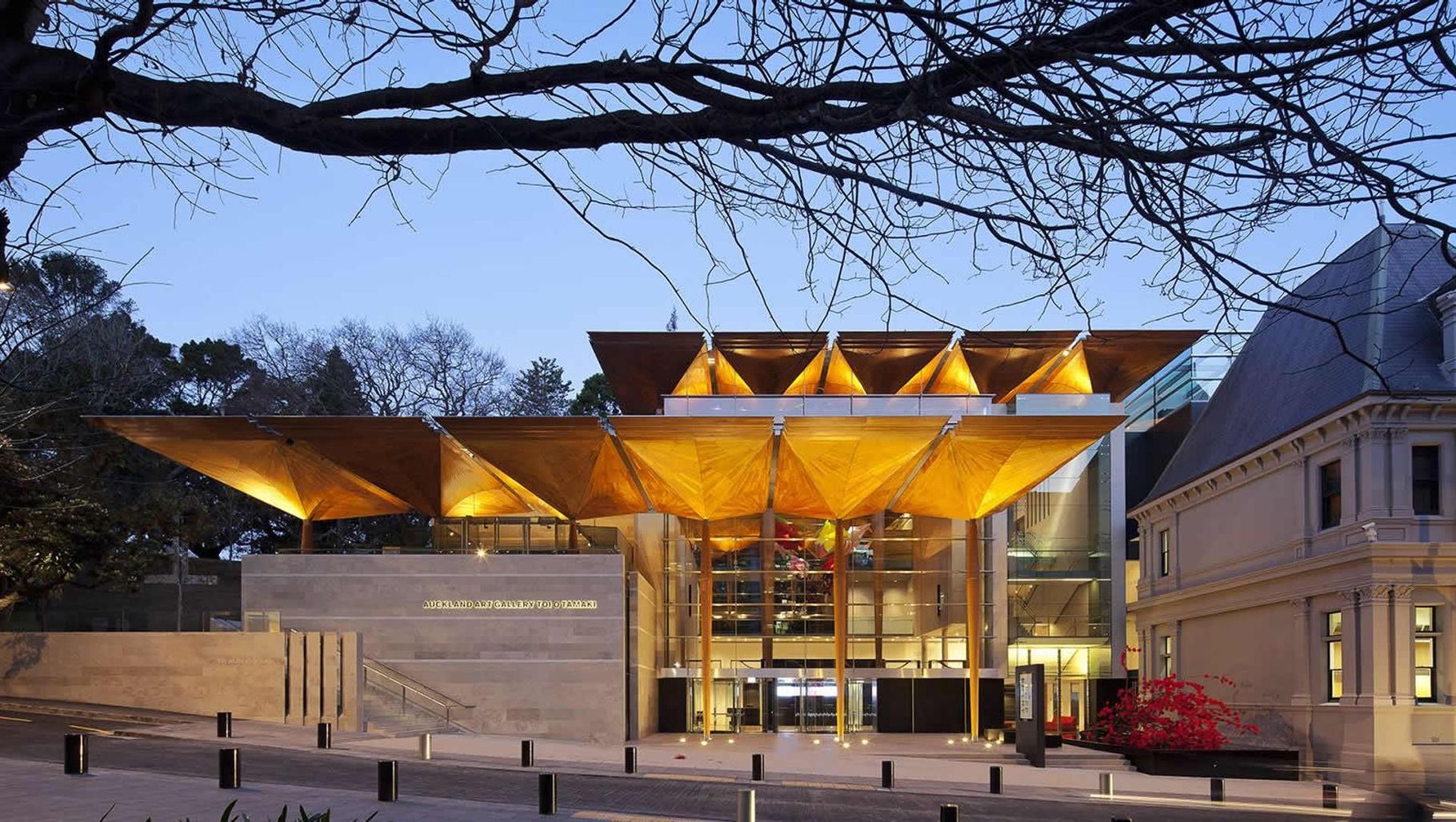 ArchiPro Project Summary - Auckland Art Gallery Toi o Tamaki features organic architectural canopies inspired by the natural landscape, harmoniously integrating with heritage structures while inviting public engagement with its transparent design and connection to Albert Park.