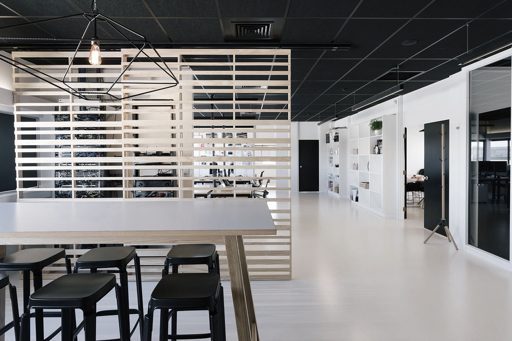 ArchiPro Project Summary - Redesign of Auckland City Toyota office featuring modern industrial aesthetics, open plan layout, and custom moveable timber screens to enhance collaboration and client engagement.