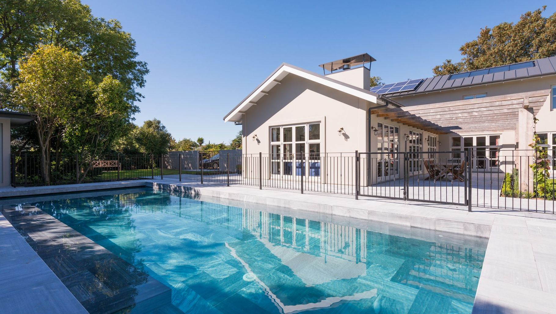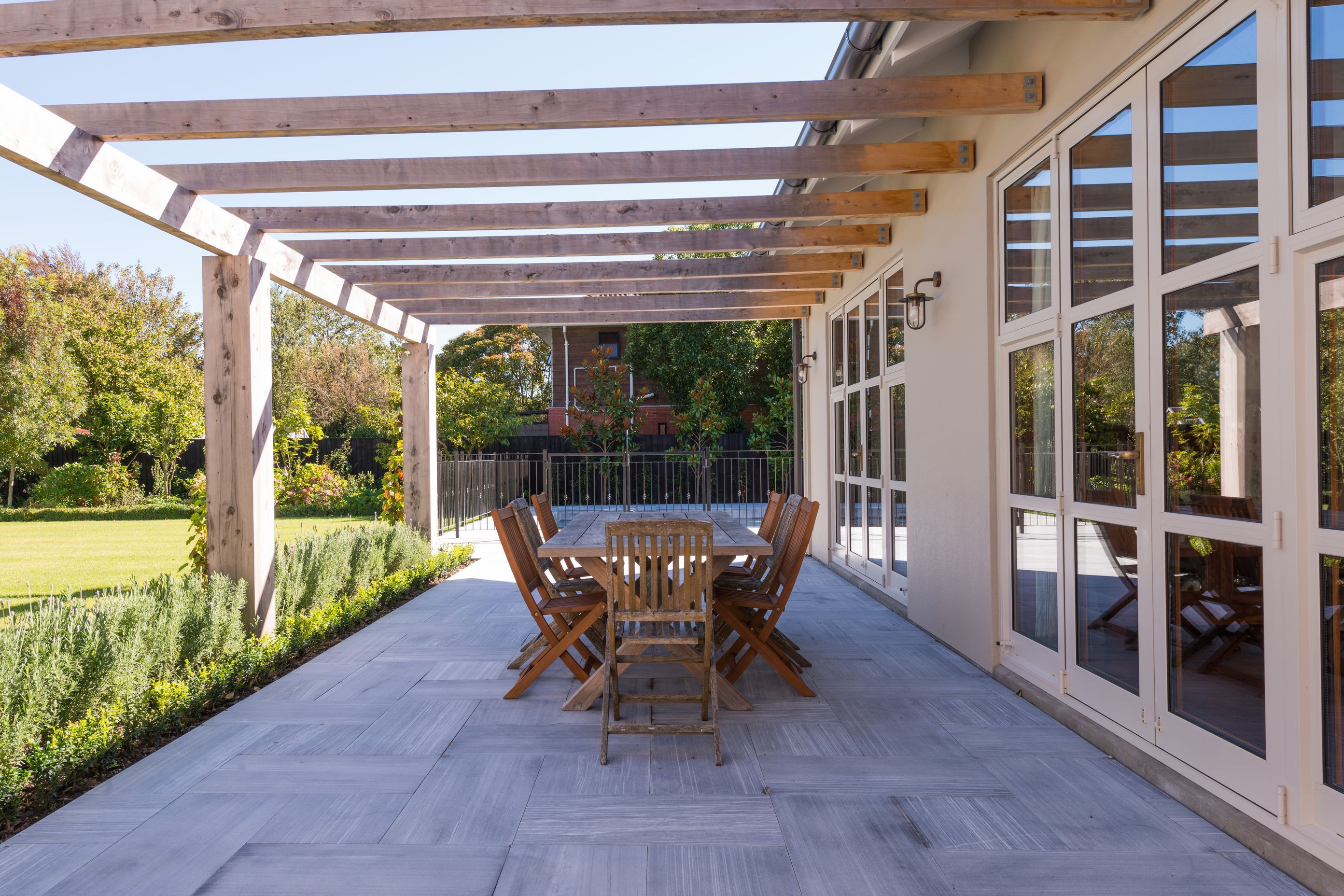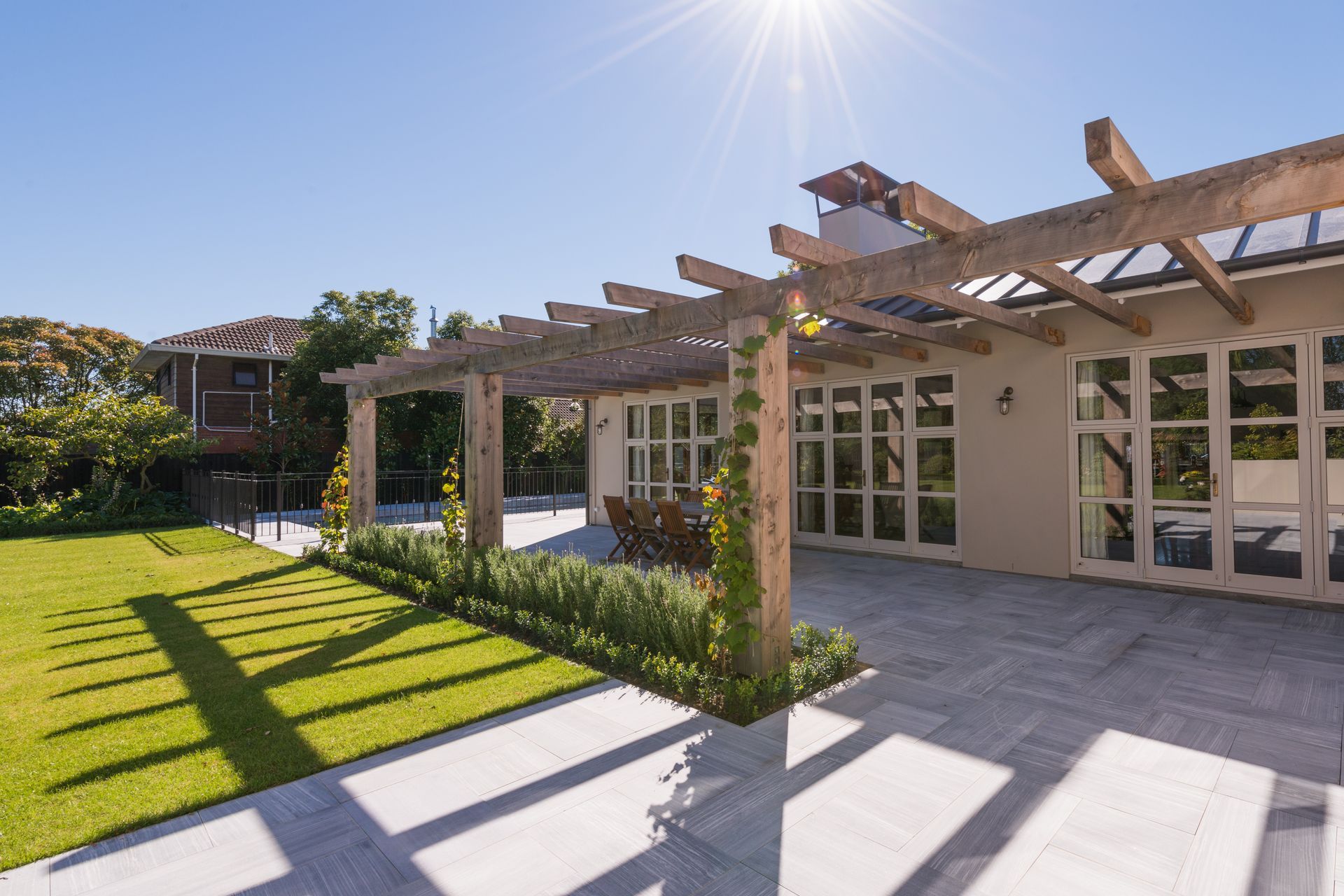 ArchiPro Project Summary - Expansive outdoor living space featuring oversized timber pergolas, custom wrought iron work, a large lawn for recreation, and a stunning swimming pool with Sri Lankan bluestone, all designed to enhance the home's architectural elegance and provide privacy.