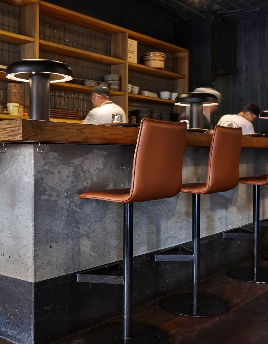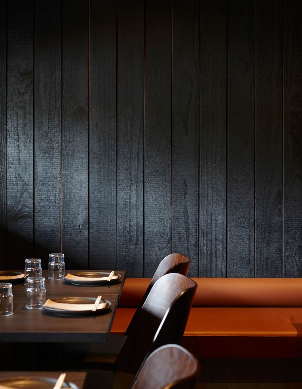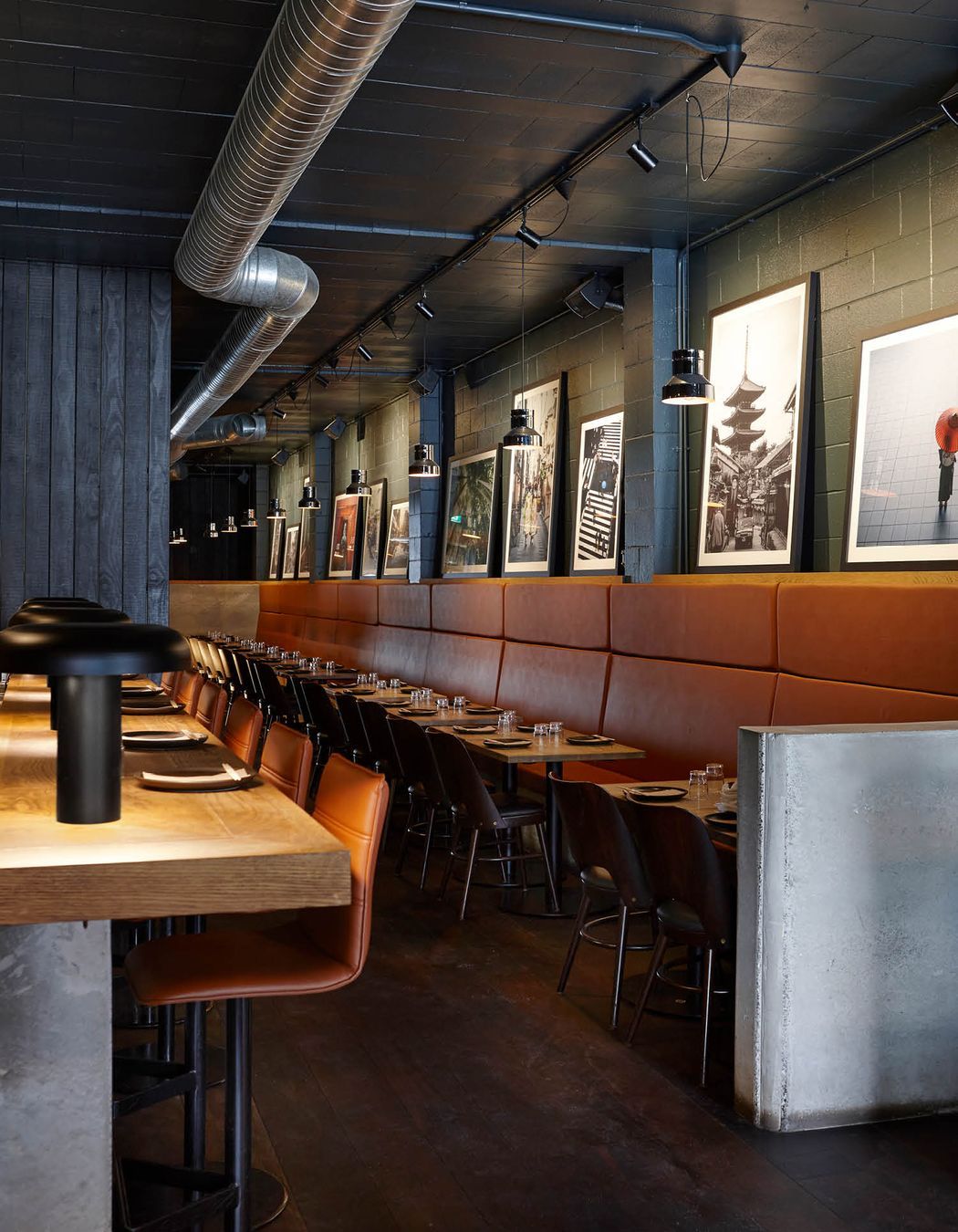 ArchiPro Project Summary - A vibrant transformation of the Britomart Ebisu Japanese restaurant featuring orange leather booths, a de-tuned blue entry, and elegant oak sushi and roji bar, creating a unique dining experience with a Peruvian twist in Grey Lynn, Auckland.