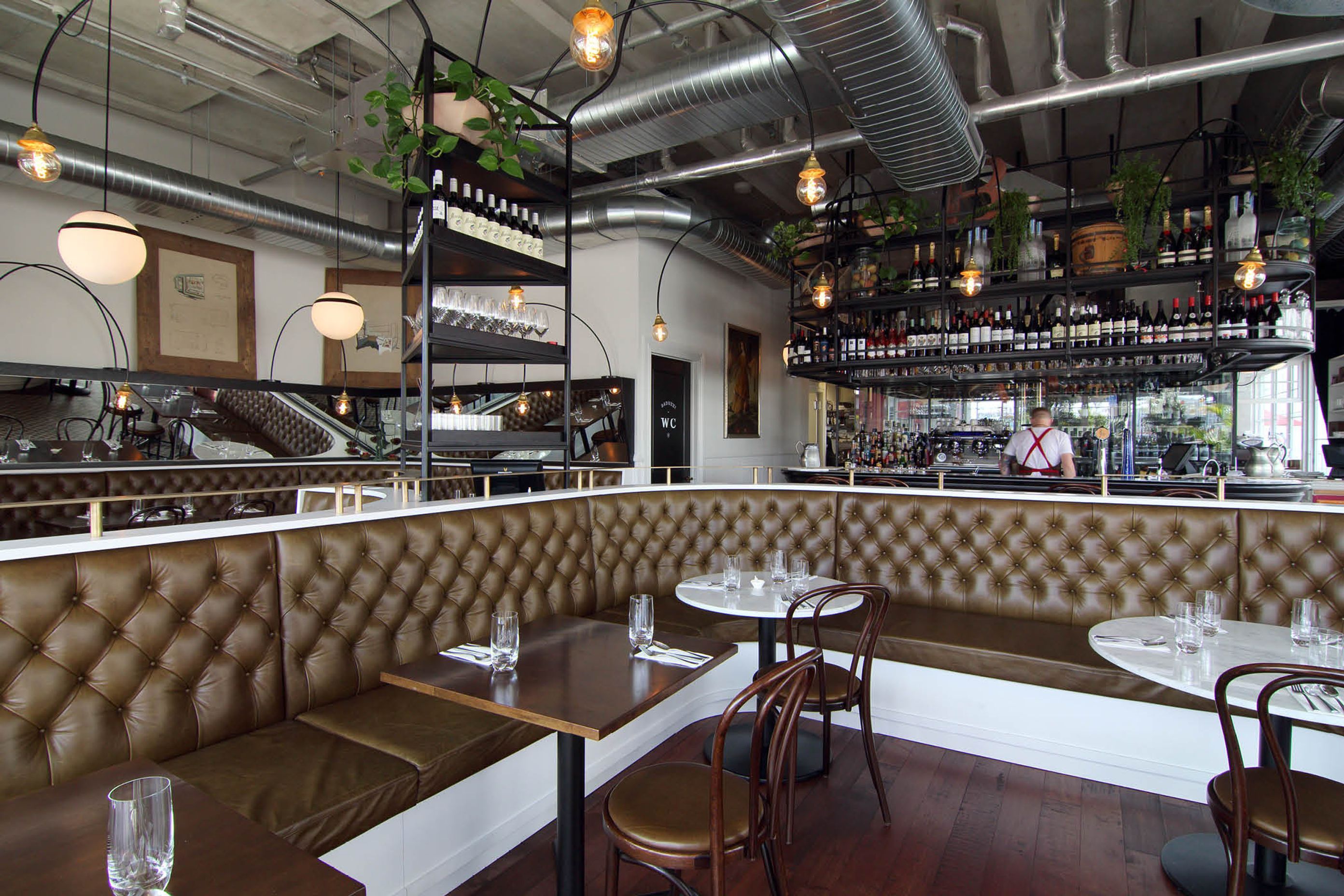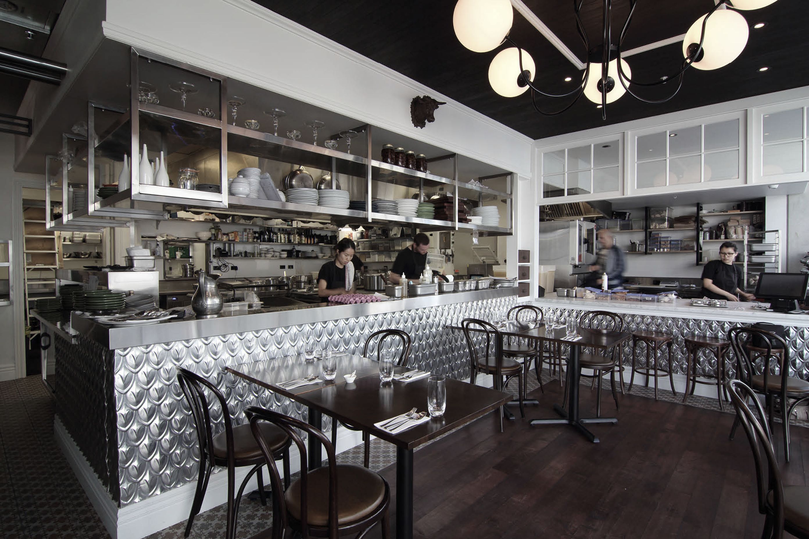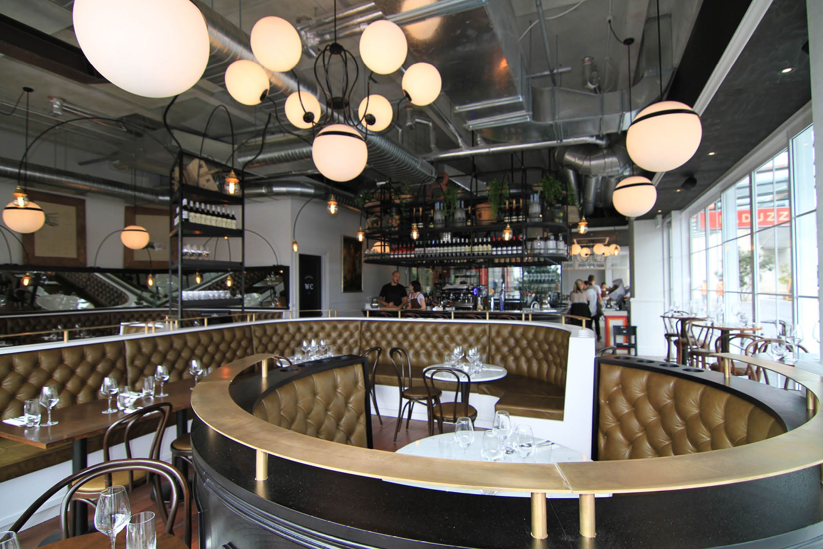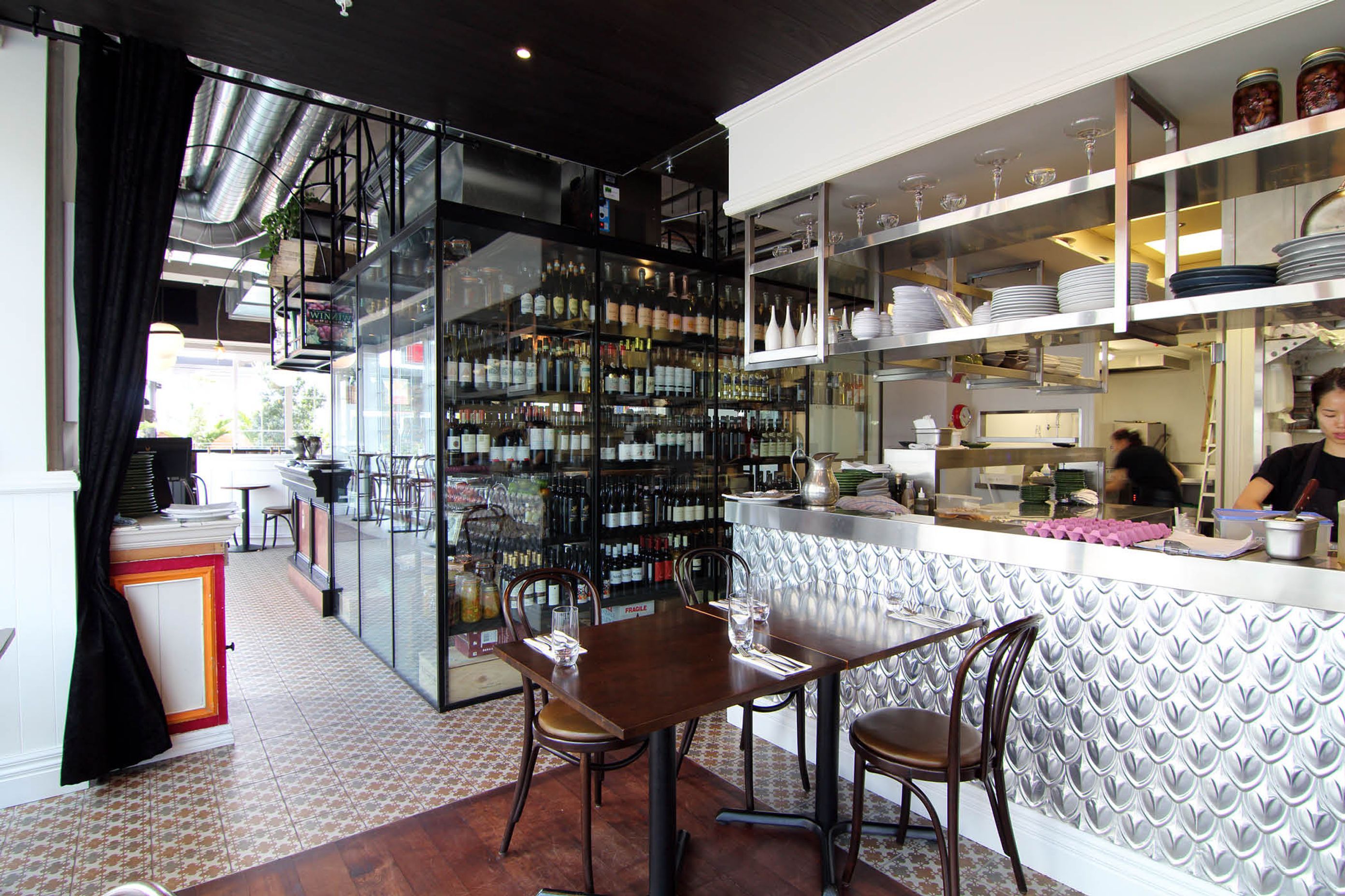 ArchiPro Project Summary - Baduzzi: A vibrant dining experience celebrating food and beverage in a relaxed atmosphere, featuring an open kitchen, glass walk-in cold room, BBQ and bar, and bespoke green booths, located at 10-26 Fish Lane, Auckland.