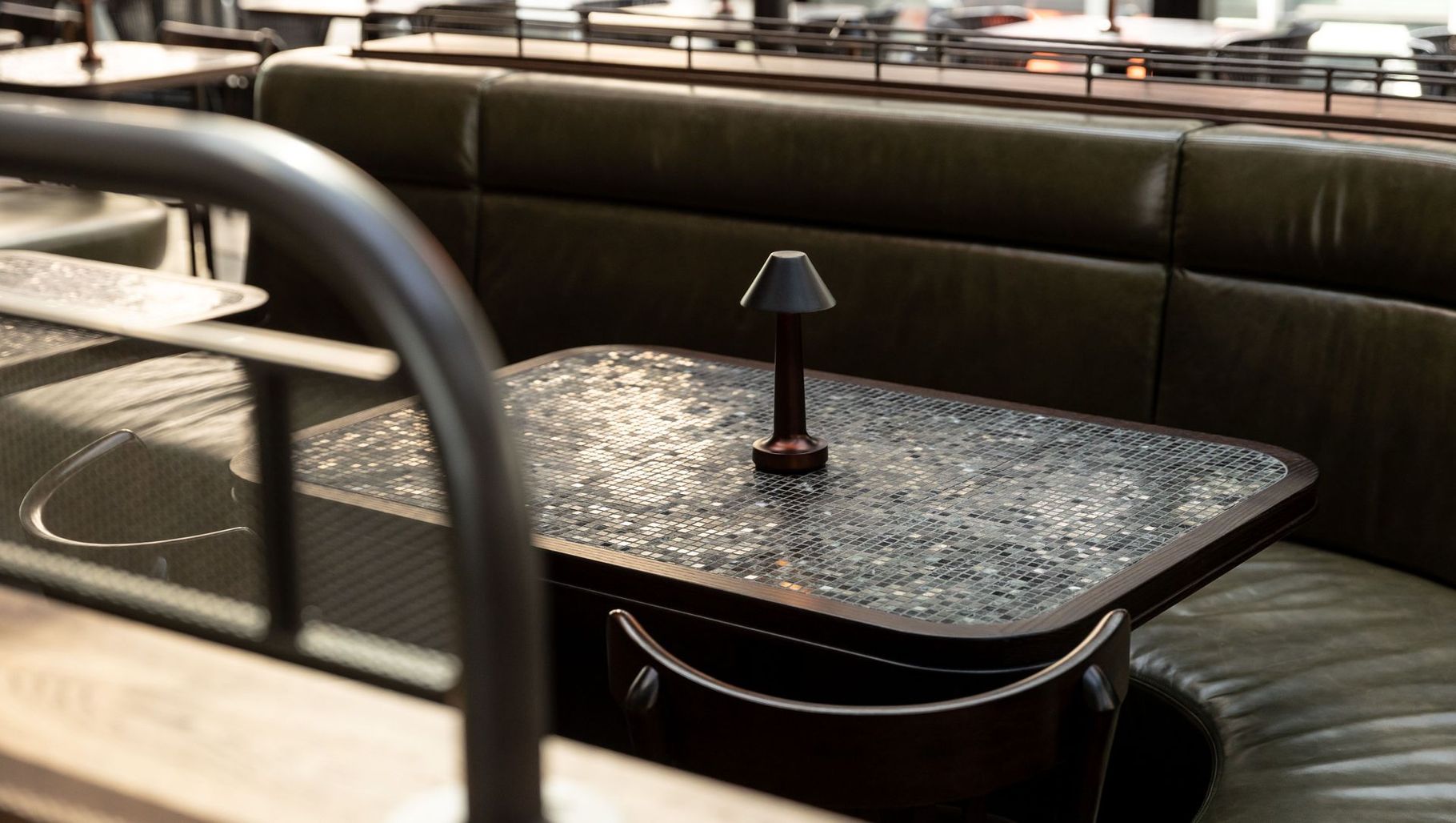 ArchiPro Project Summary - Bar Non Solo brings the beloved charm of Non Solo Pizza to the inner city, featuring a spacious and welcoming atmosphere with varied table sizes, leather banquettes, and a rich olive-tinted palette, perfect for couples and groups alike.