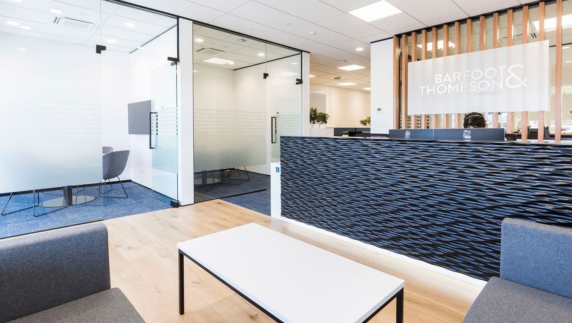 ArchiPro Project Summary - A modern office fit-out for Barfoot & Thompson in Mangere East, featuring elegant flooring, stylish furniture, and innovative lighting solutions.