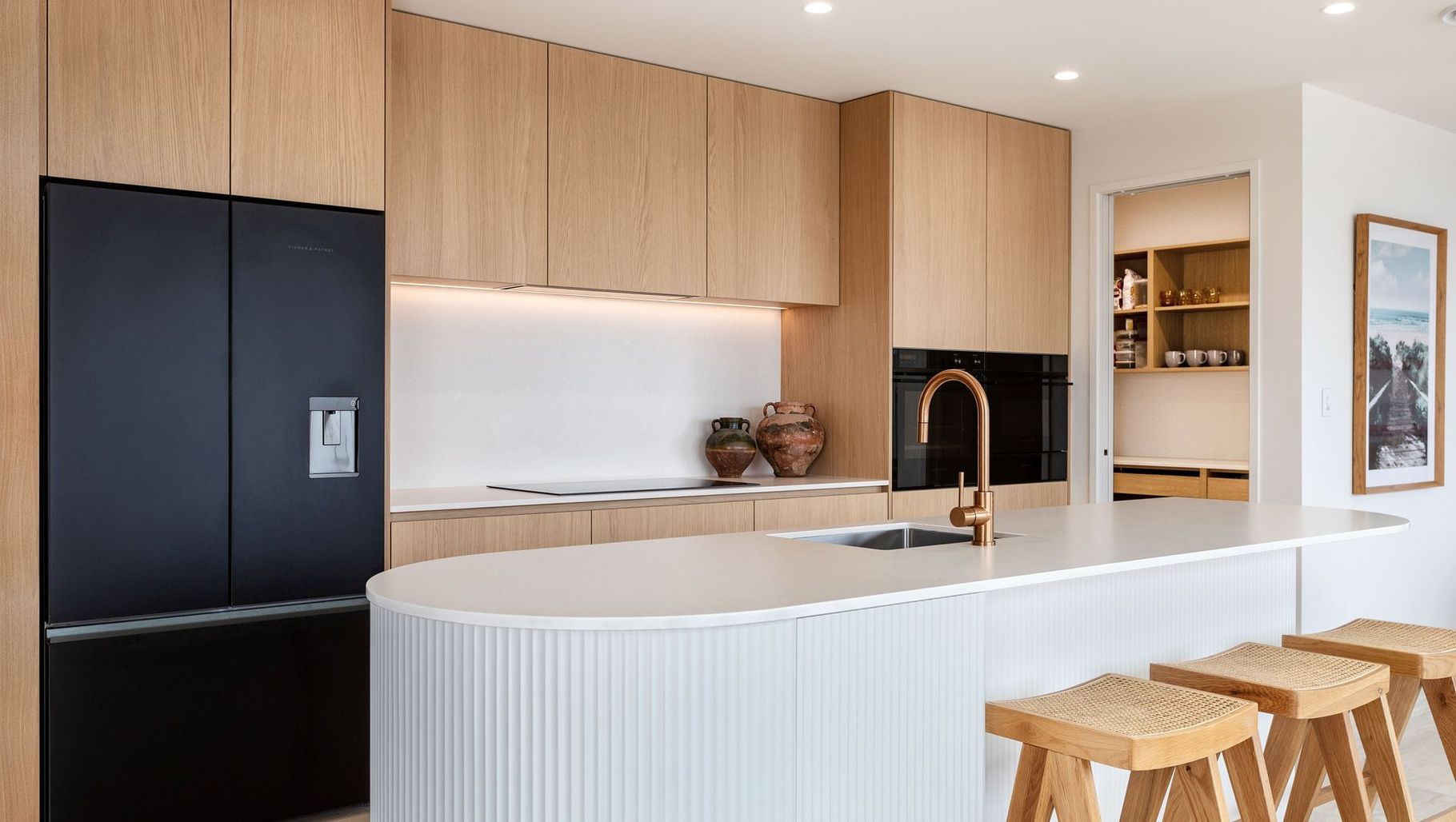 ArchiPro Project Summary - The Bariball project showcases a white, curved counter crafted from Paintable MDF Techno Veneer, enhancing the kitchen's calm ambiance with its sophisticated Wave Techno Veneer texture, recessed lighting, and warm oak tones for a welcoming and functional design.