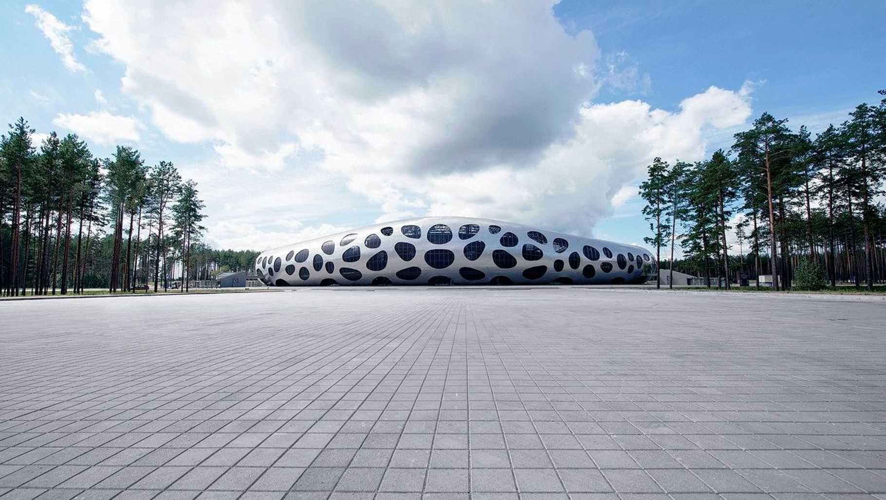 ArchiPro Project Summary - The Bate Borisov Arena features a striking dome-shaped design with AluNatur Bright Brushed aluminum cladding, complemented by blob-shaped windows, creating an impression of a delicate, stretched textile over the stadium's structure, designed by OFIS Architects.