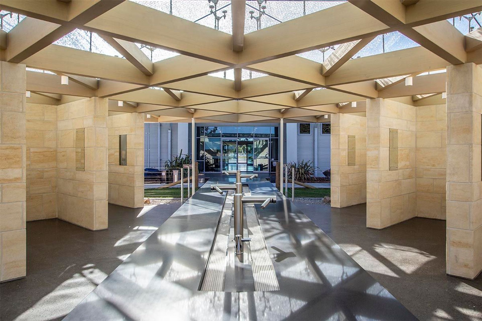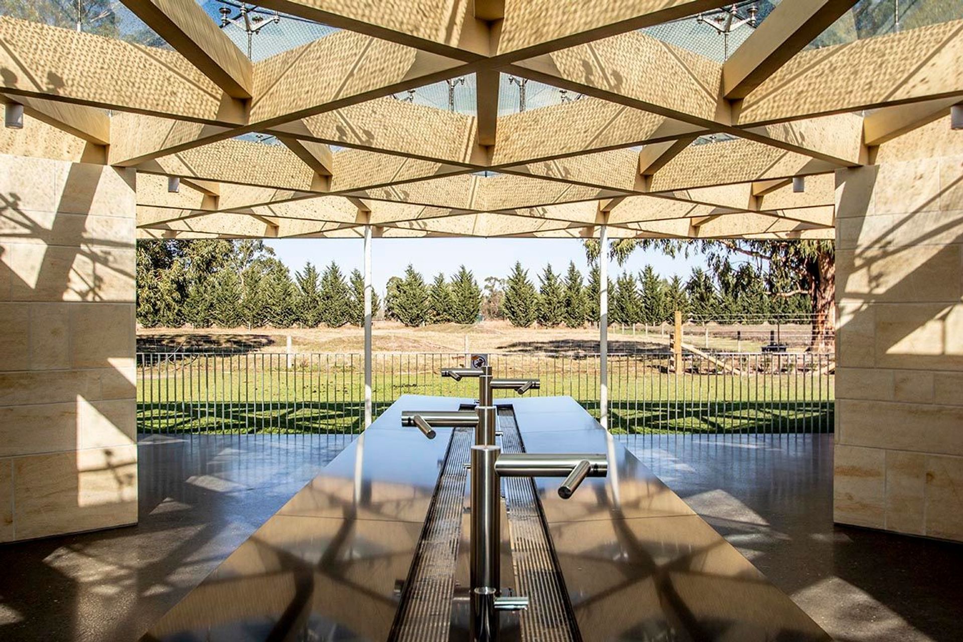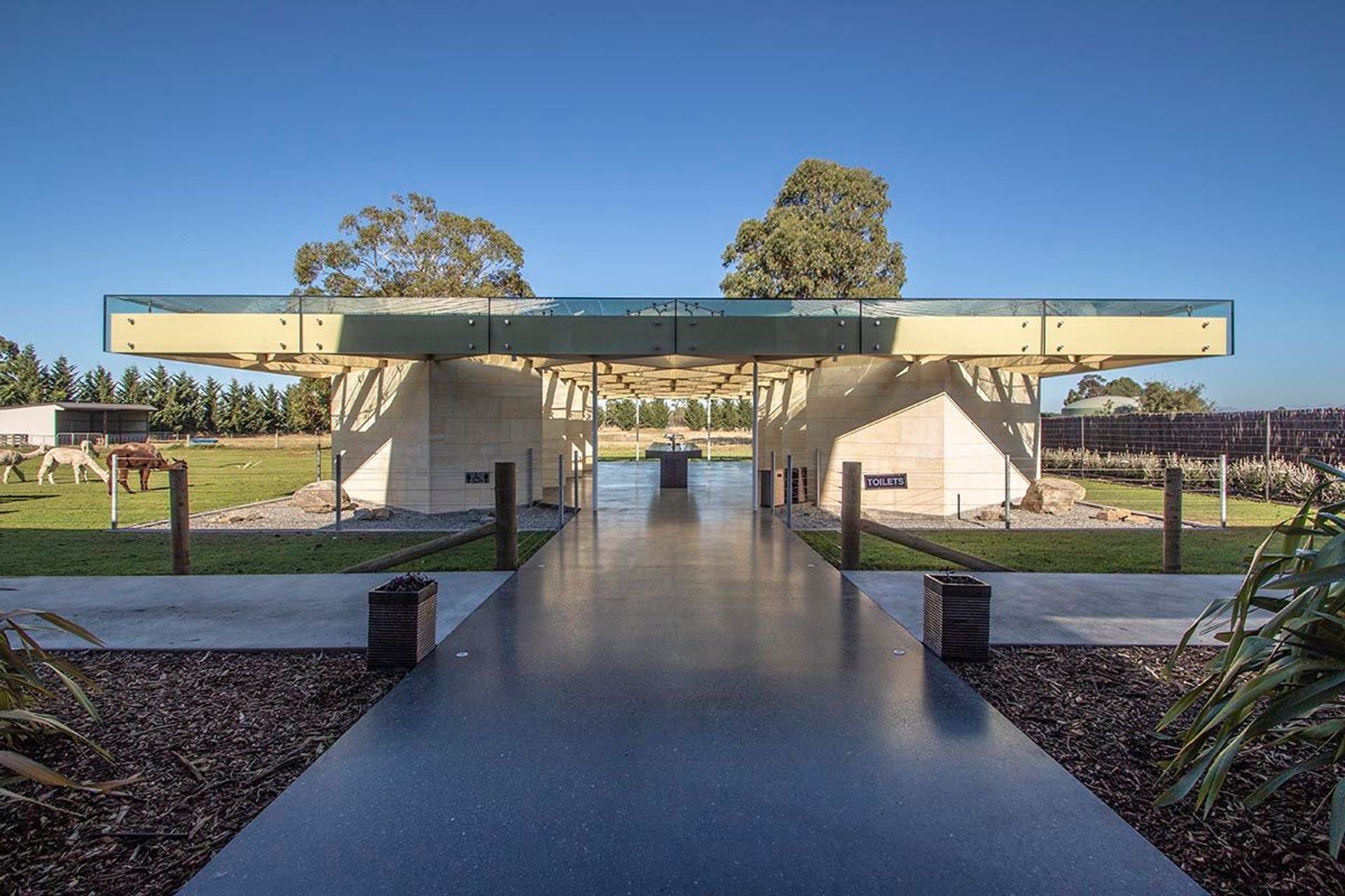 ArchiPro Project Summary - A modern bathroom pavilion designed to enhance visitor experience at Farmers’ Corner, featuring private cubicles with stunning views and a unique open-air breezeway, completed in 2019.