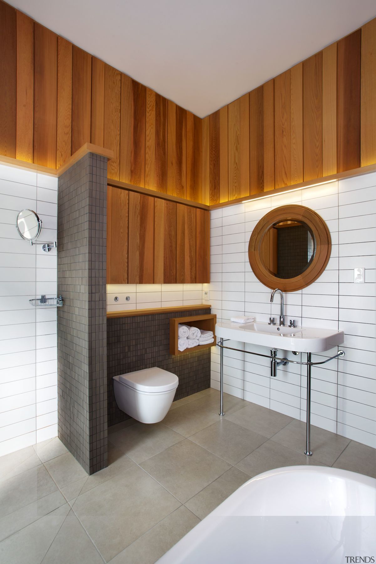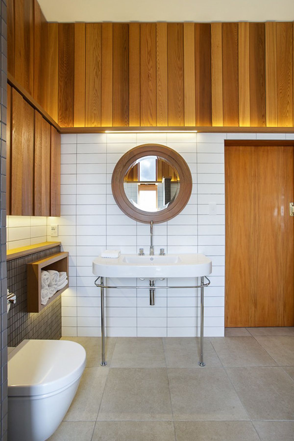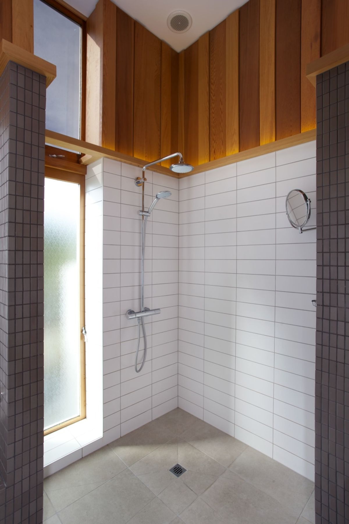 ArchiPro Project Summary - Thoughtfully renovated family bathroom in a 1920s bungalow, blending Art Deco heritage with contemporary design, featuring oiled western red cedar, fresh white tiles, and enhanced natural light through a tall window.