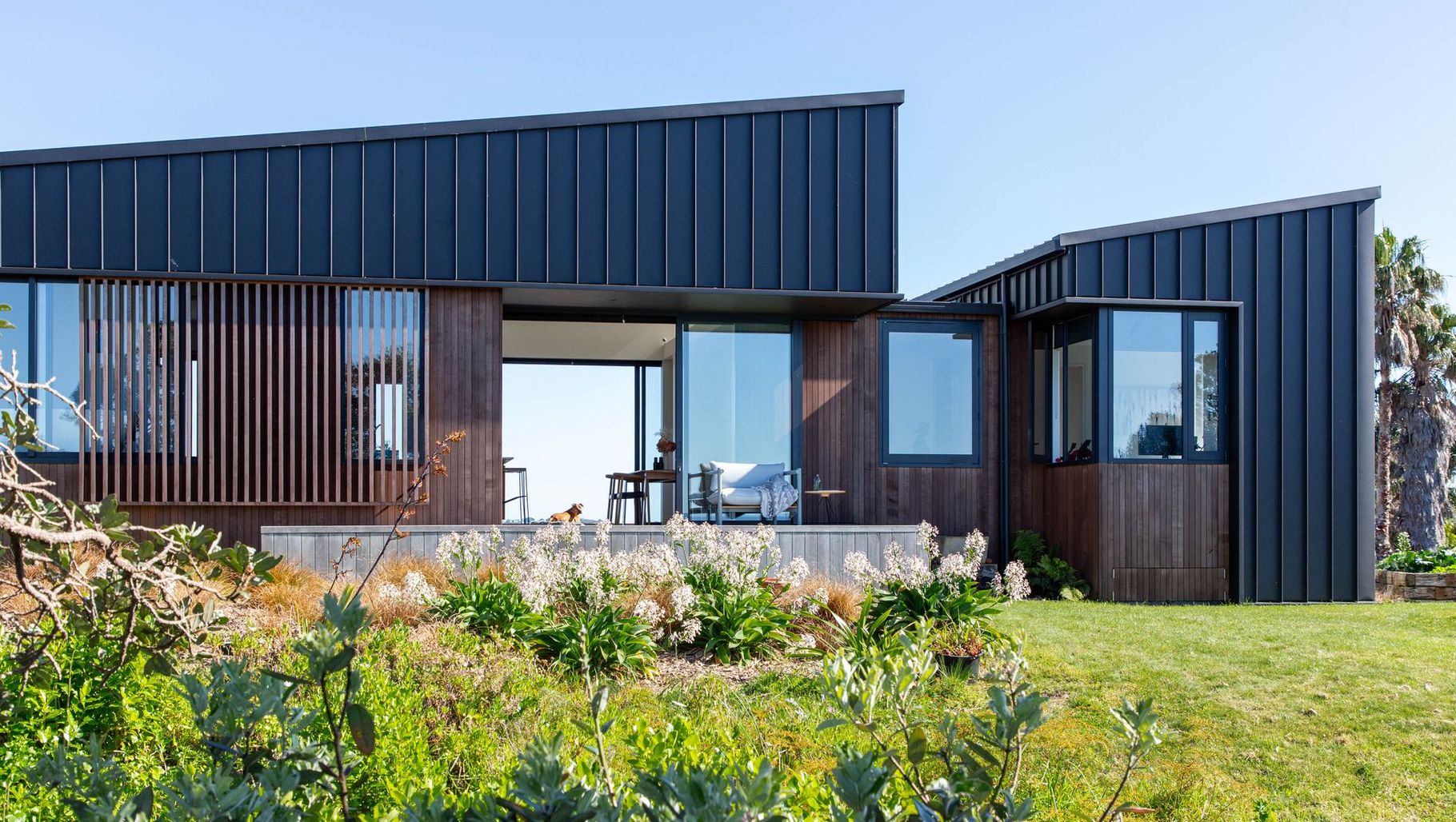 Located on a Waiheke Island ridgeline, this home benefits from wide elevated coastal views to both the north and to the south, making it an ideal setting for a couple and their dog, Baxter.