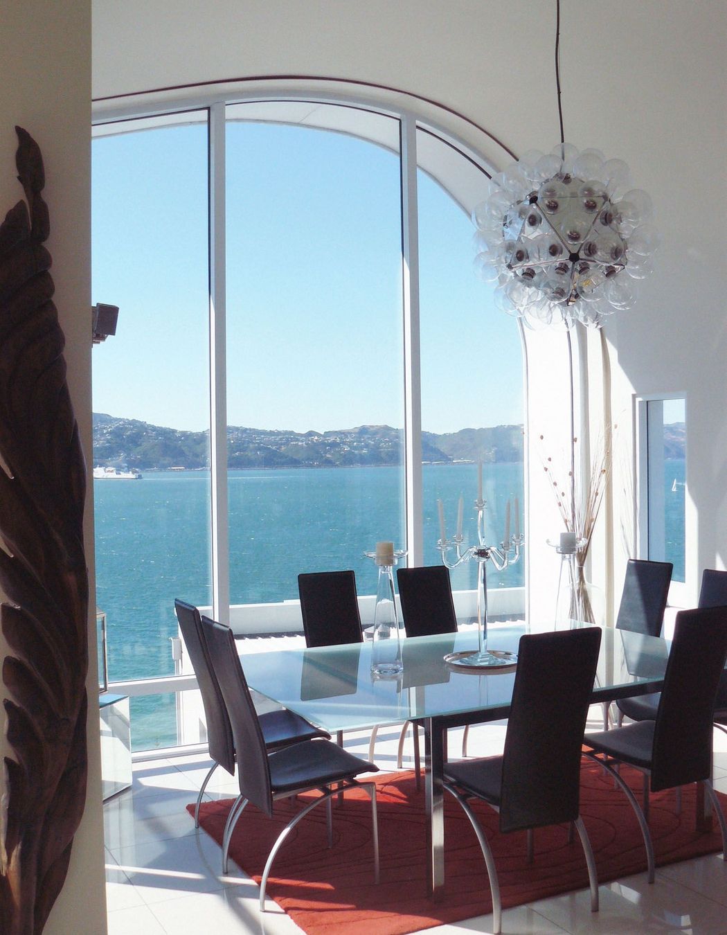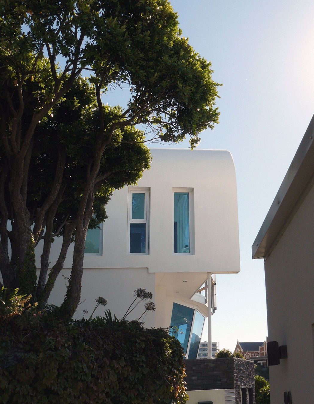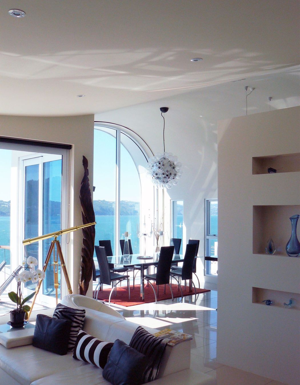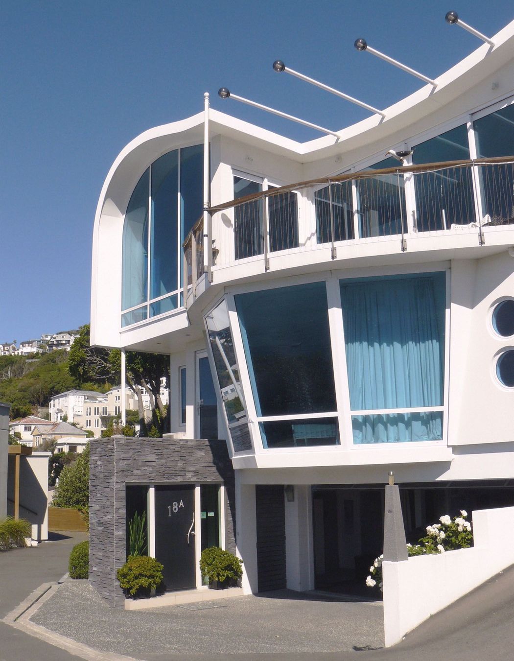 ArchiPro Project Summary - Exceptional coastal residence overlooking Wellington's Oriental Bay, featuring innovative design, passive solar orientation, and stunning views from expansive living spaces and a dramatic wave form roof.