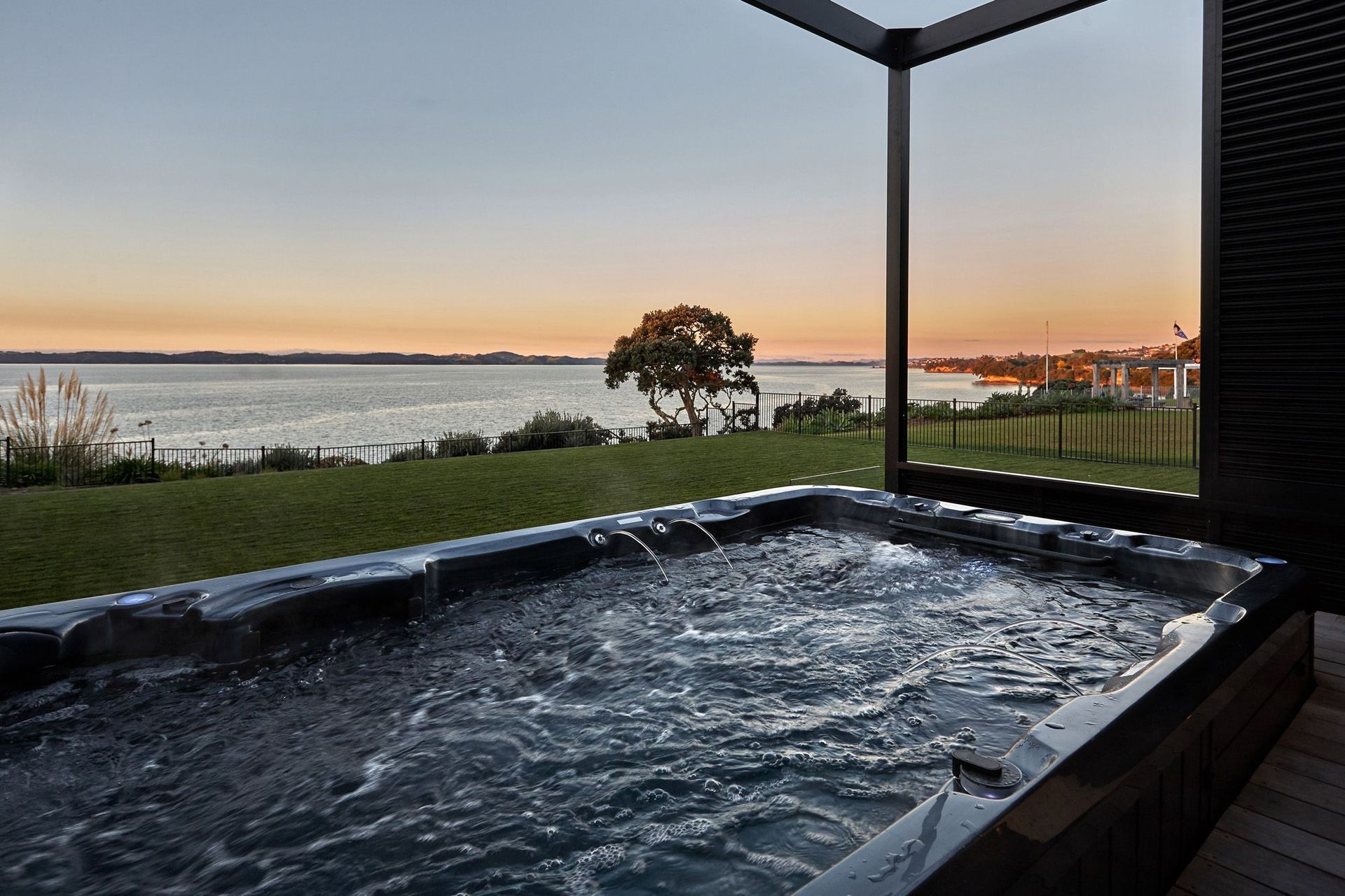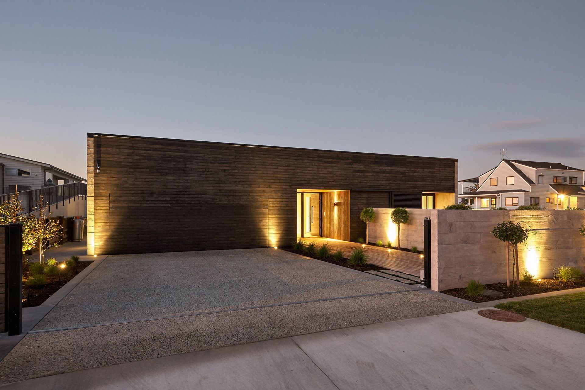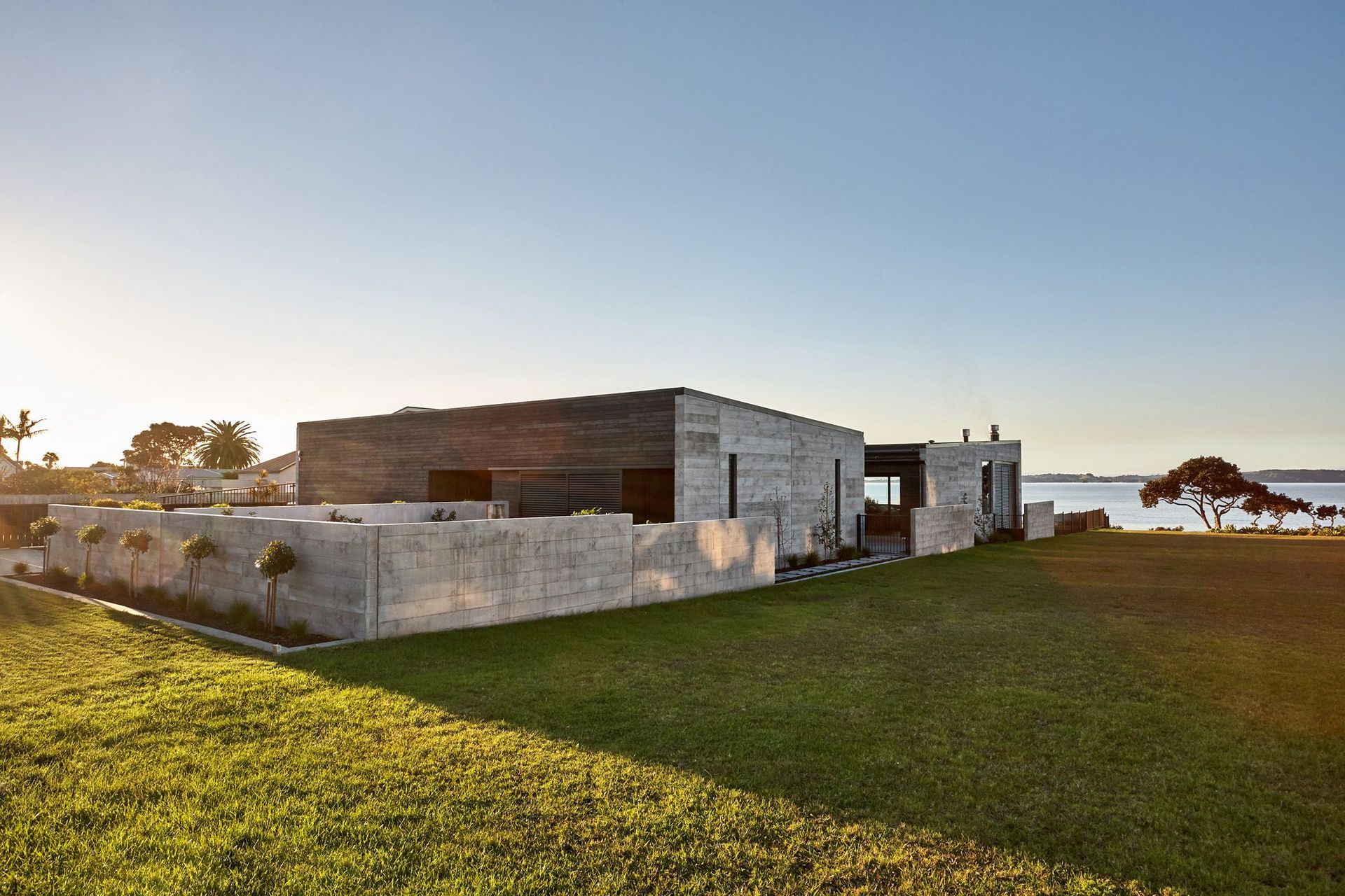 ArchiPro Project Summary - Elegant home in Beachlands, Auckland featuring breathtaking views, smart outdoor spaces, and a harmonious blend of materials including glass, concrete-tilt panels, and Accoya timber cladding.