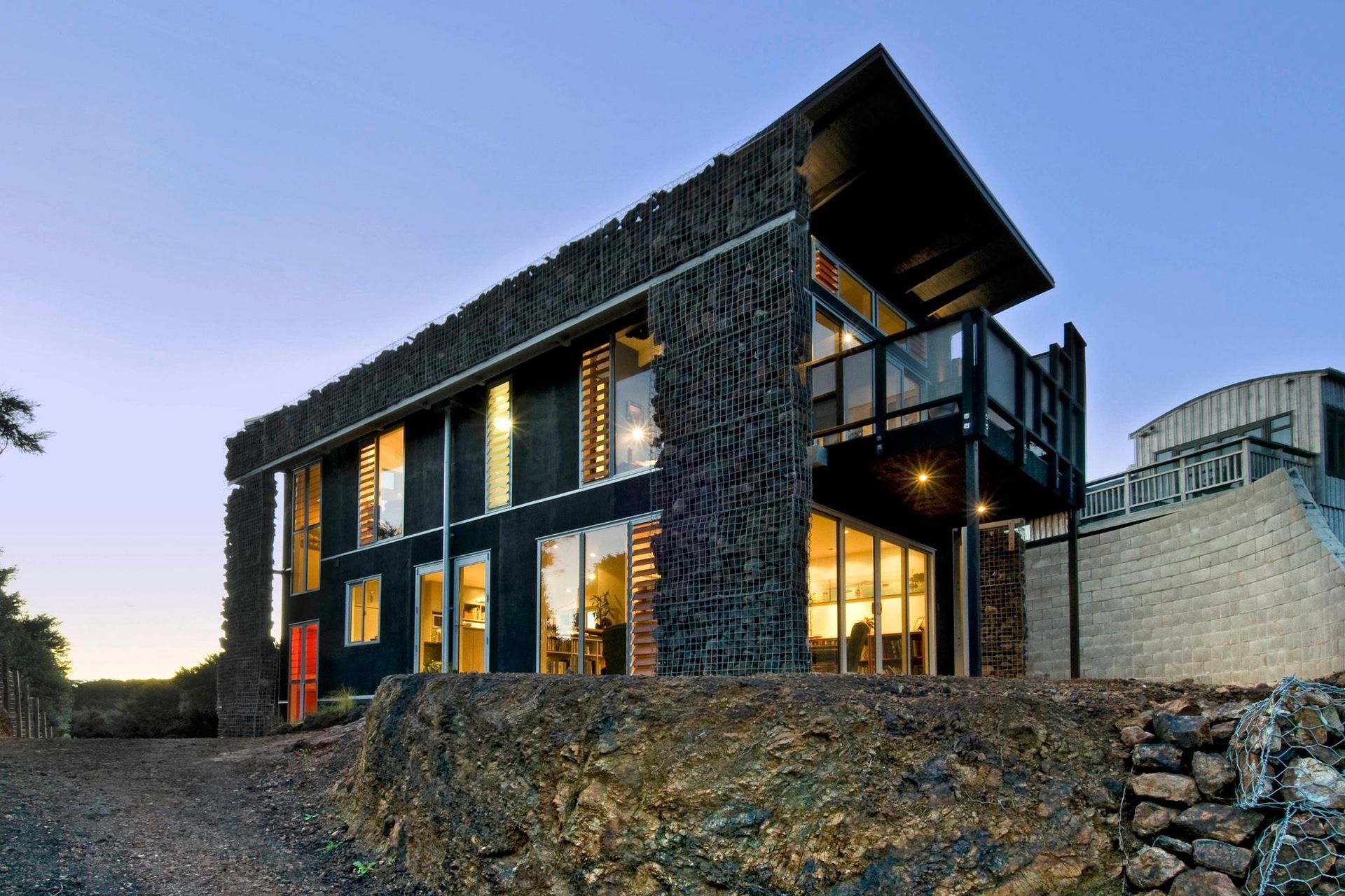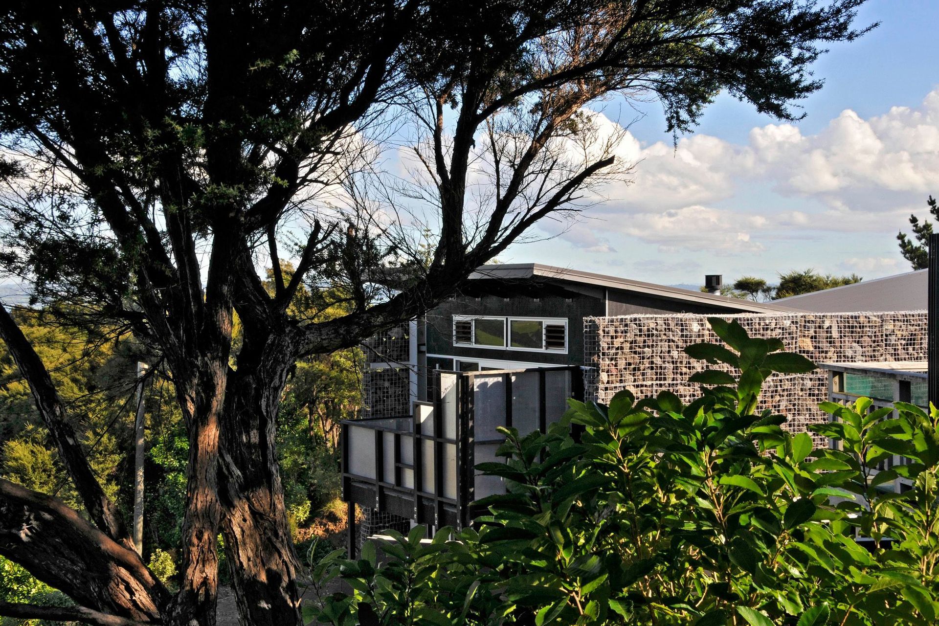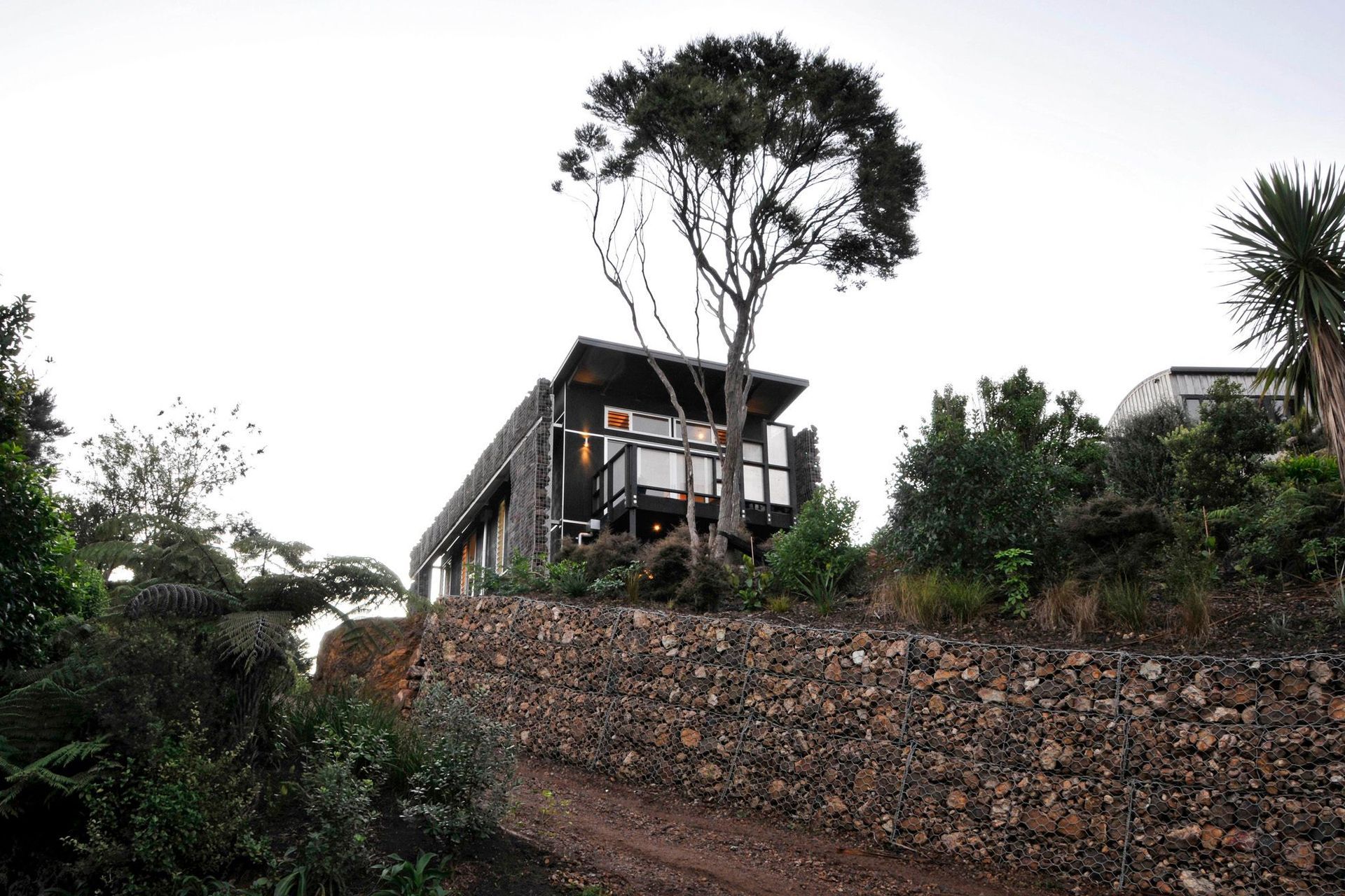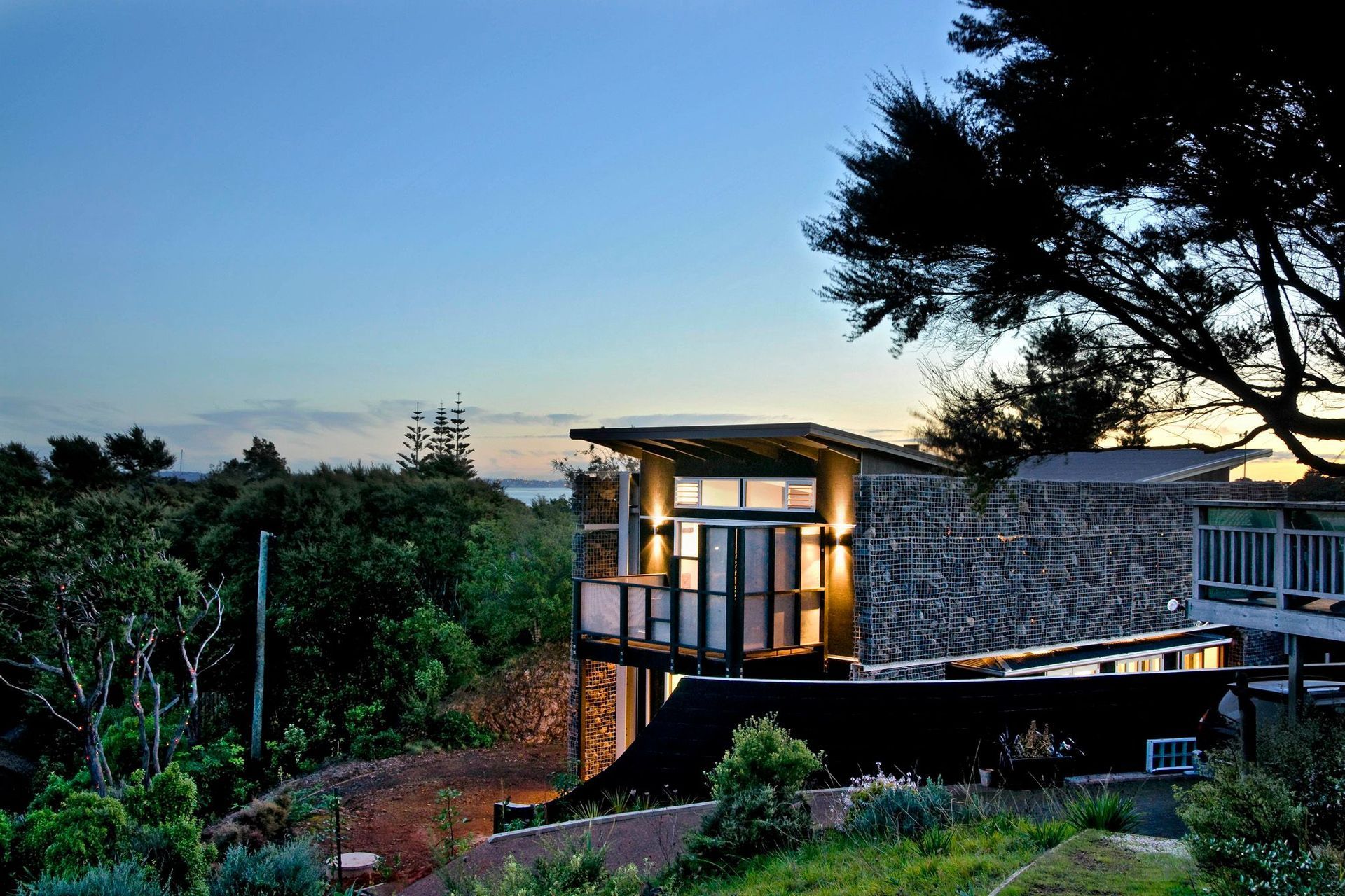 ArchiPro Project Summary - Contemporary 2-bedroom home at Rocky Bay featuring dual structures connected by a bridge, winged roof forms for natural light, and elegant gabion rock cage frames that enhance views and create a unique interior ambiance.