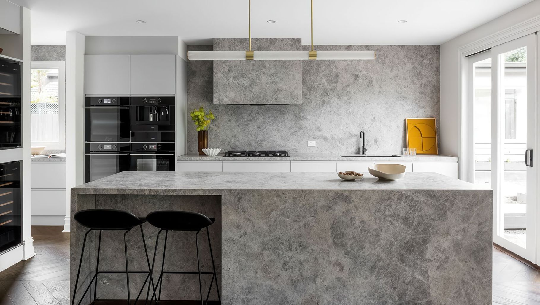 Accents such as Meir Australia matte black tapware and Lavello Sinks contribute to the sophisticated contrast, reinforcing the modern yet timeless aesthetic. The bold Beacon Lighting pendant above the island further elevates the space, merging form and function in perfect harmony.