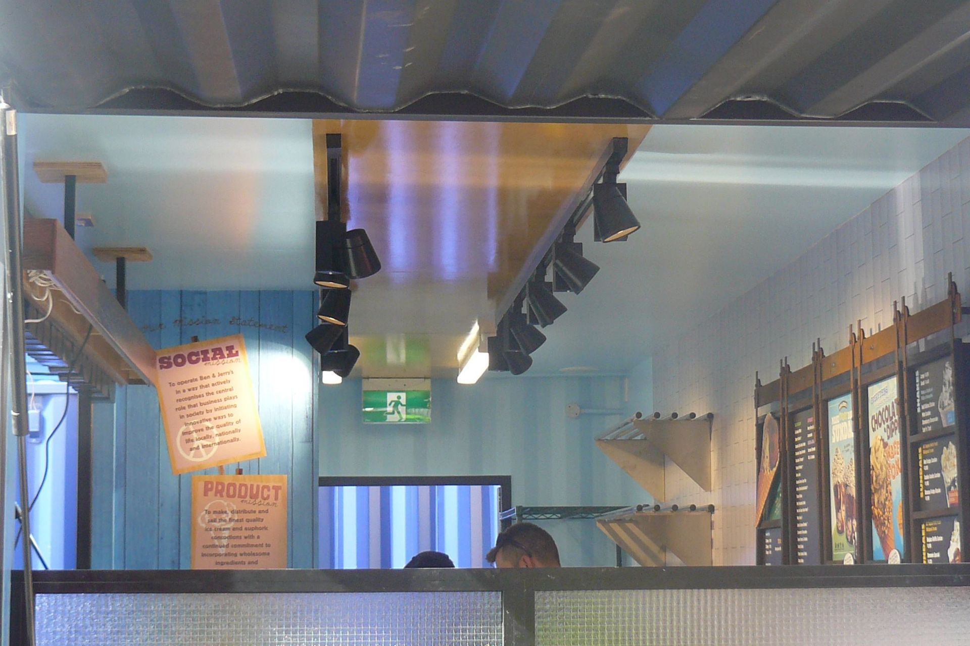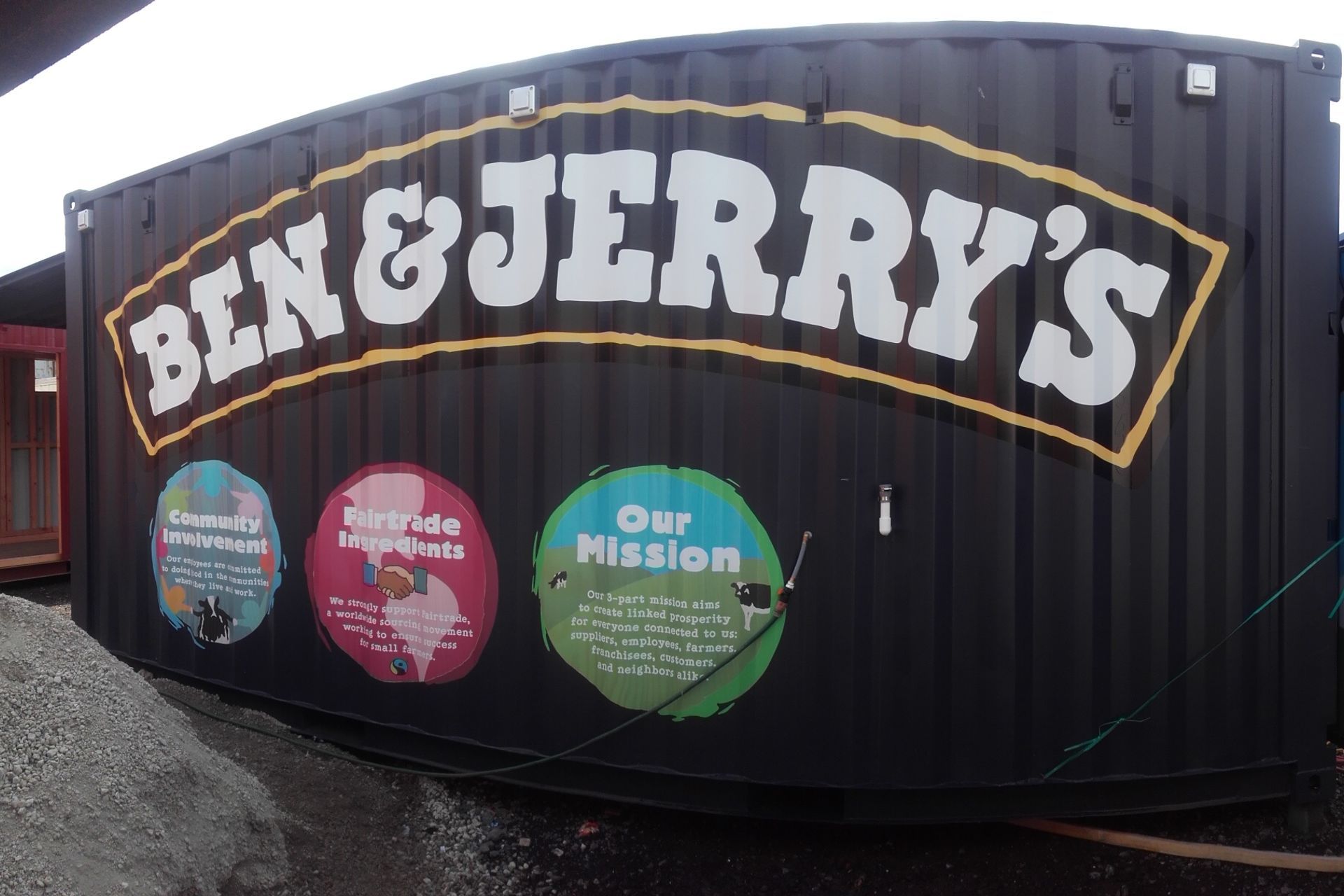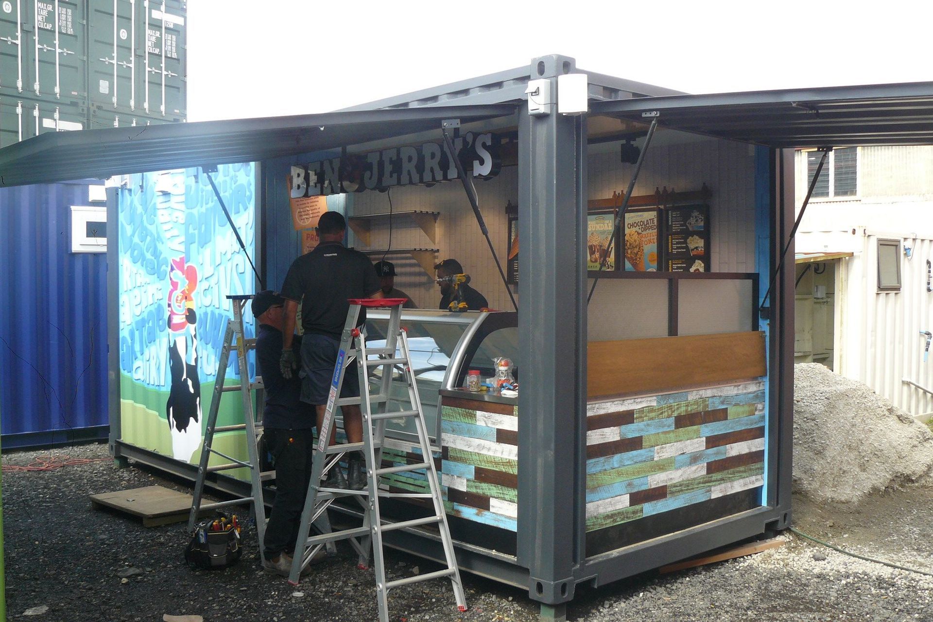 ArchiPro Project Summary - Transportable scoop shop for Ben & Jerry's, designed and constructed by IQ Container Homes, featuring fold-up sides, roll-out display, and custom cabinetry for a unique mobile ice cream experience.