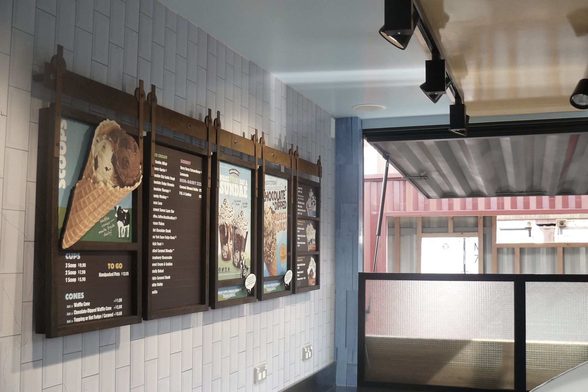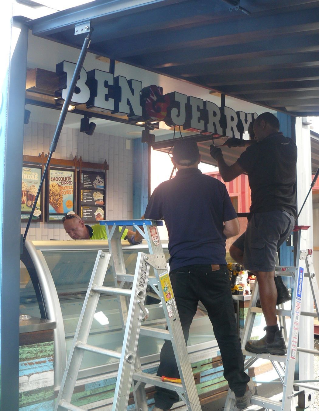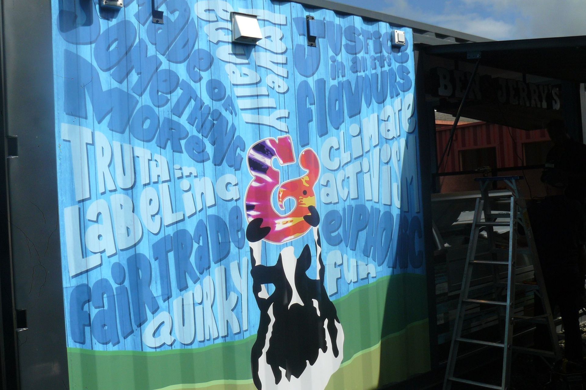ArchiPro Project Summary - Transportable scoop shop for Ben & Jerry's, designed and constructed by IQ Container Homes, featuring fold-up sides, roll-out display, and custom cabinetry for a unique mobile ice cream experience.