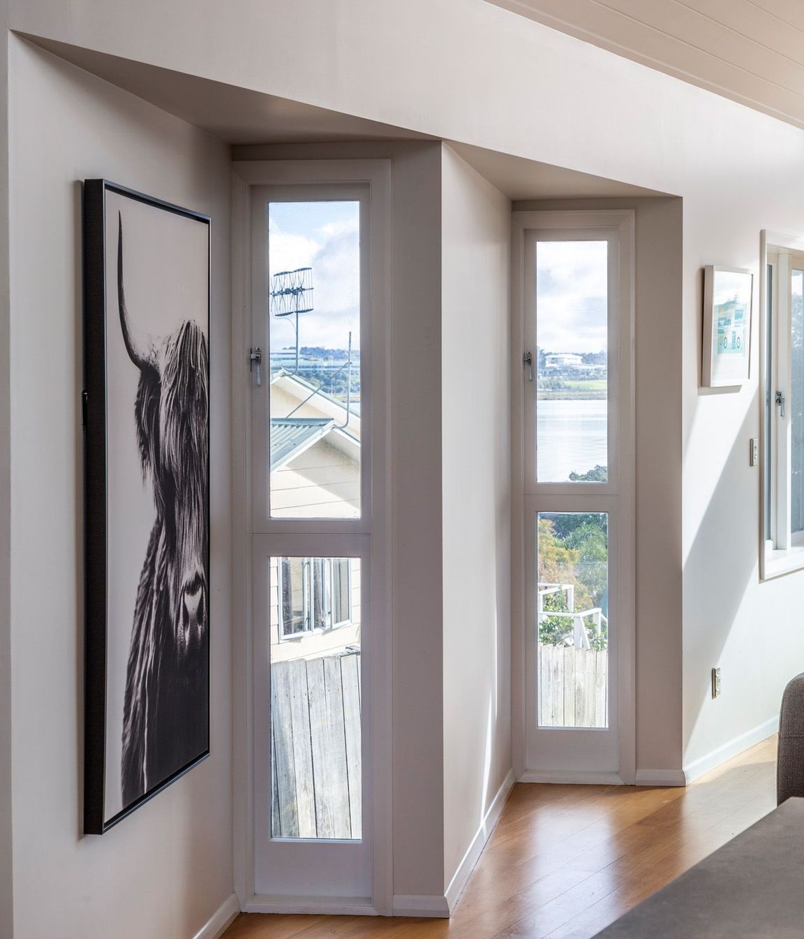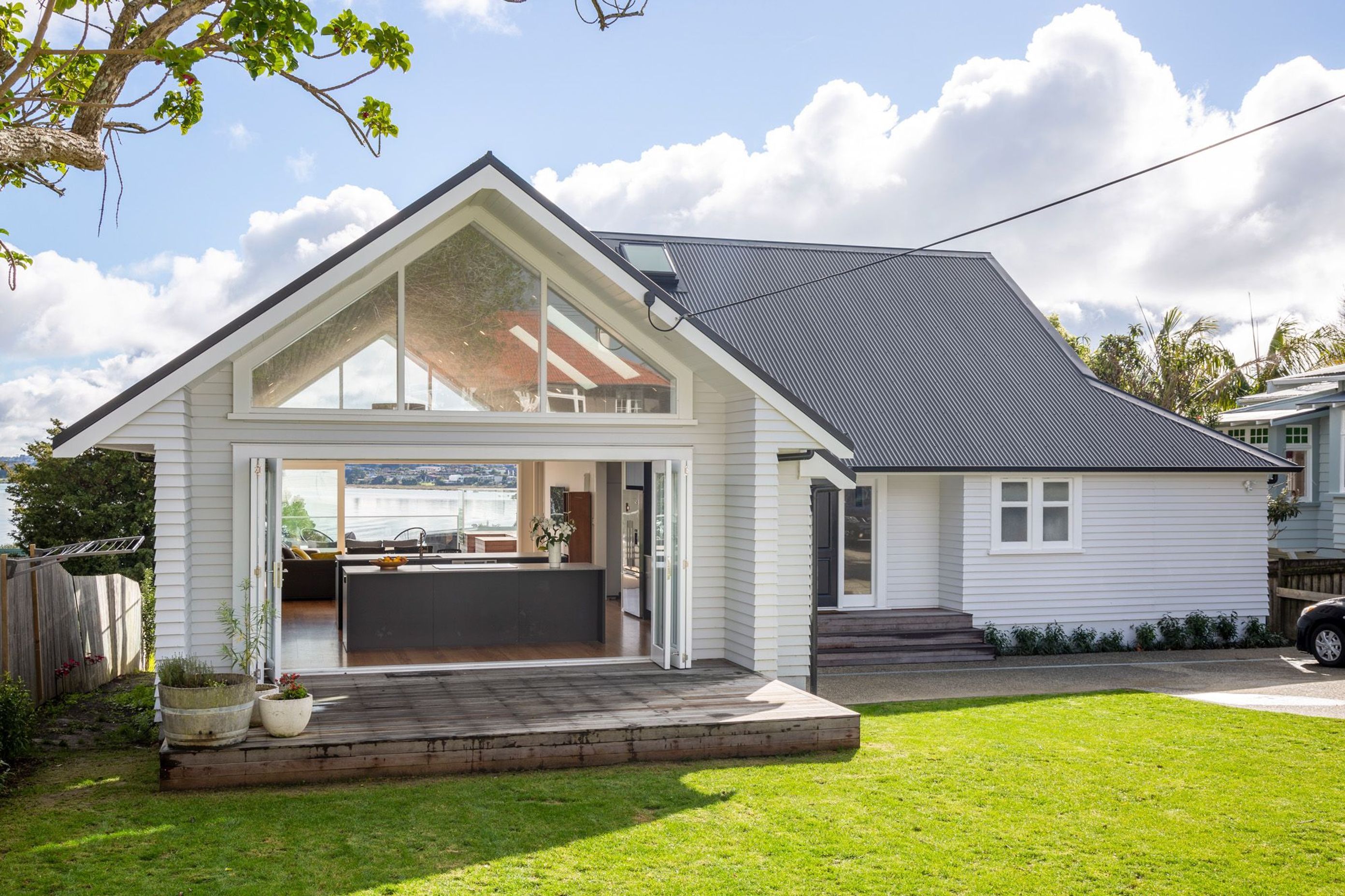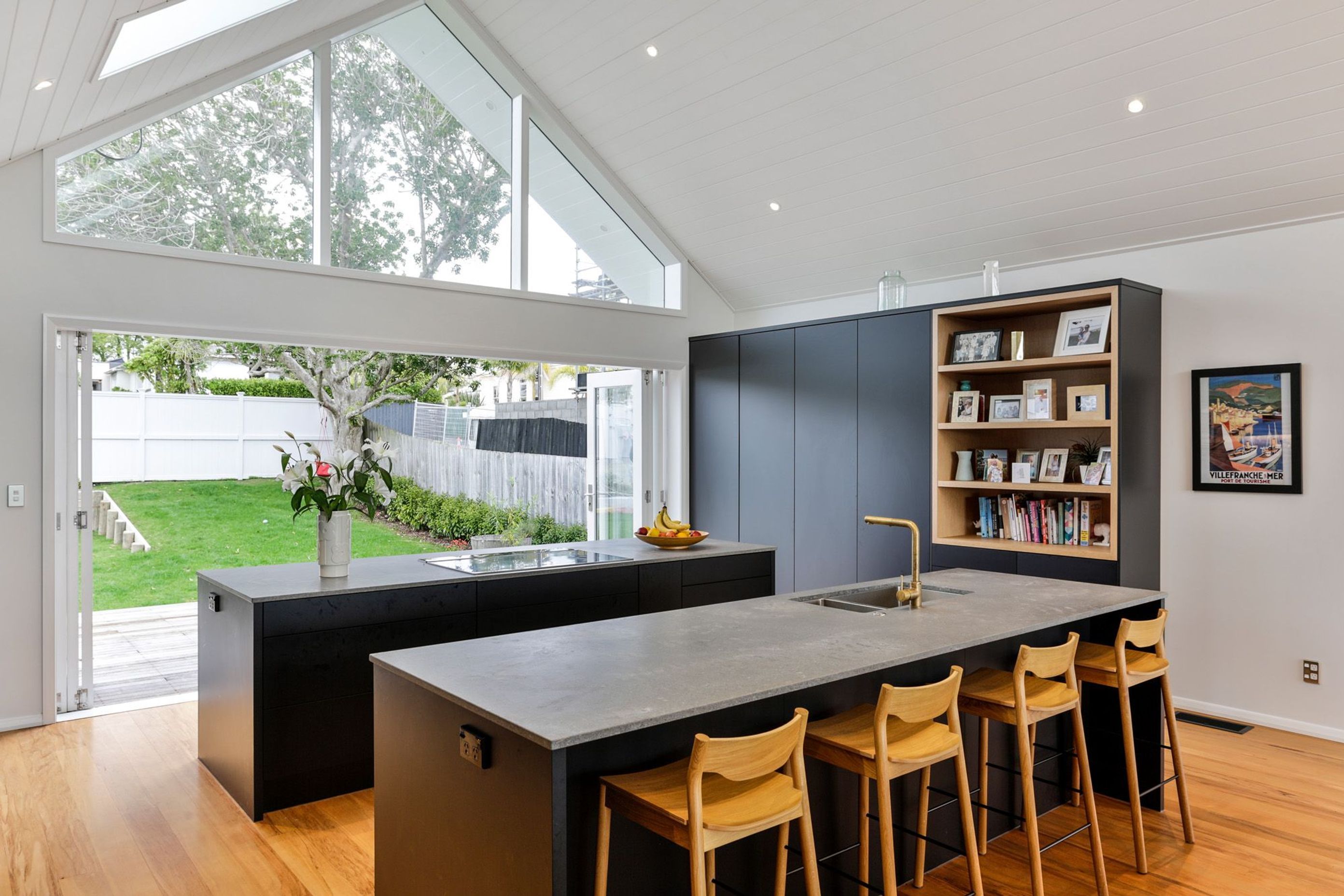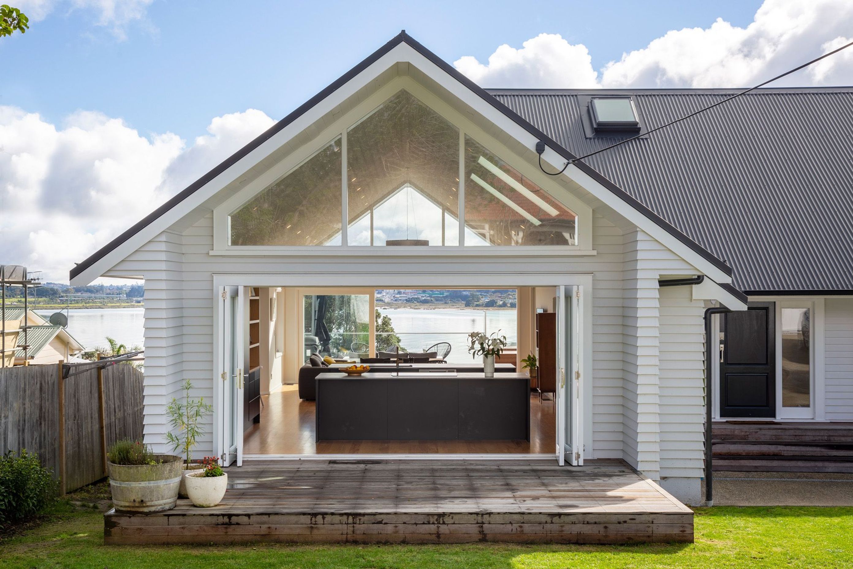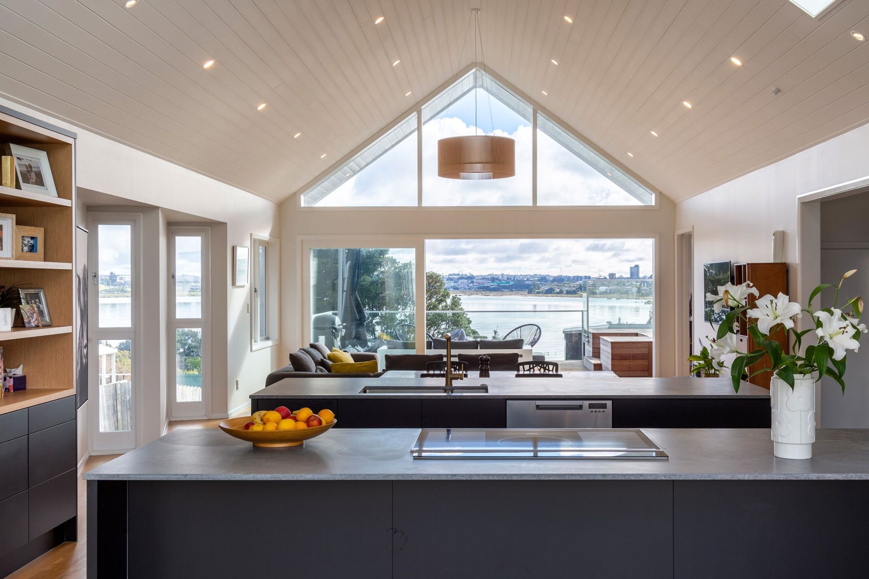 ArchiPro Project Summary - A transformed 1940s cottage featuring a new living wing that embraces stunning views of Shoal Bay, with extensive glazing for natural light, outdoor connectivity, and a unique twin-island kitchen design.