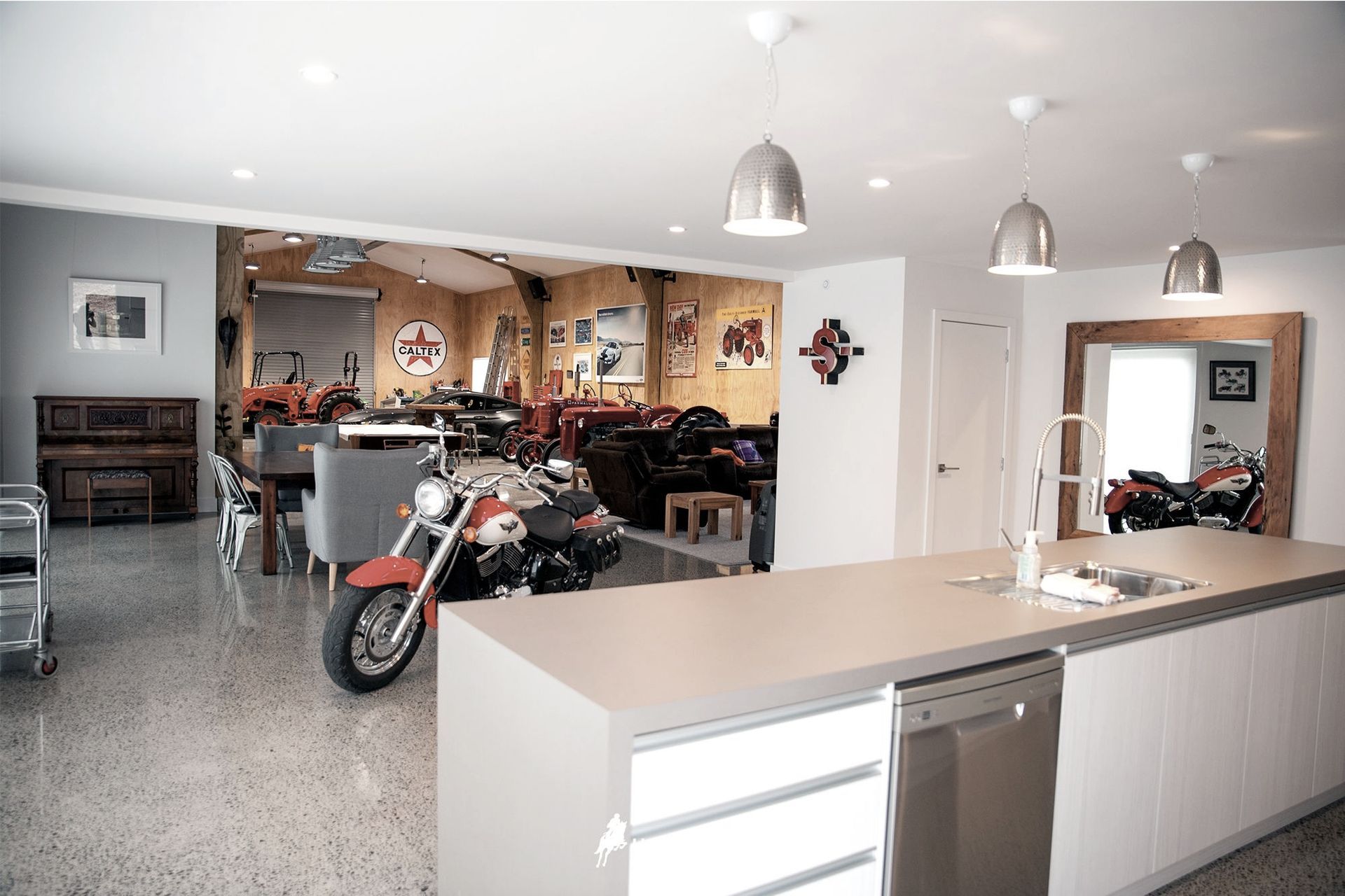 ArchiPro Project Summary - A spacious and versatile barn designed for leisure and functionality, featuring a polished concrete floor, generous access doors, and a mezzanine level, transforming a simple shed into an exceptional man cave.