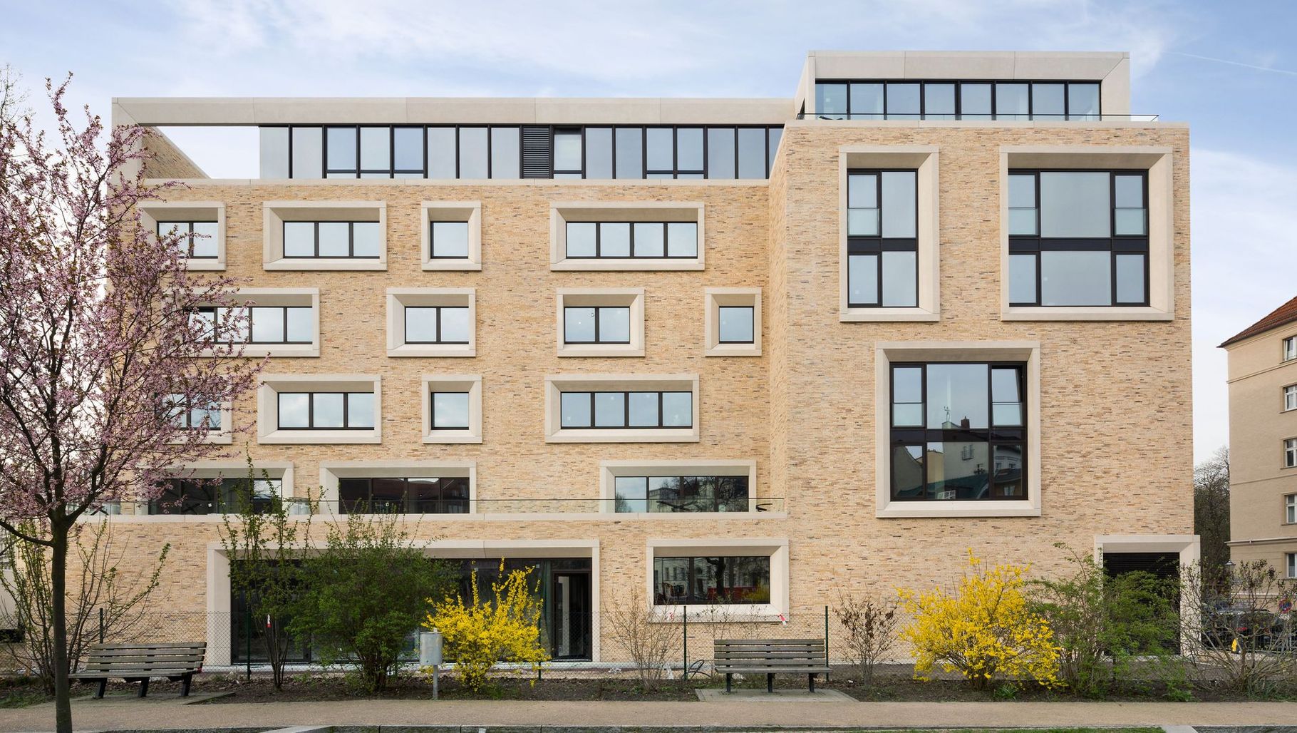 ArchiPro Project Summary - A striking four-storey building in Berlin featuring a unique façade of bright beige bricks and white architectural concrete, harmoniously integrating with its diverse surroundings through thoughtfully designed windows.