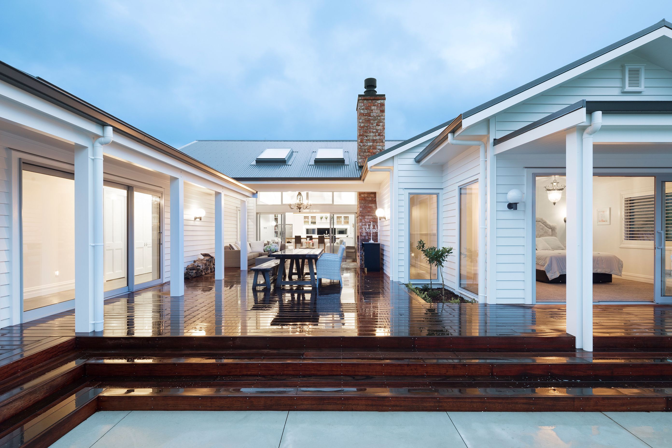 ArchiPro Project Summary - A timeless weatherboard villa in Tauranga, designed for modern family living with flexible spaces, abundant natural light, and a central courtyard that enhances privacy and connectivity, commended in the Resene Architectural Design Awards 2017.