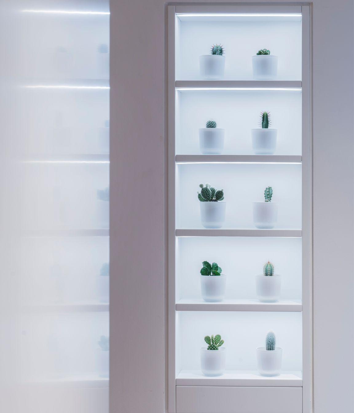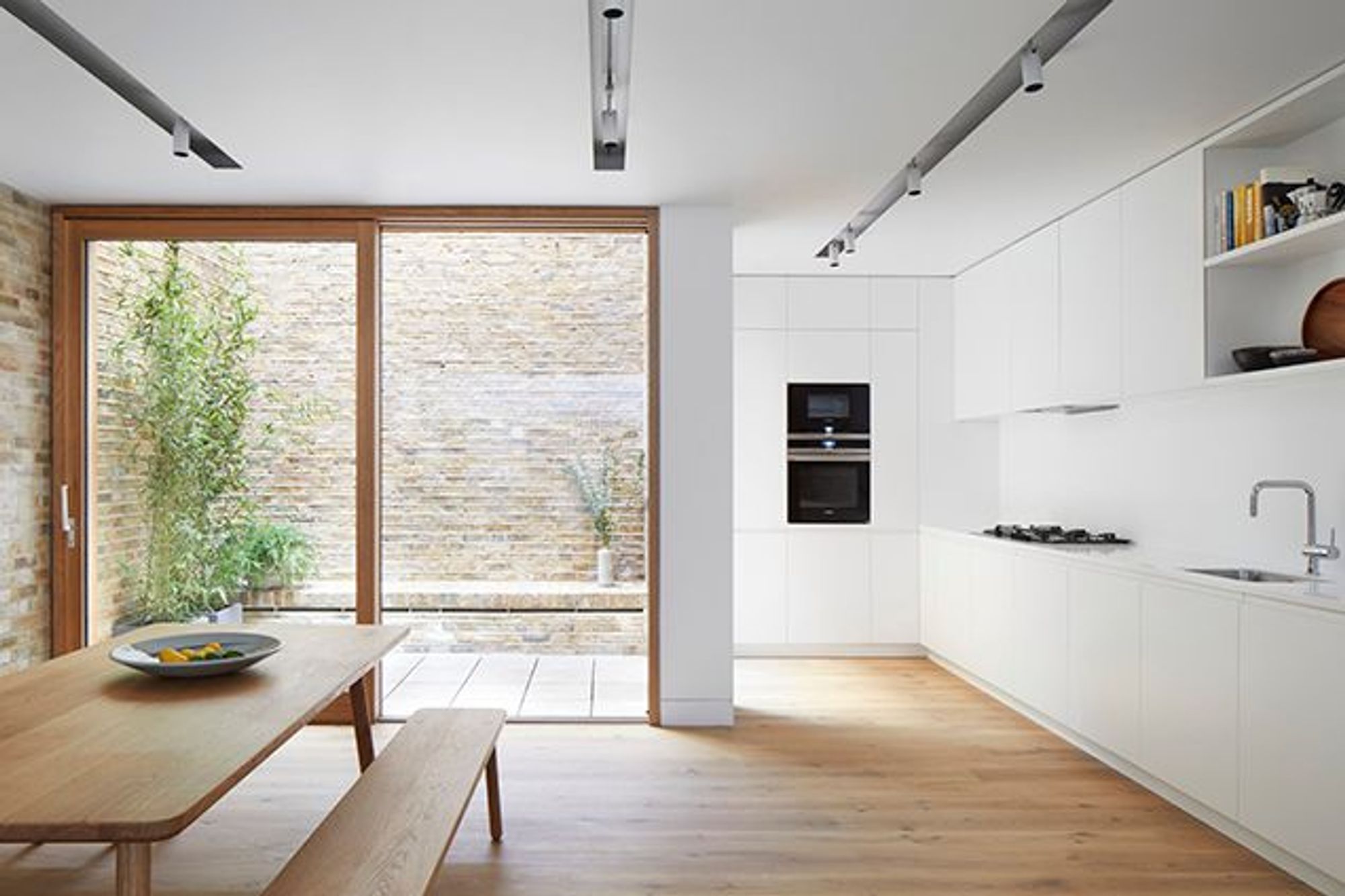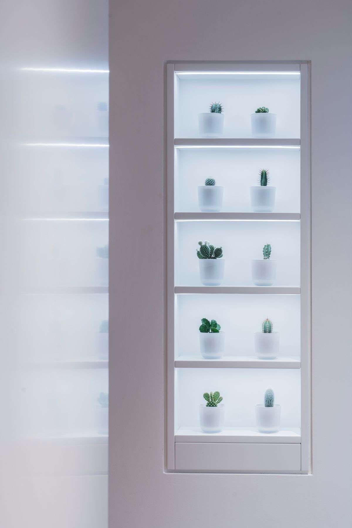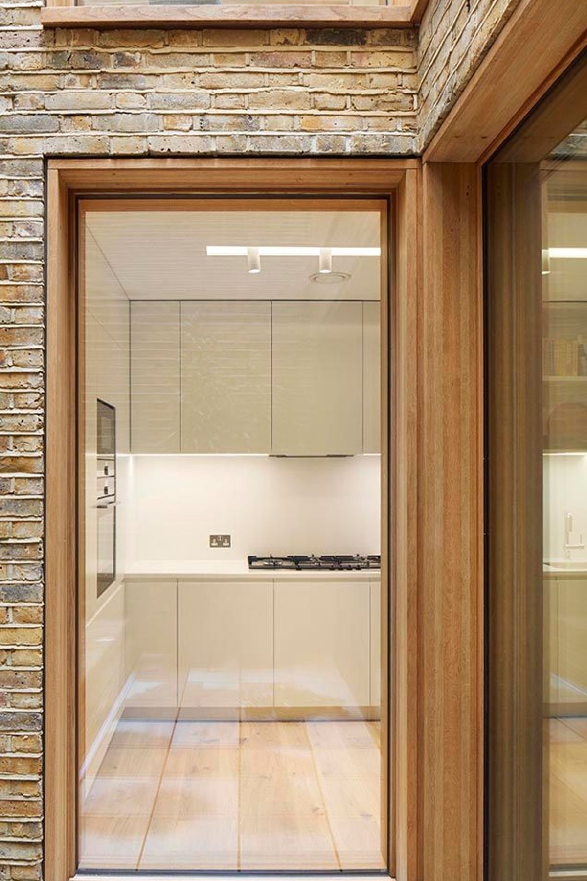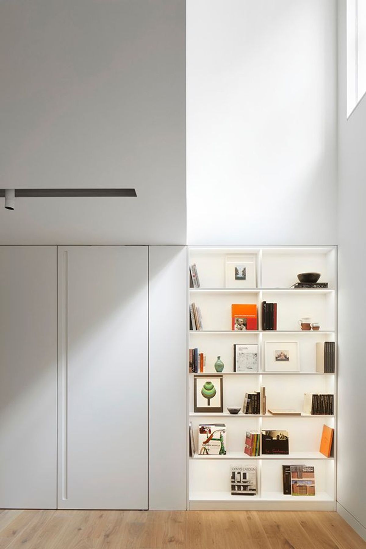 ArchiPro Project Summary - Residential apartment designed within a narrow terraced block, featuring innovative artificial lighting to enhance the ambiance and diffused ceiling slots complemented by accent spotlights.