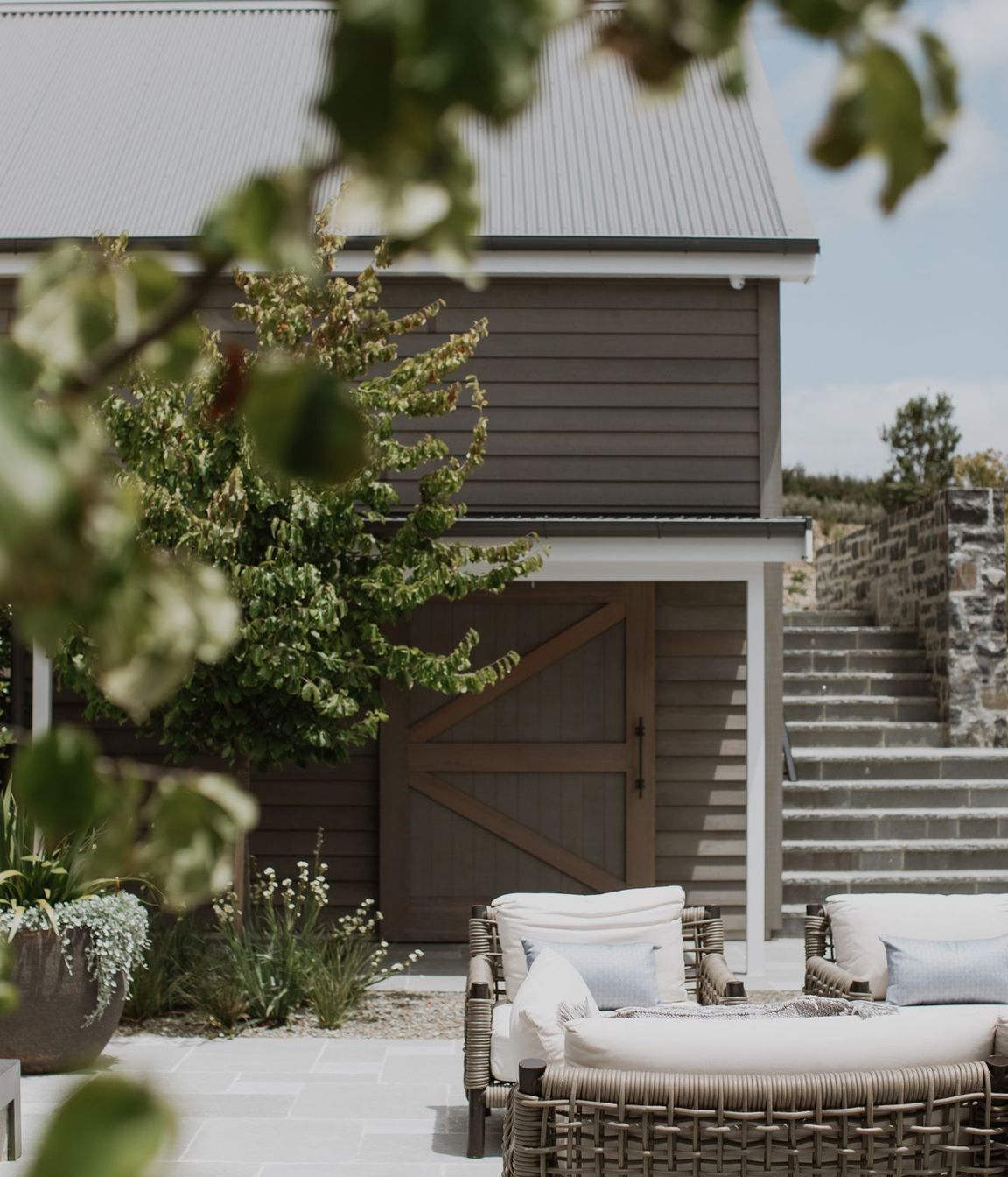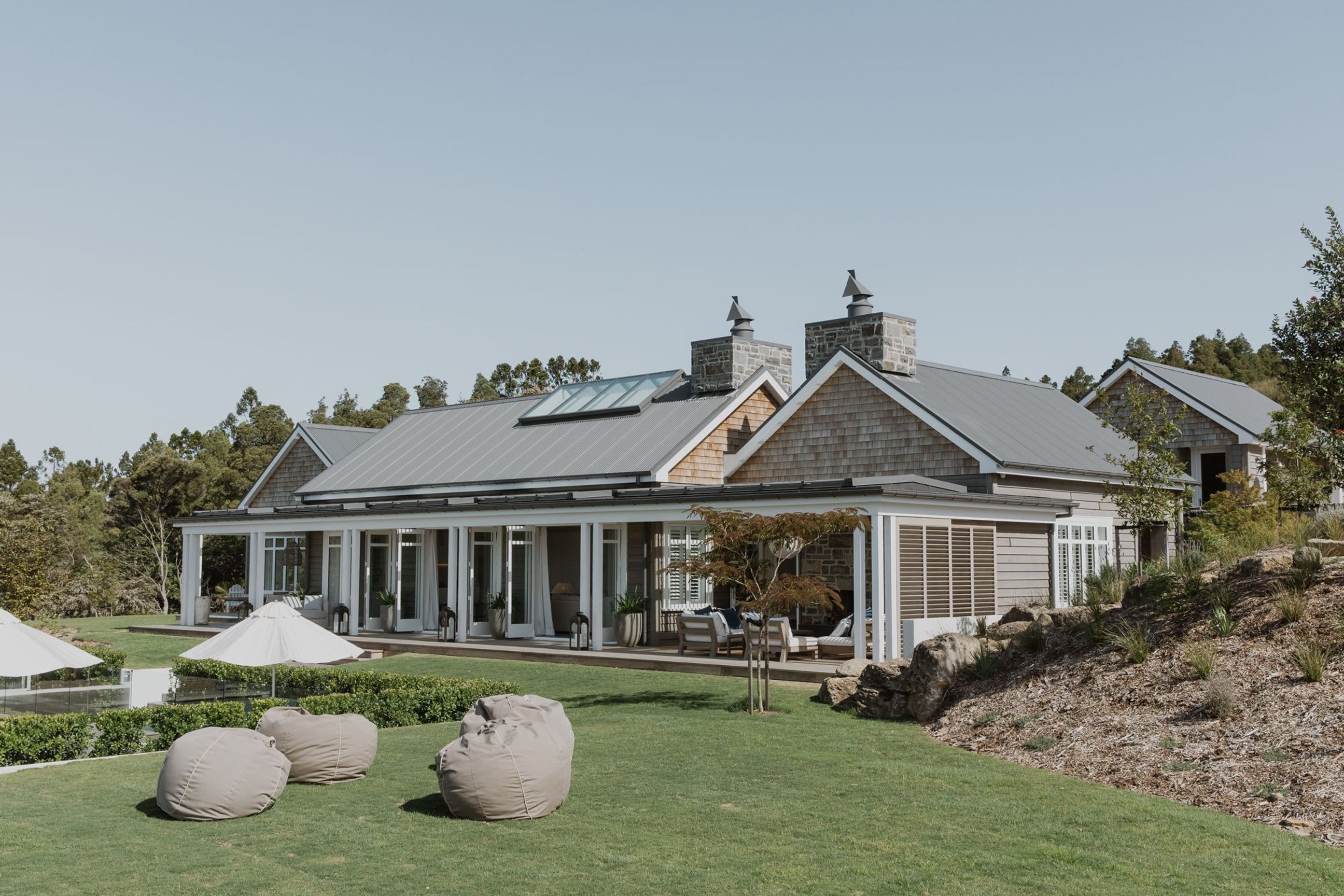 ArchiPro Project Summary - A traditional farmhouse designed for entertaining, featuring a stepped layout, a hidden pool house with gym and boat shed, an underground cellar, and a natural timber exterior with white detailing.