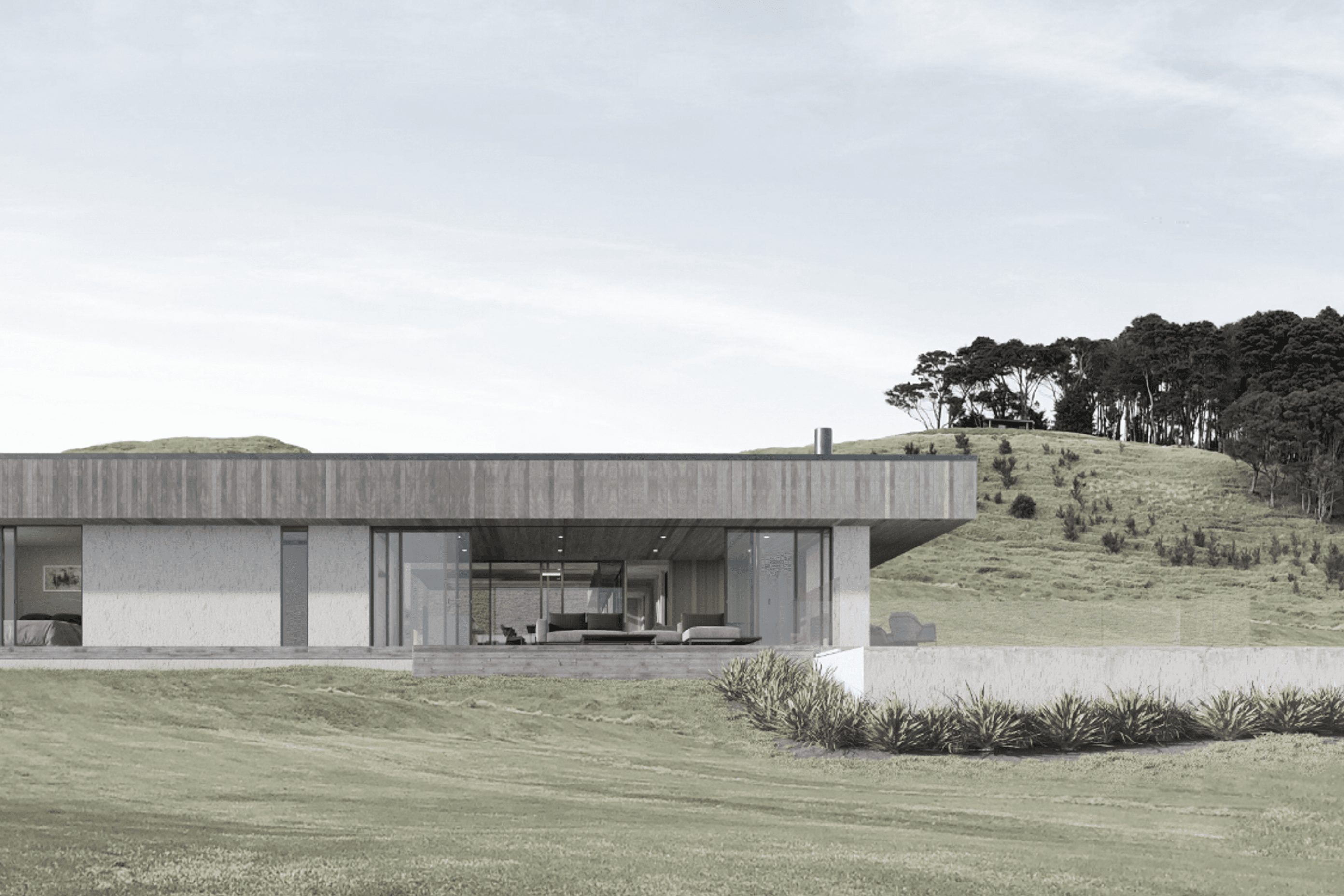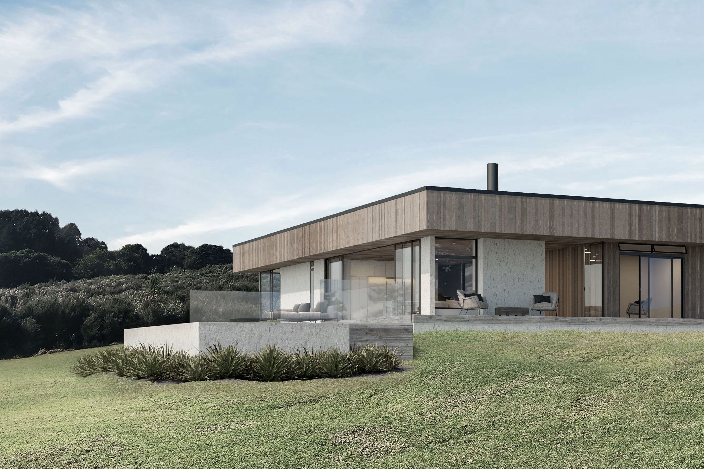 ArchiPro Project Summary - A single-level dwelling on the Tawharanui Peninsula featuring a sheltered courtyard, large lawn, and native bush, designed with an L-shaped layout and a freestanding garage for a welcoming entrance.