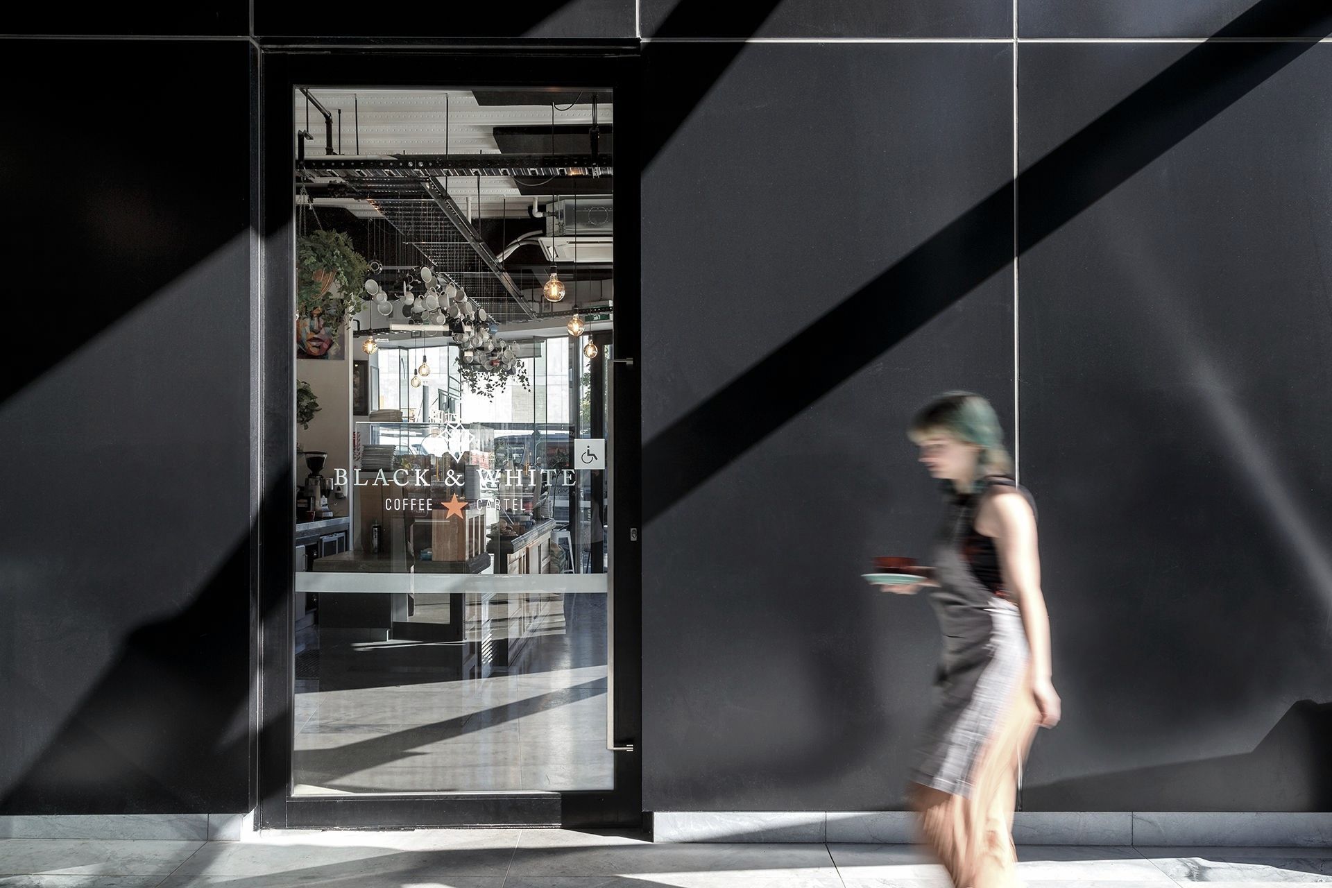 ArchiPro Project Summary - The Black & White Coffee Cartel features a modern design with a sleek black and white color scheme, optimizing customer flow and creating a cozy atmosphere.