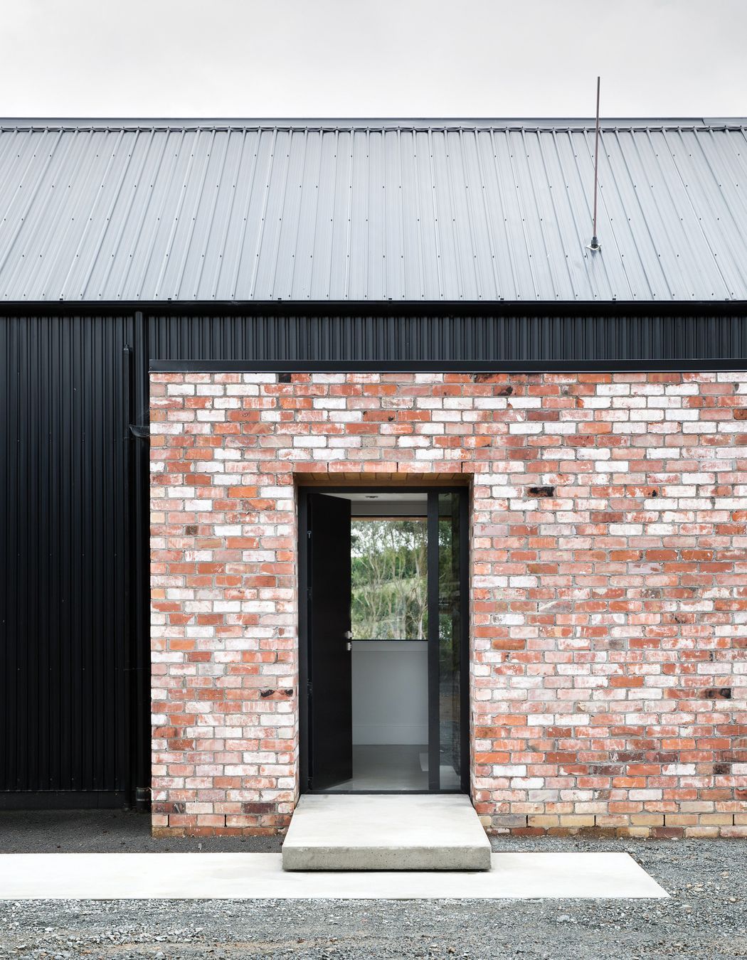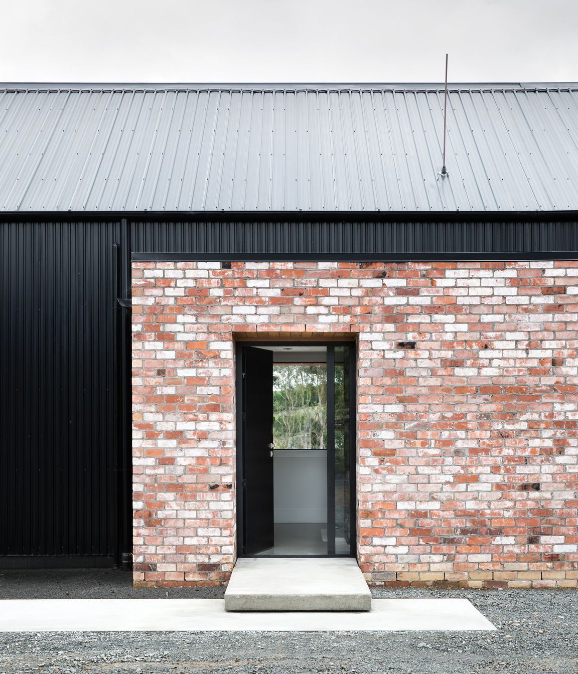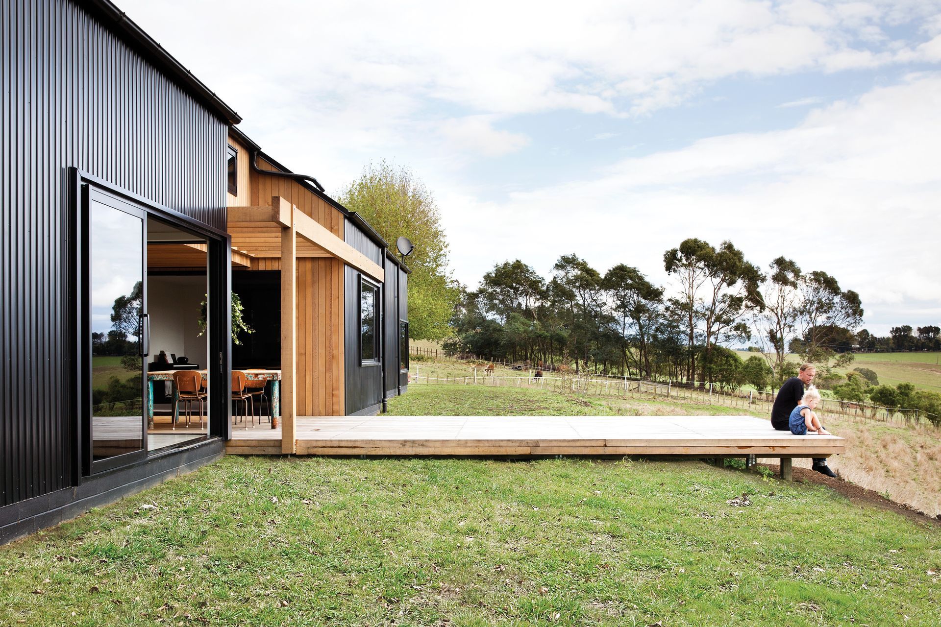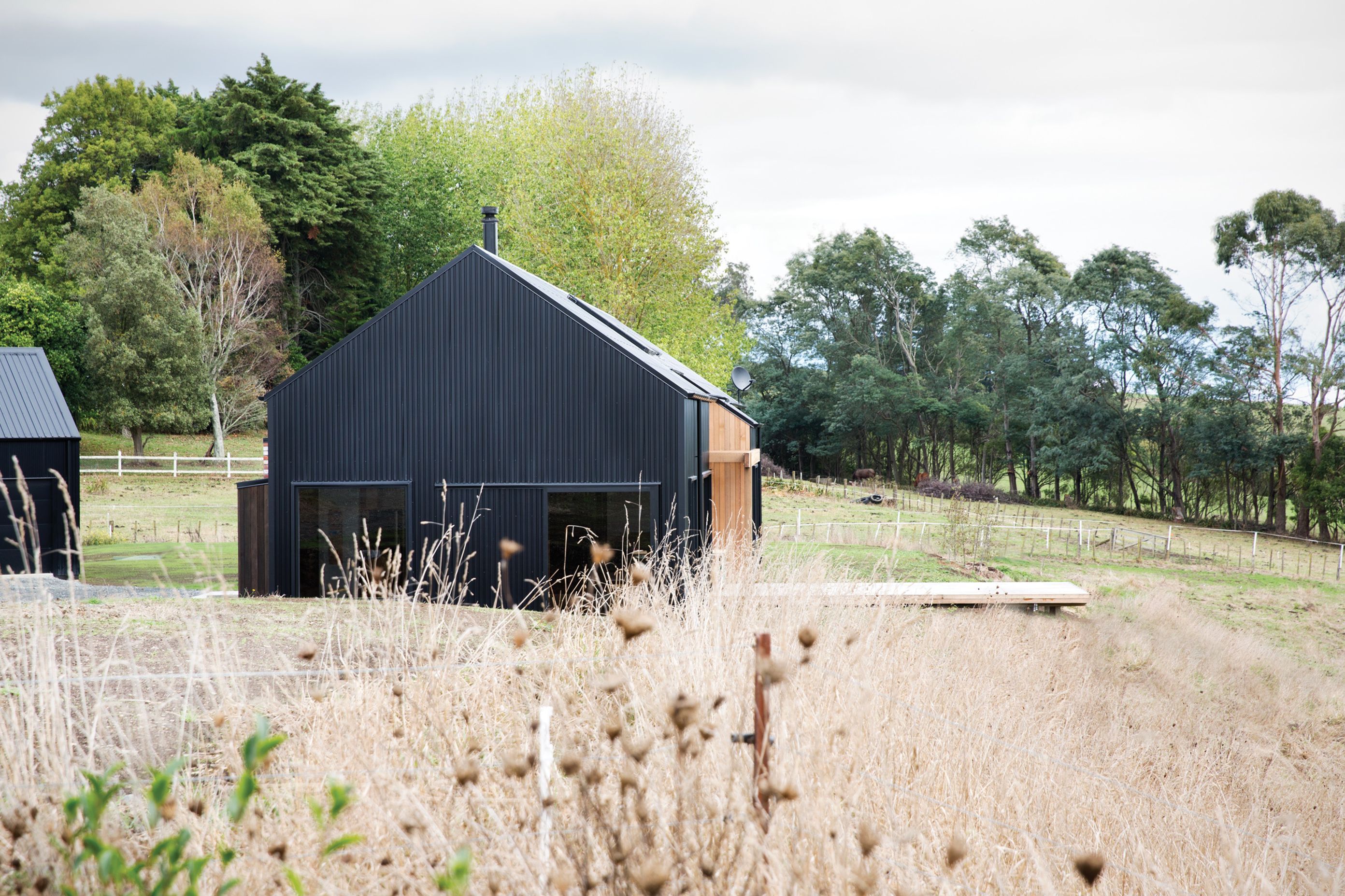 ArchiPro Project Summary - A modern family home featuring two black barn-like structures, designed by Tane Cox of Red Architecture, harmoniously blending with the rural landscape of Whatawhata while providing a child-friendly environment that adapts to the family's needs.