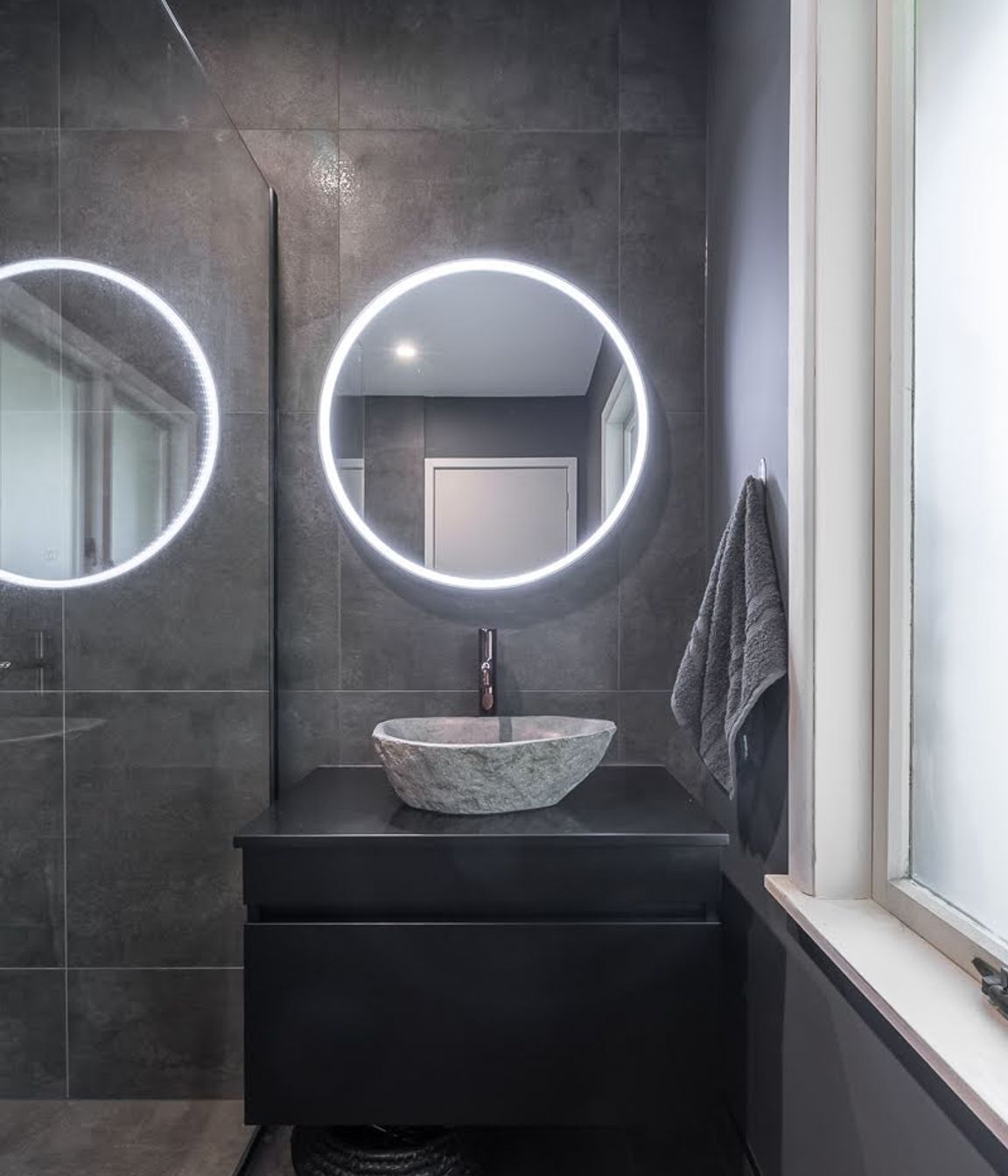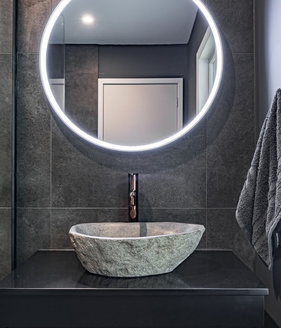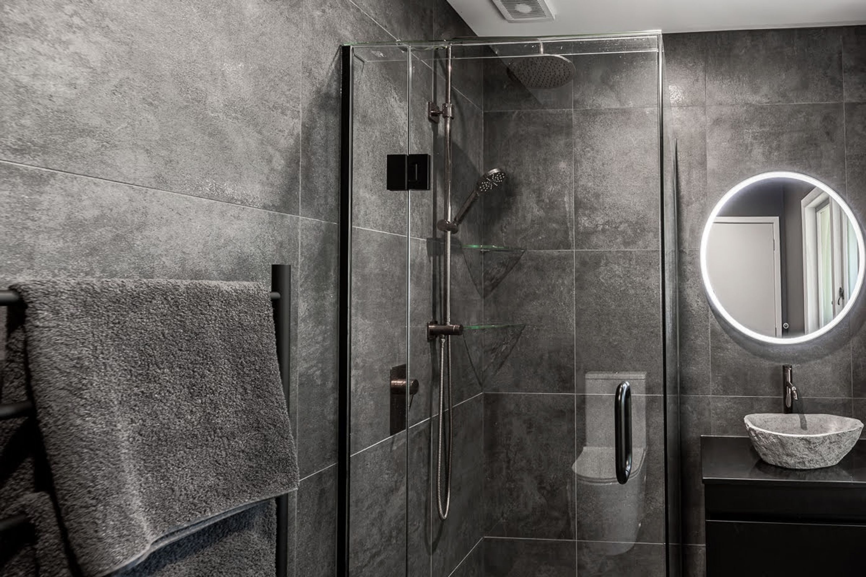 ArchiPro Project Summary - A sophisticated blend of modern design and functionality in a striking black bathroom.