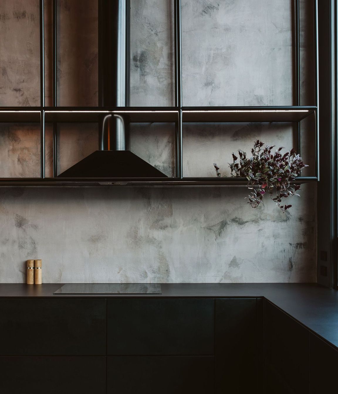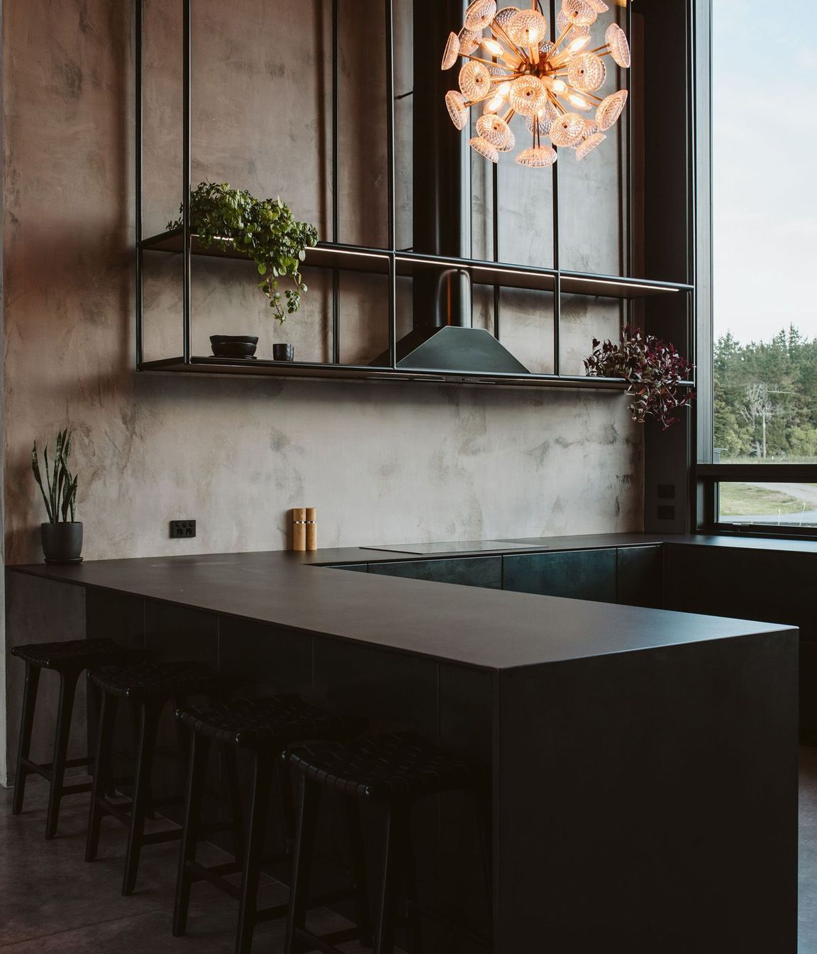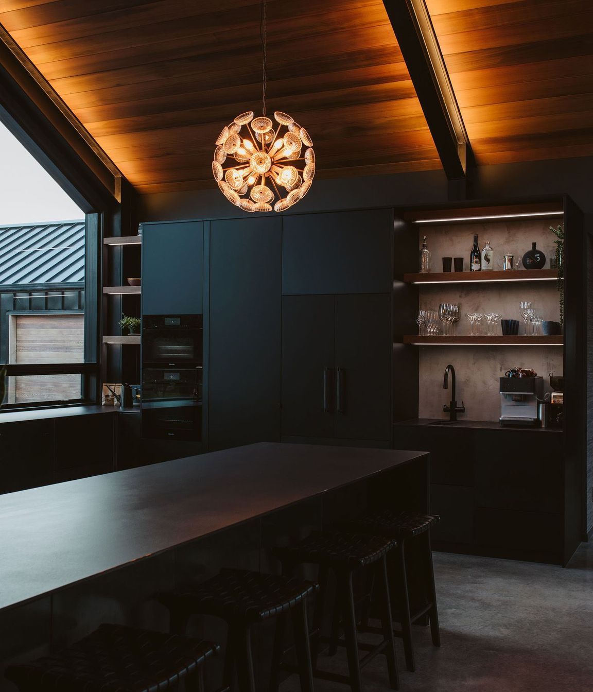 ArchiPro Project Summary - A striking kitchen featuring a blend of steel, matte black, and Dekton, complemented by concrete floors and a cedar ceiling, showcasing custom steel elements and antique pendant lighting in a unique new build by Jason Reid Builders.