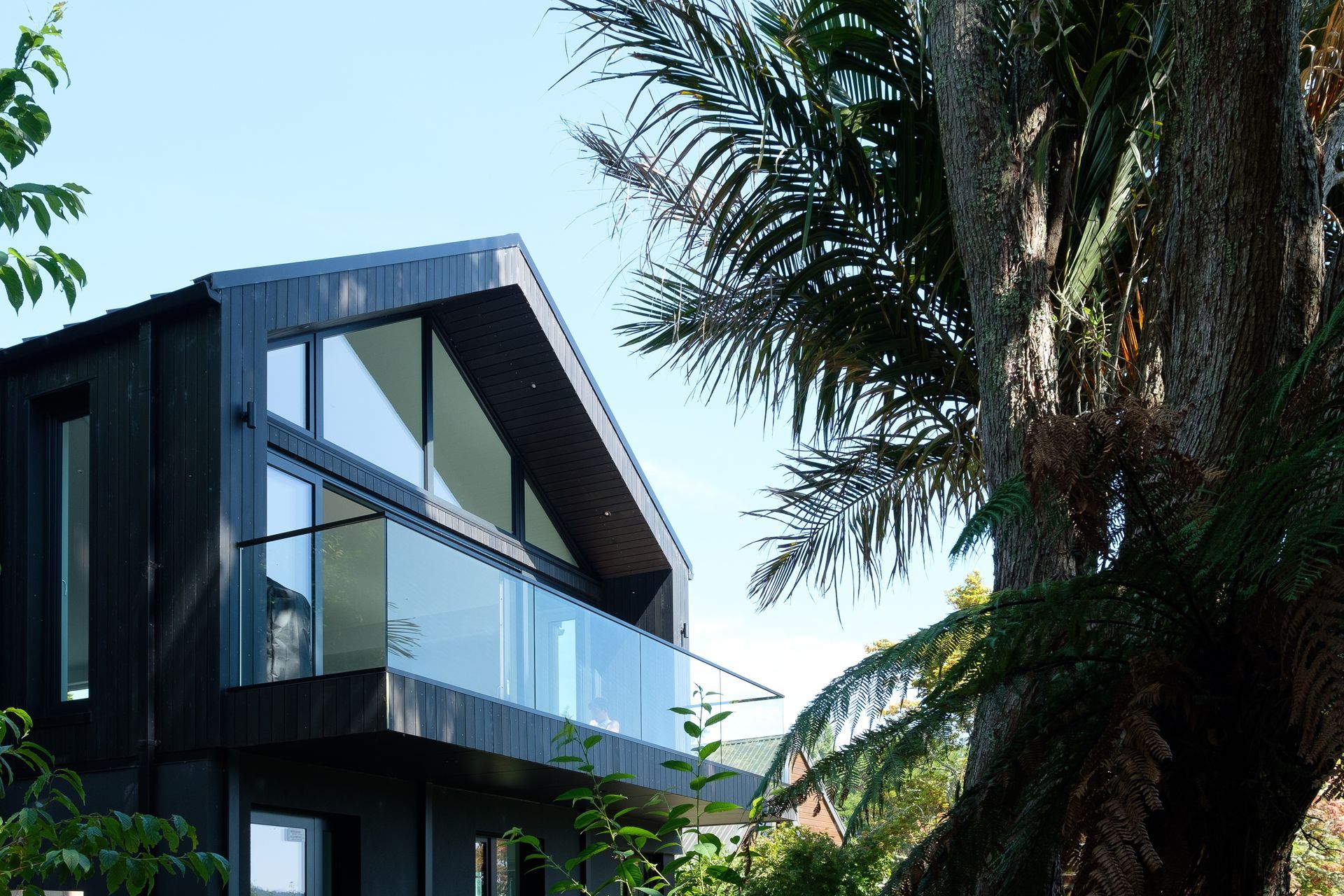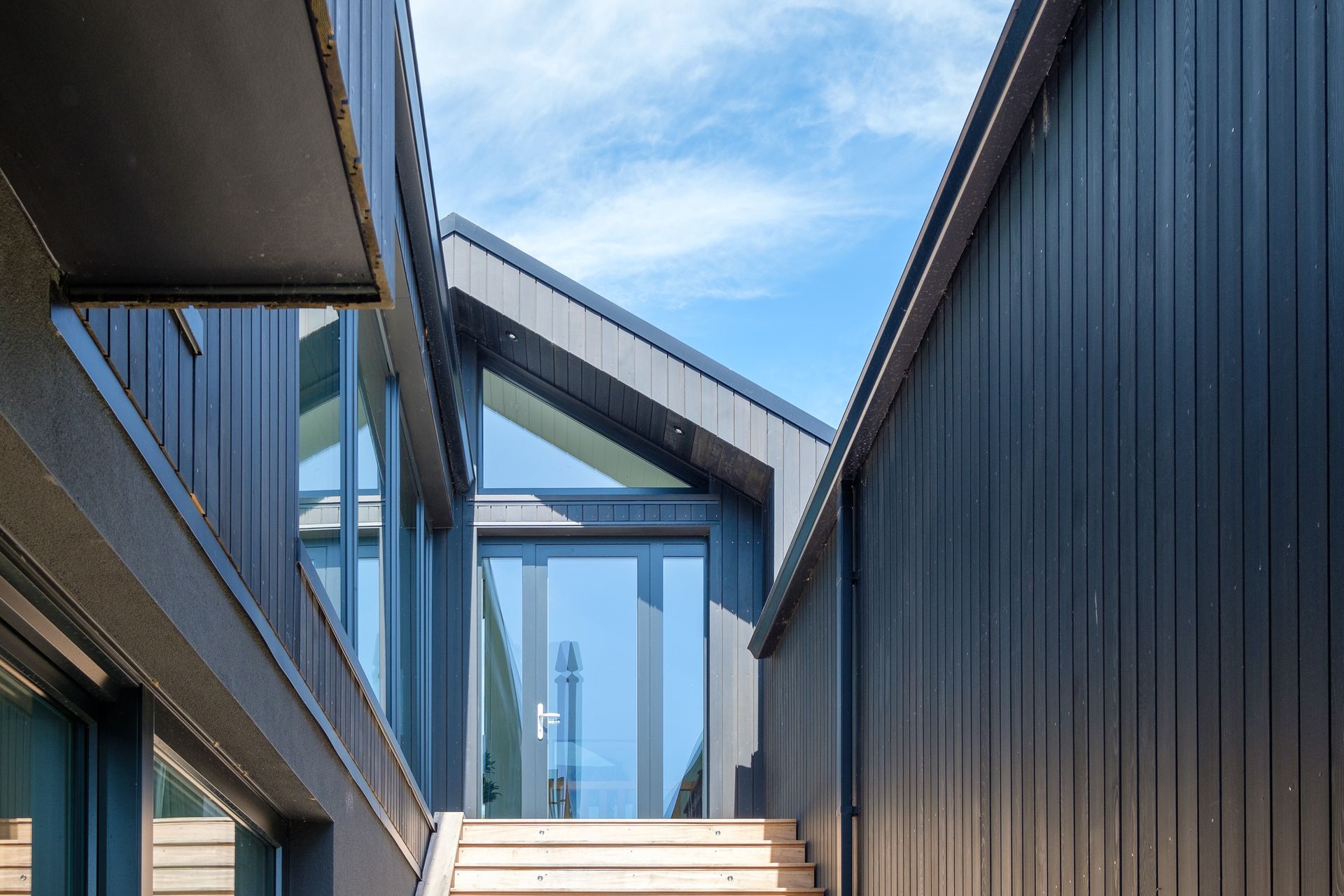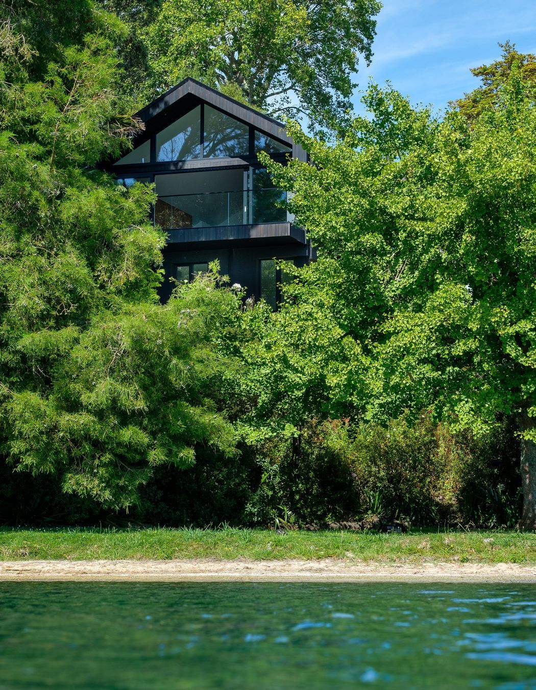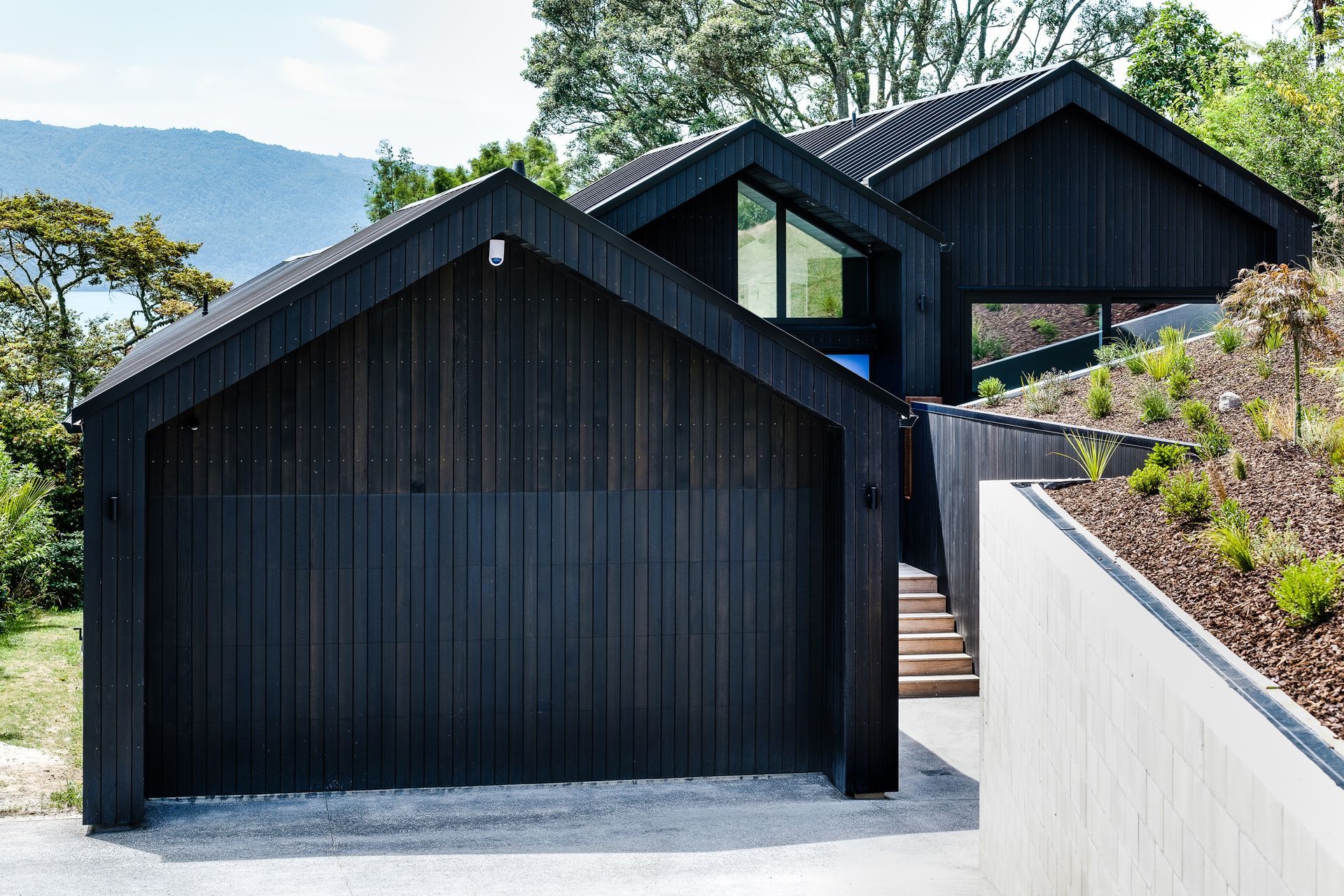 ArchiPro Project Summary - Black Gables: A stunning family home designed with gabled roof profiles, seamlessly integrated into the landscape of Lake Tarawera, featuring energy-efficient Passive House principles and exquisite craftsmanship by an accomplished joiner.