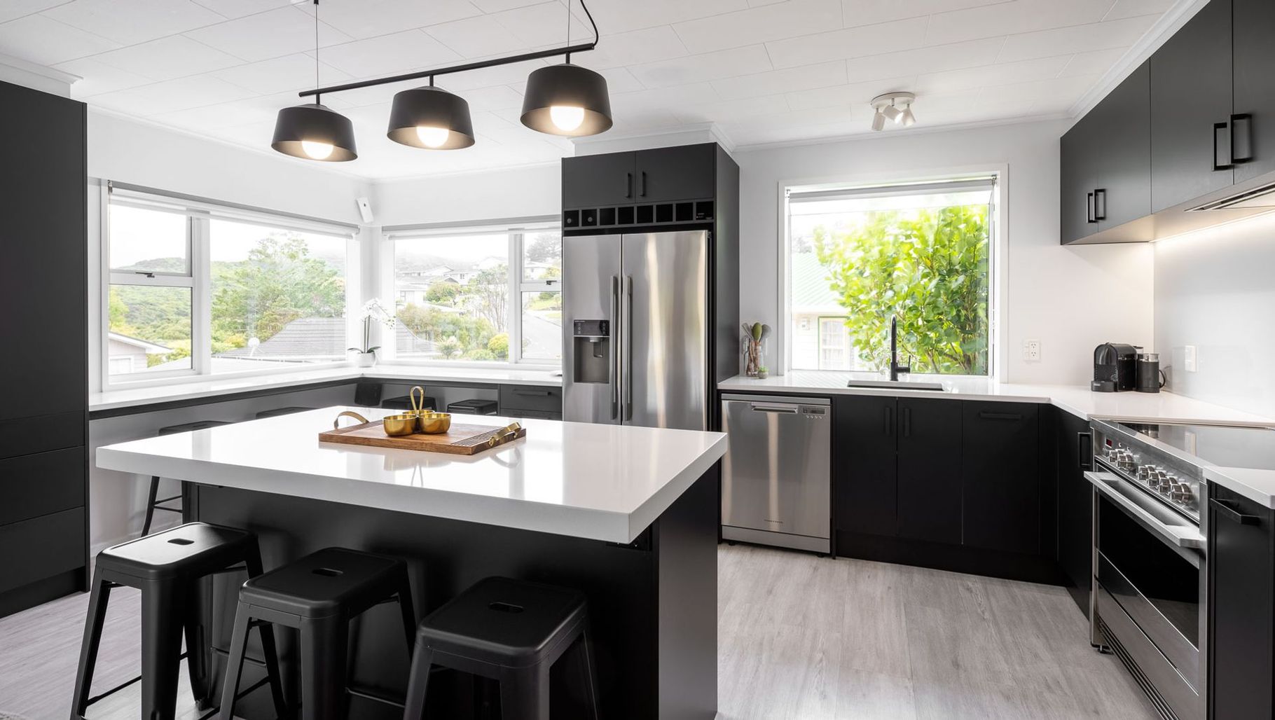 ArchiPro Project Summary - Elegant black kitchen design captured for Supremo Kitchens in Wellington, showcasing modern aesthetics and functional elegance.