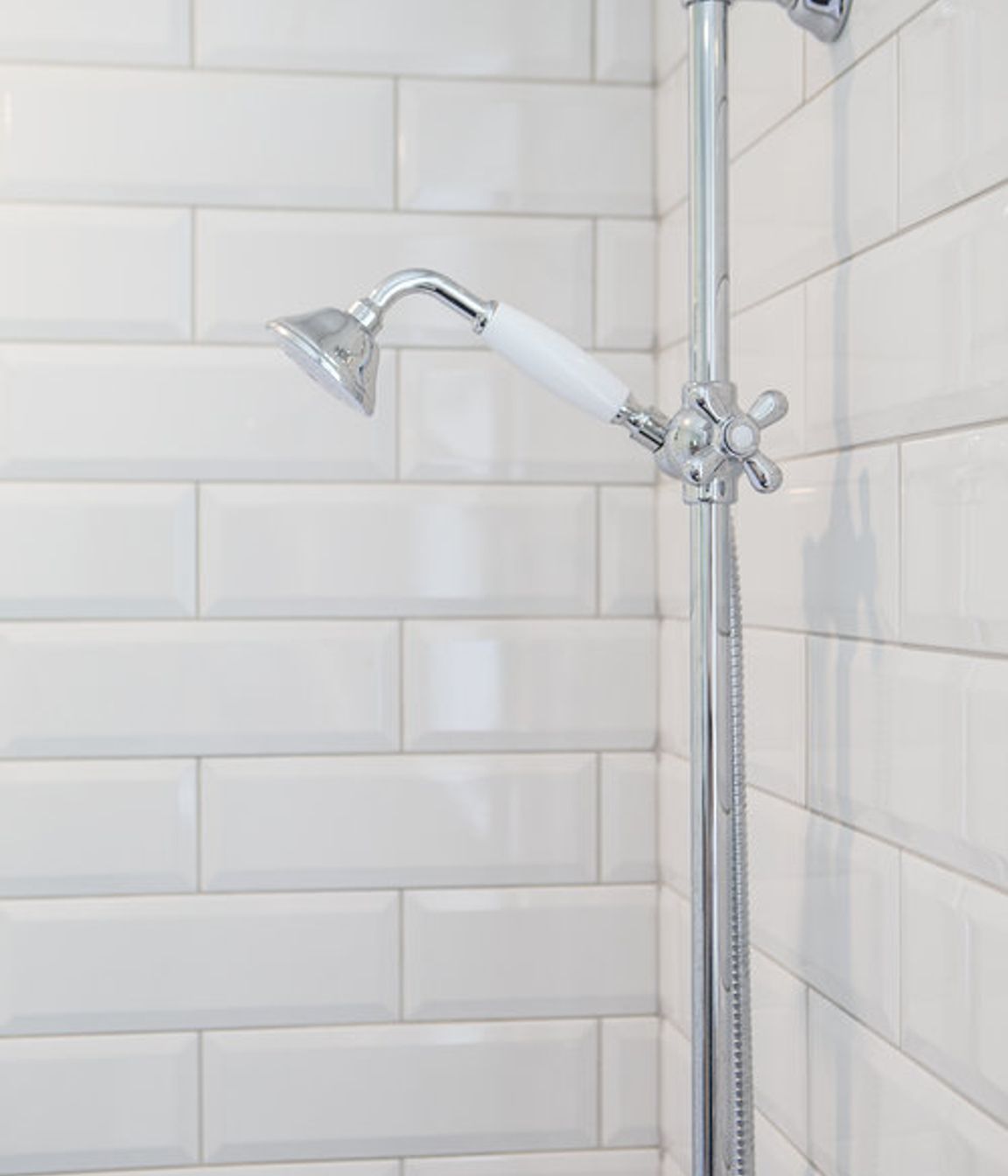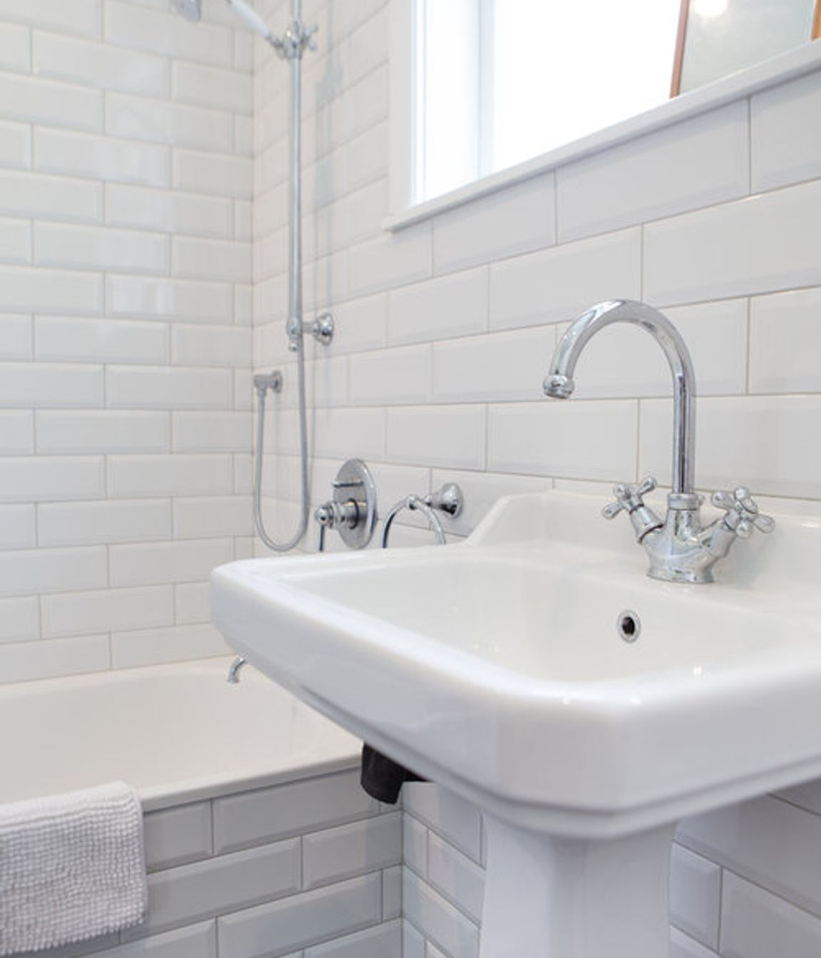 ArchiPro Project Summary - A stylish small family bathroom featuring a classic black, white, and chrome color scheme, enhanced by floor-to-ceiling white tiling that creates an illusion of spaciousness.