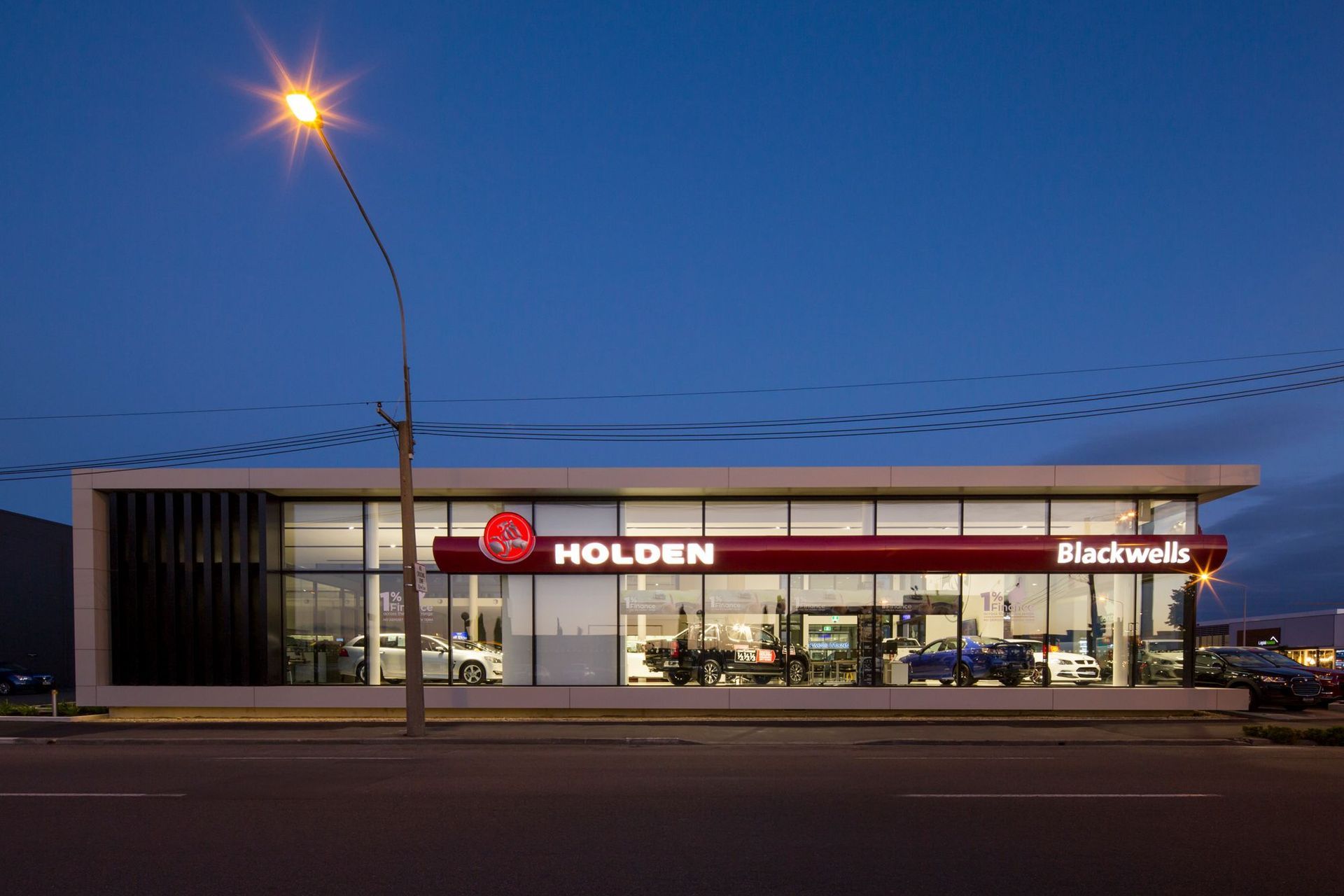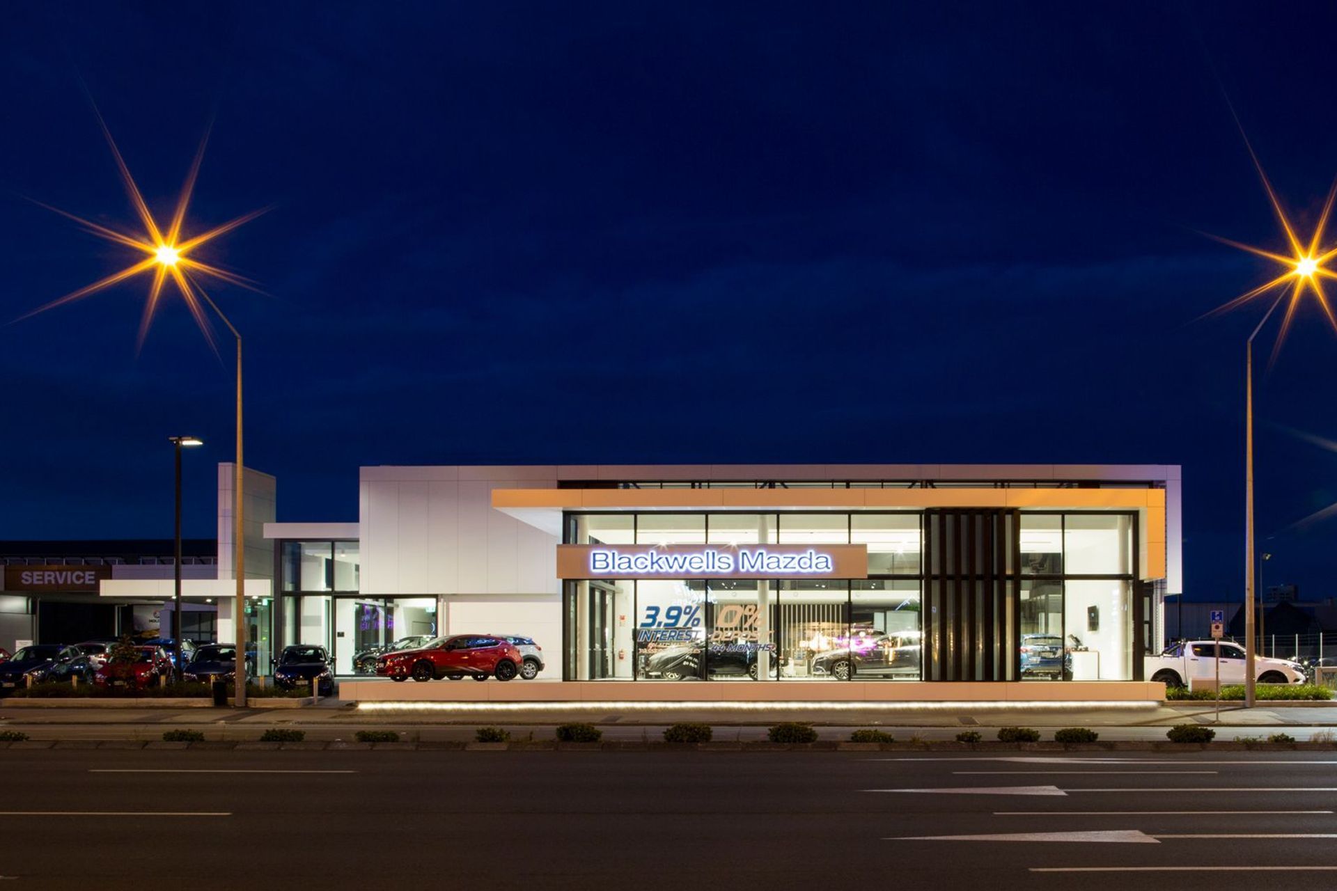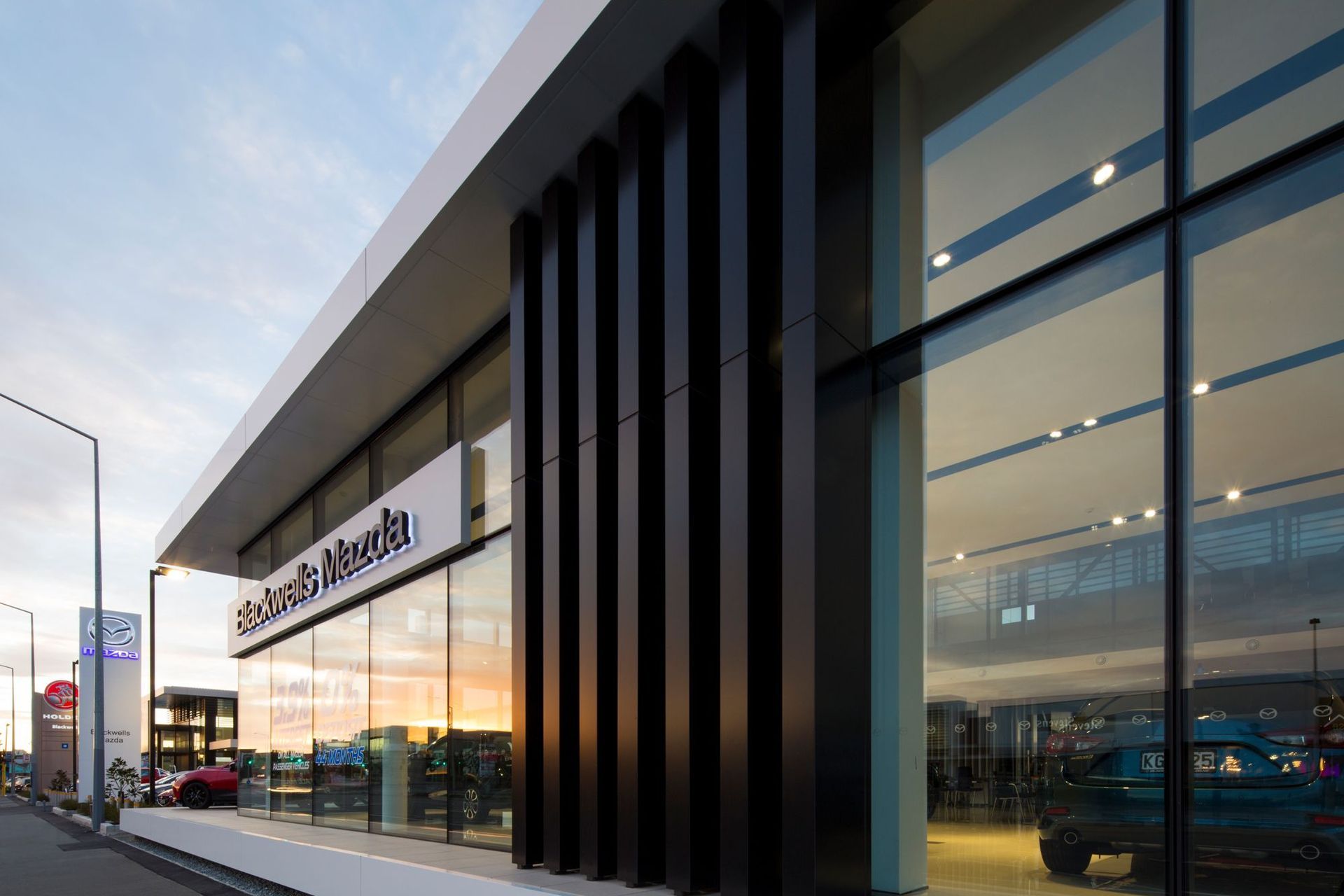 ArchiPro Project Summary - Blackwells Holden & Mazda Showrooms featuring two distinct yet complementary car showrooms with innovative design solutions, extensive glazing, and carefully controlled signage, enhancing visibility and engagement while addressing site-specific challenges.