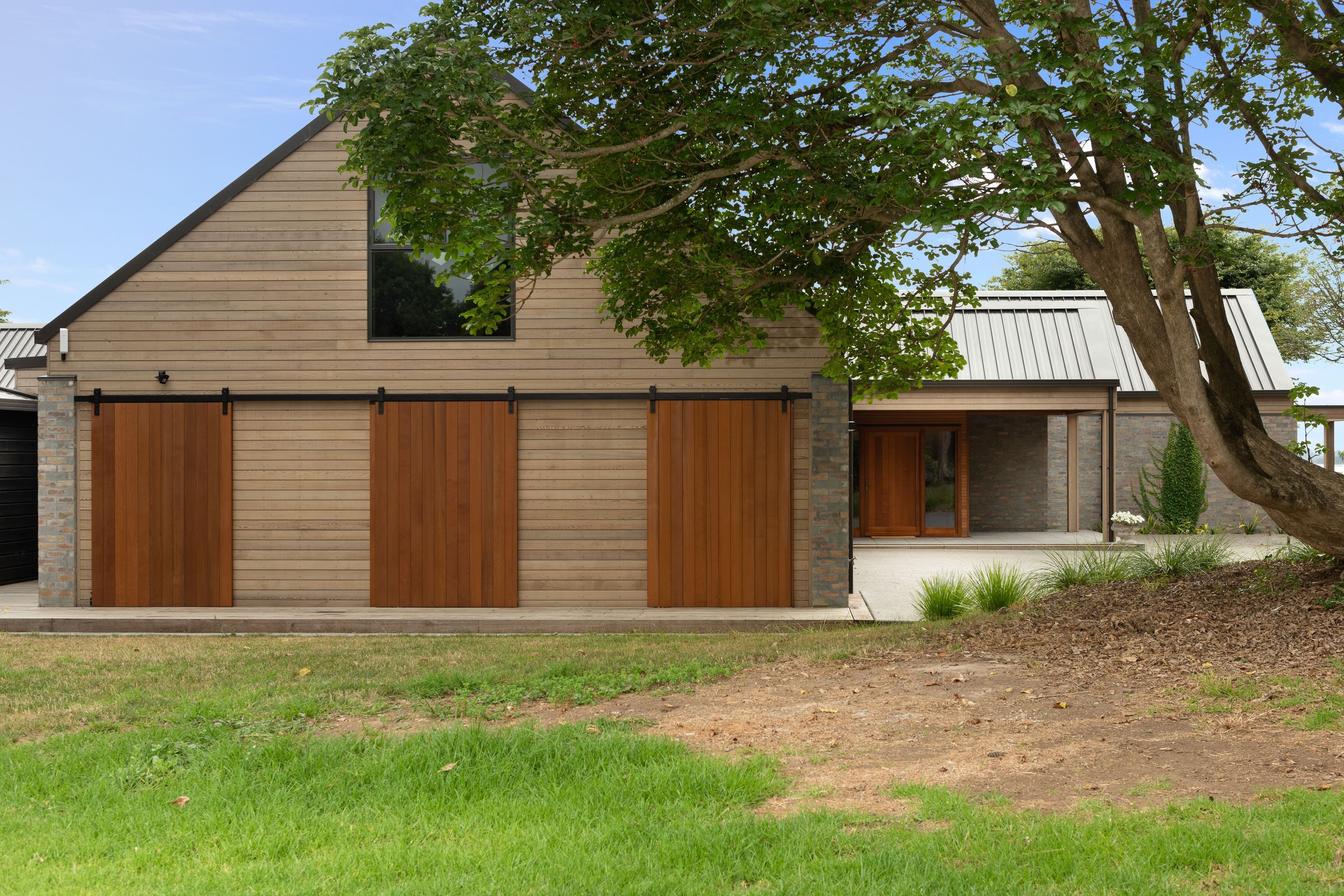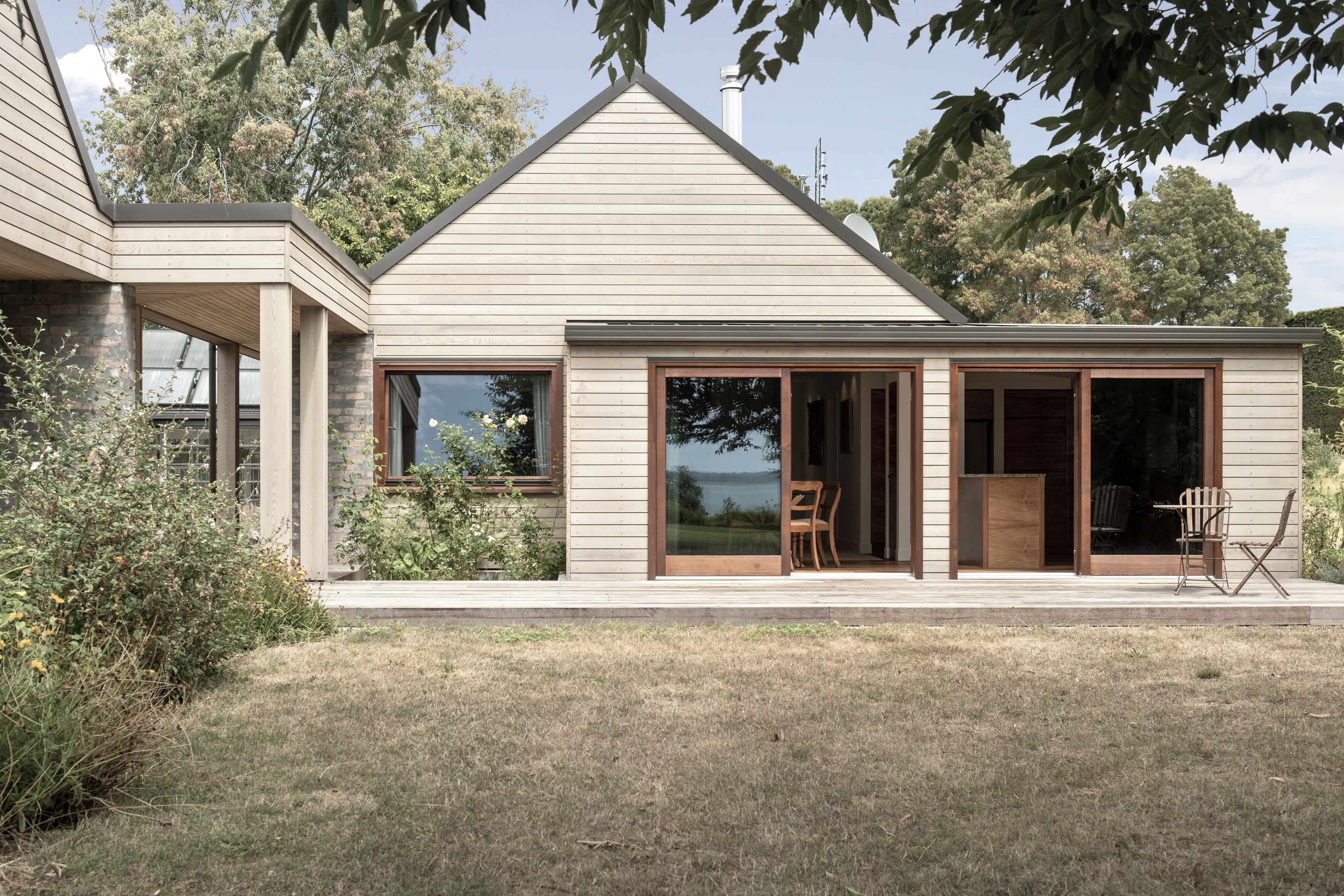 ArchiPro Project Summary - A sustainable rework of a 1970s residence on the Tauranga harbourfront, featuring recycled materials and a focus on low carbon footprint, while respecting the original architectural language with extensive use of bricks and timber.