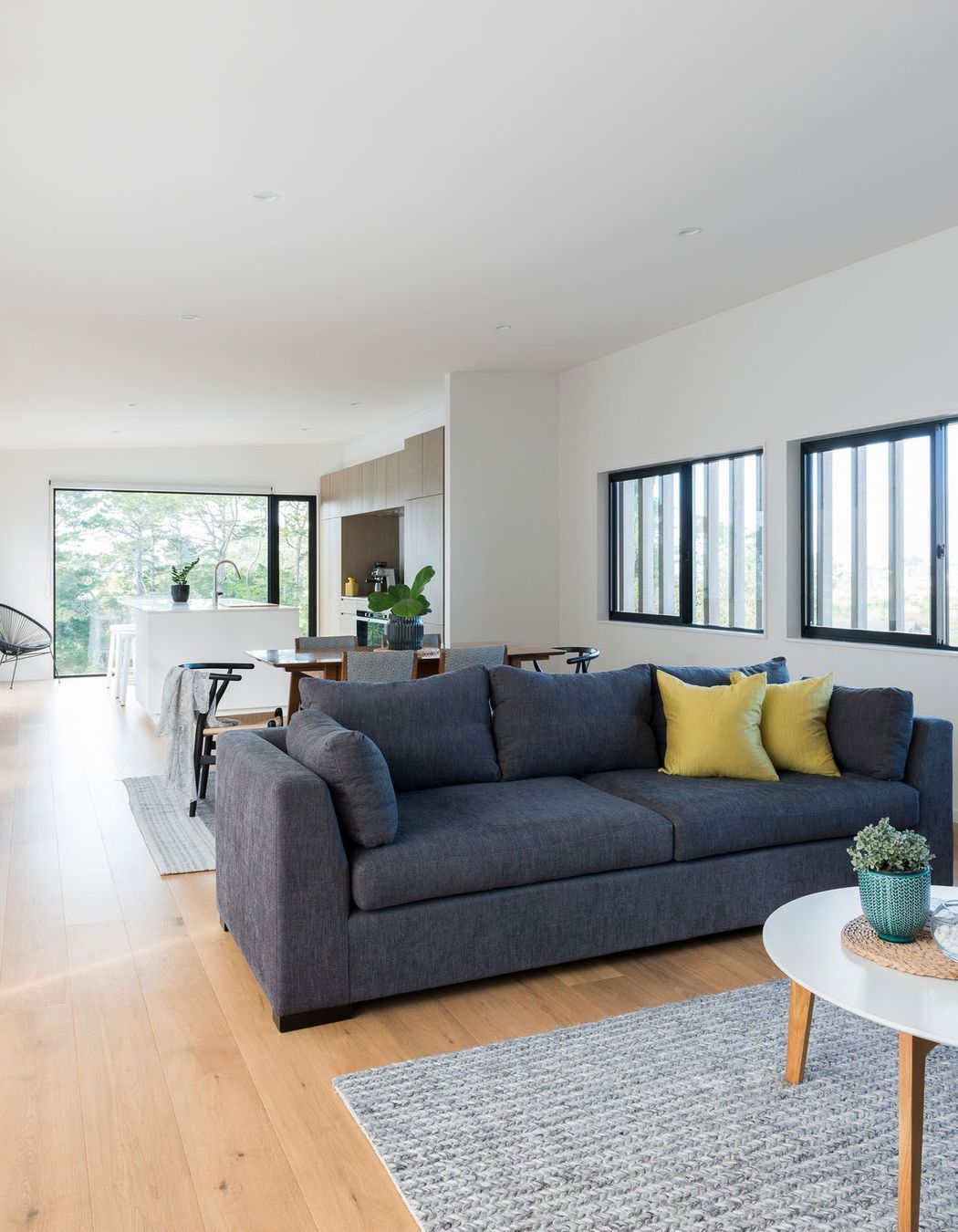 ArchiPro Project Summary - The Blake House exemplifies modern interior design with a spacious living room, elegant furniture, and warm wood flooring, creating a harmonious balance of comfort and sophistication.