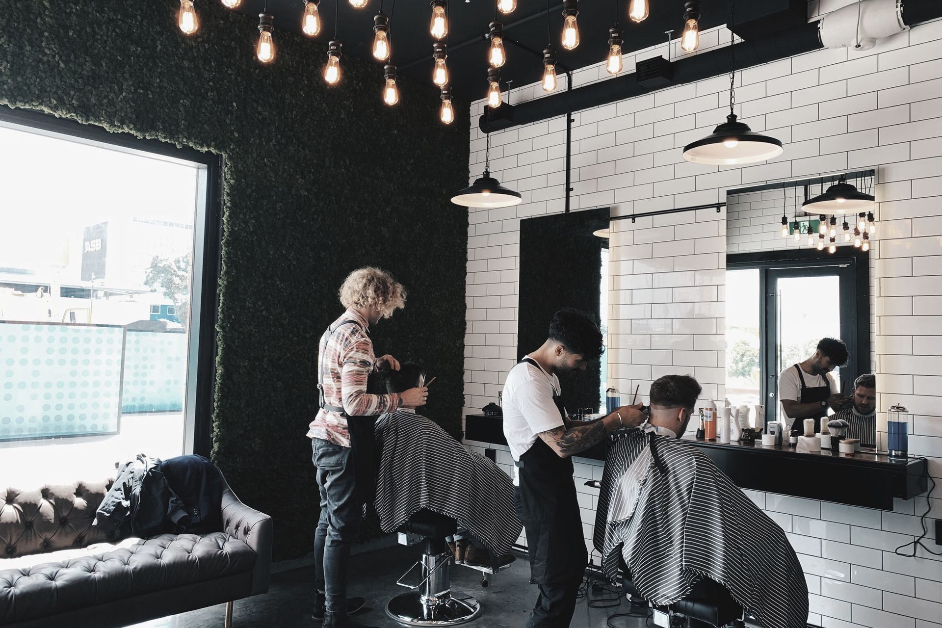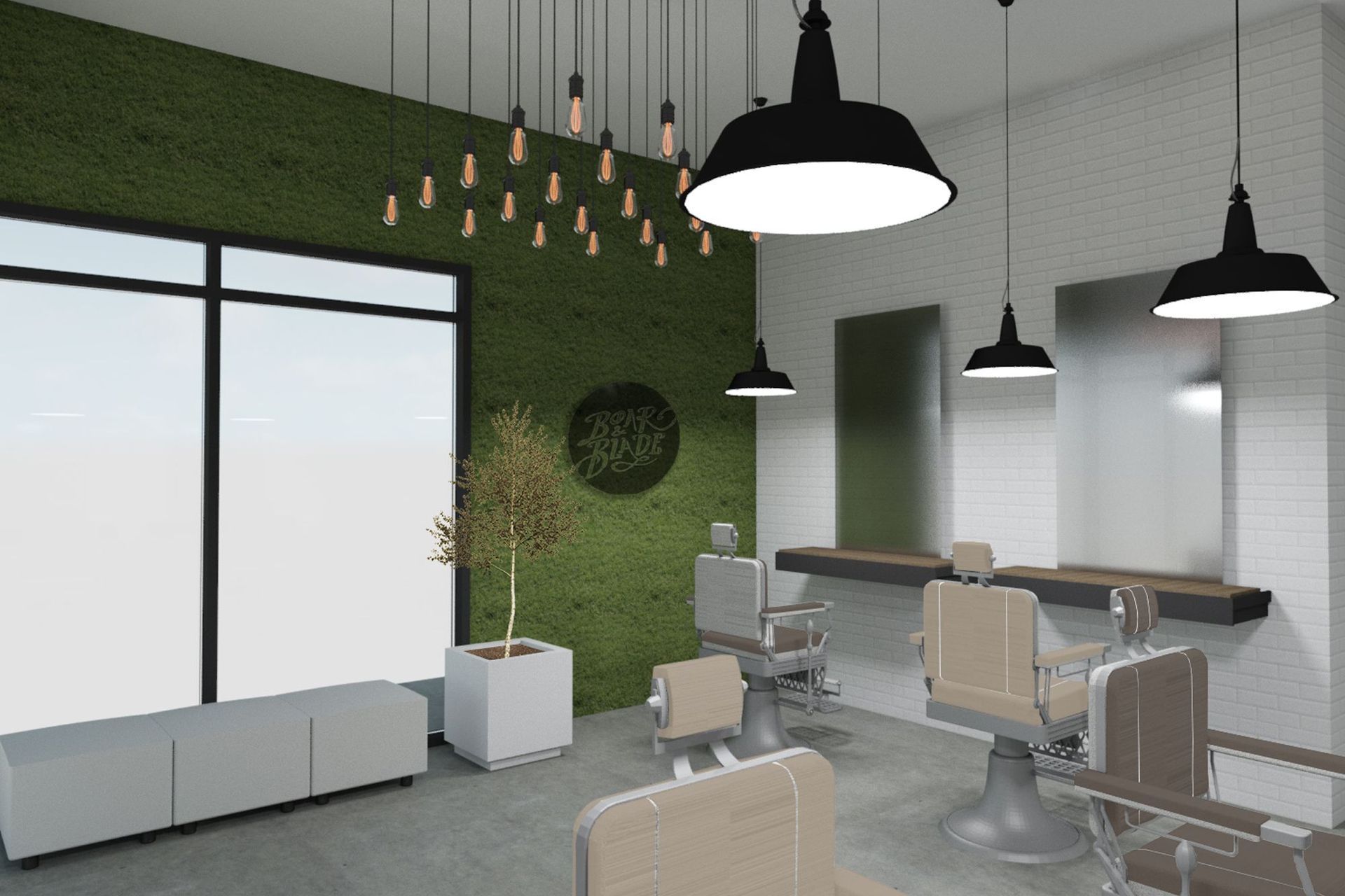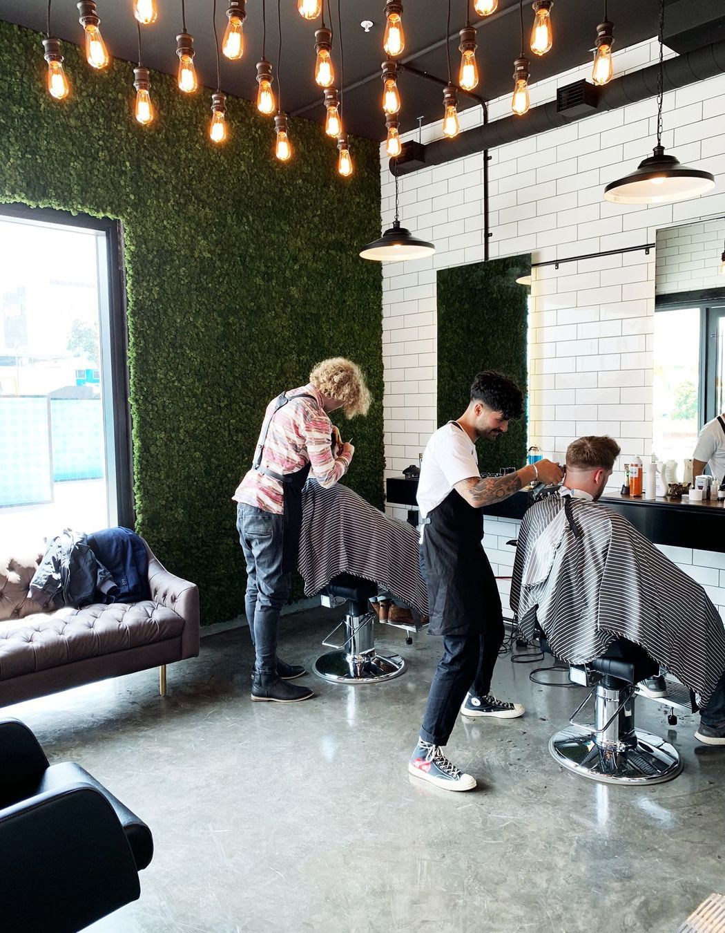 ArchiPro Project Summary - Vintage barbershop design with contemporary elements, featuring acoustic enhancements and a full-height moss wall for a touch of greenery in Auckland City.