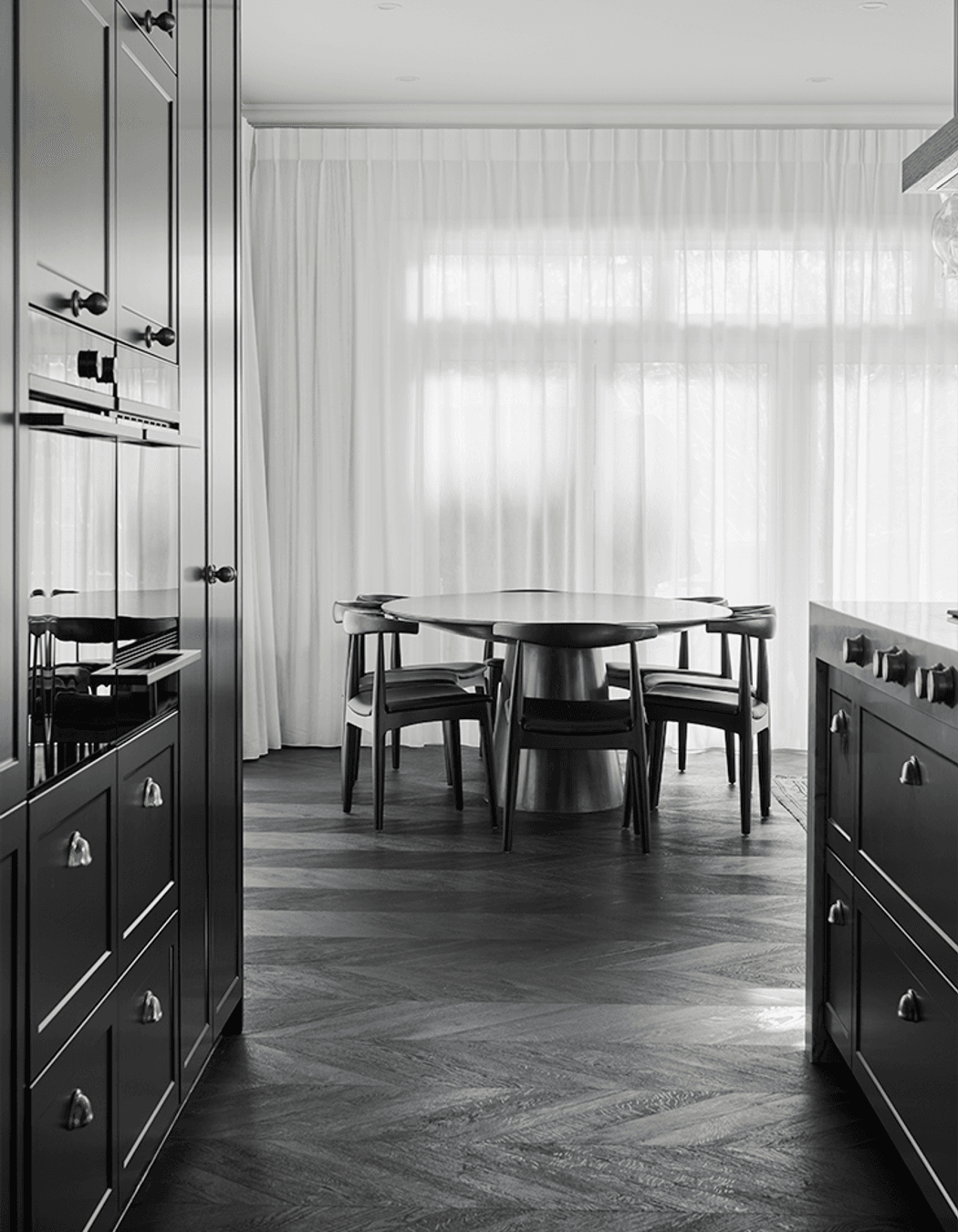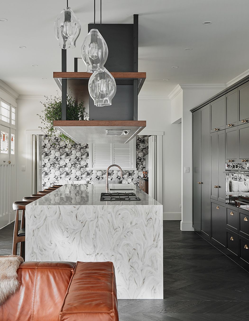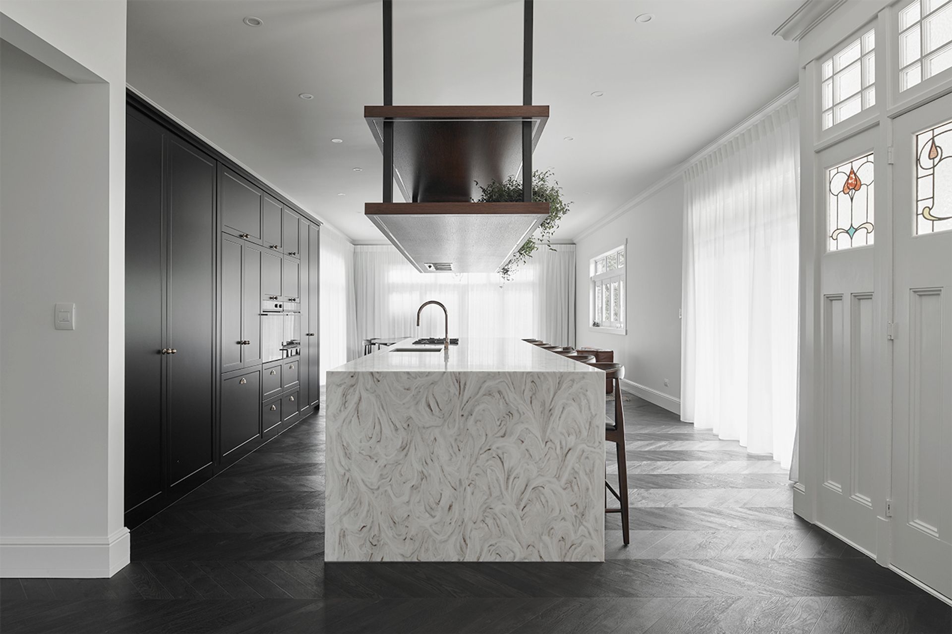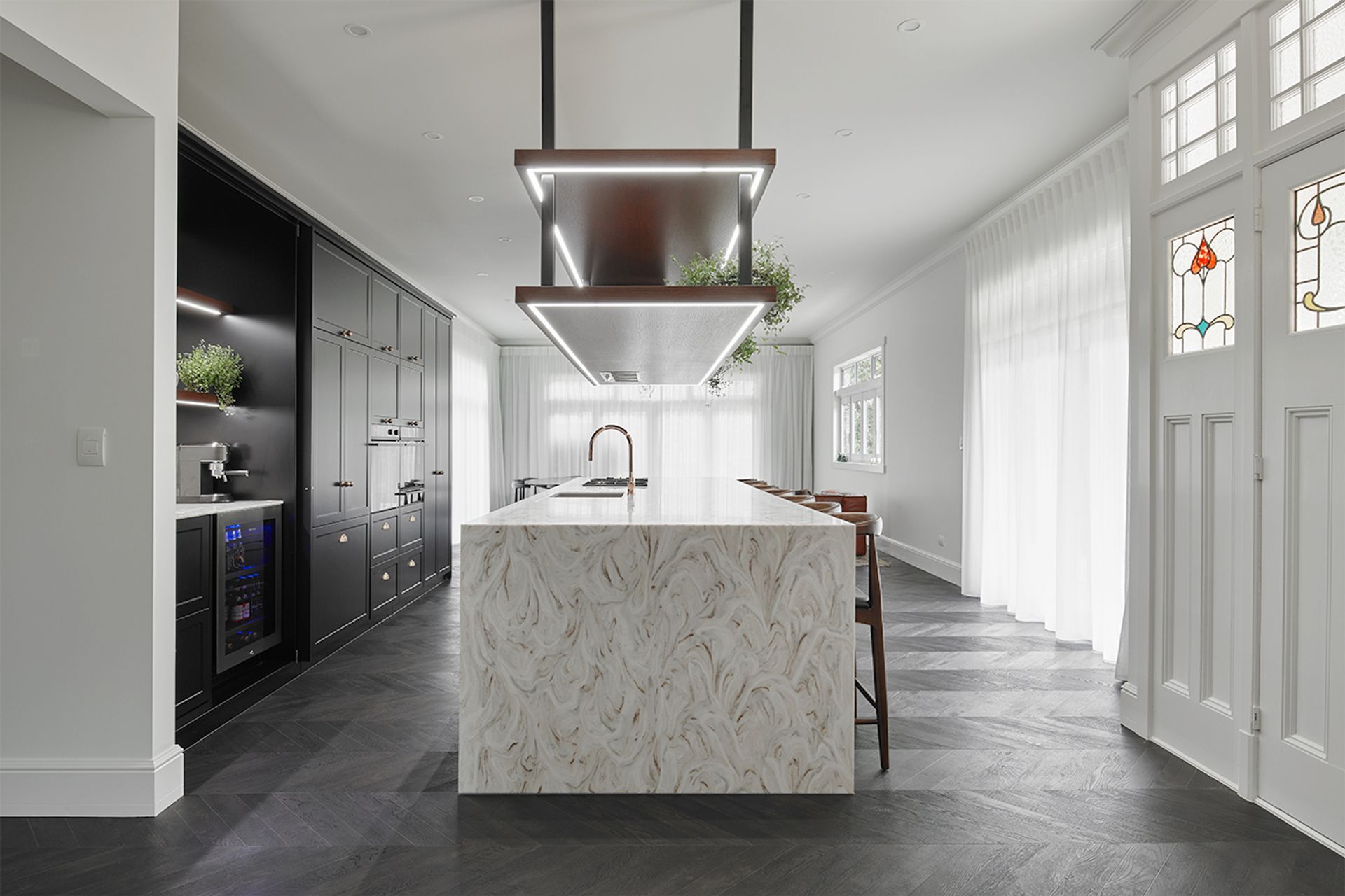 ArchiPro Project Summary - A meticulously renovated 1930s bungalow featuring a bold kitchen design with integrated appliances, a striking Corian island, and elegant oak accents, creating a harmonious blend of functionality and style.