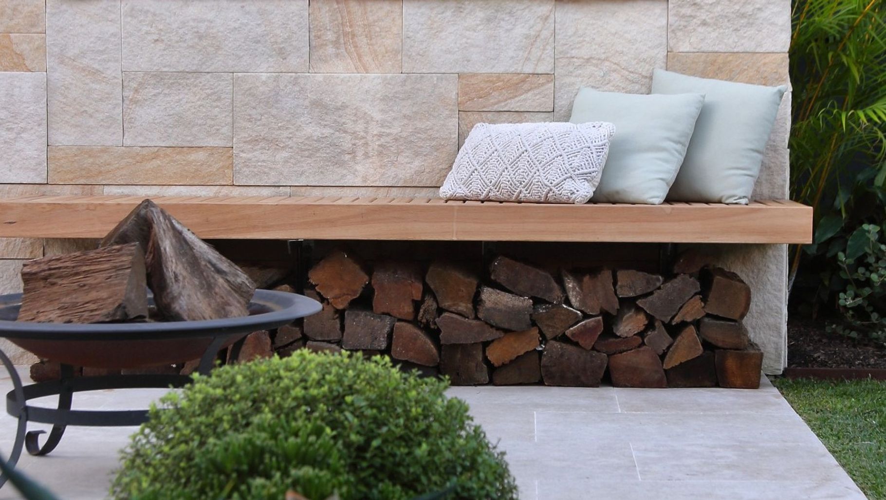 ArchiPro Project Summary - Contemporary coastal alfresco area featuring Sareen Stone’s Lavarosa Limestone, exotic plants, and a stylish firepit and BBQ zone, designed to harmonize with the natural coastal aesthetics.