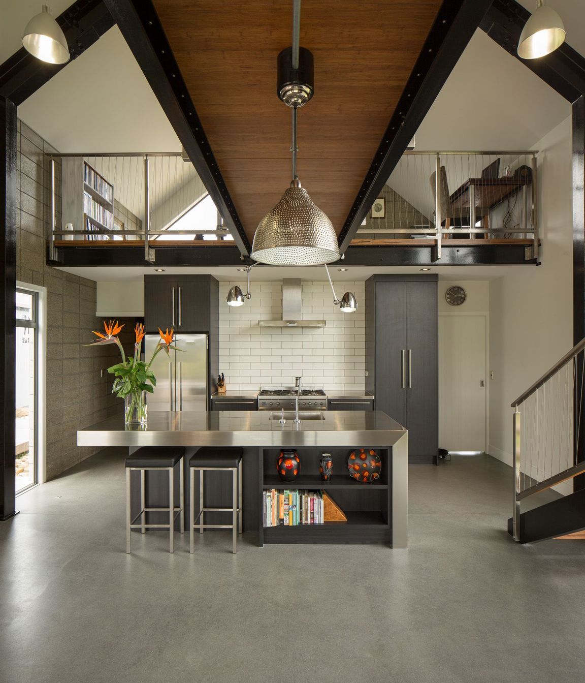 ArchiPro Project Summary - A striking farmhouse design blending industrial elements with rural aesthetics, completed in 2015, featuring rugged honed concrete block, corrugated iron cladding, and expansive views, all while providing a warm and inviting interior space.