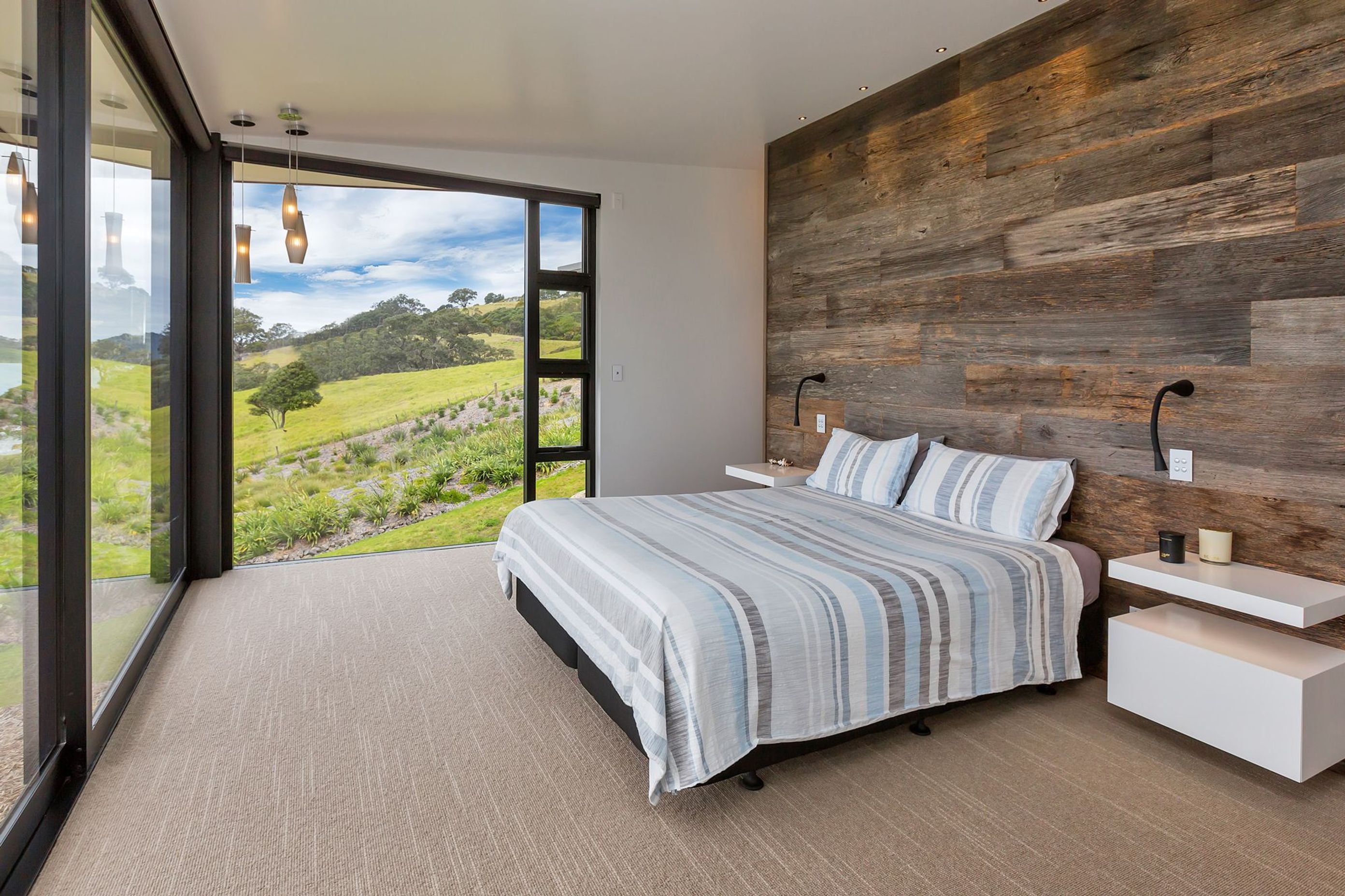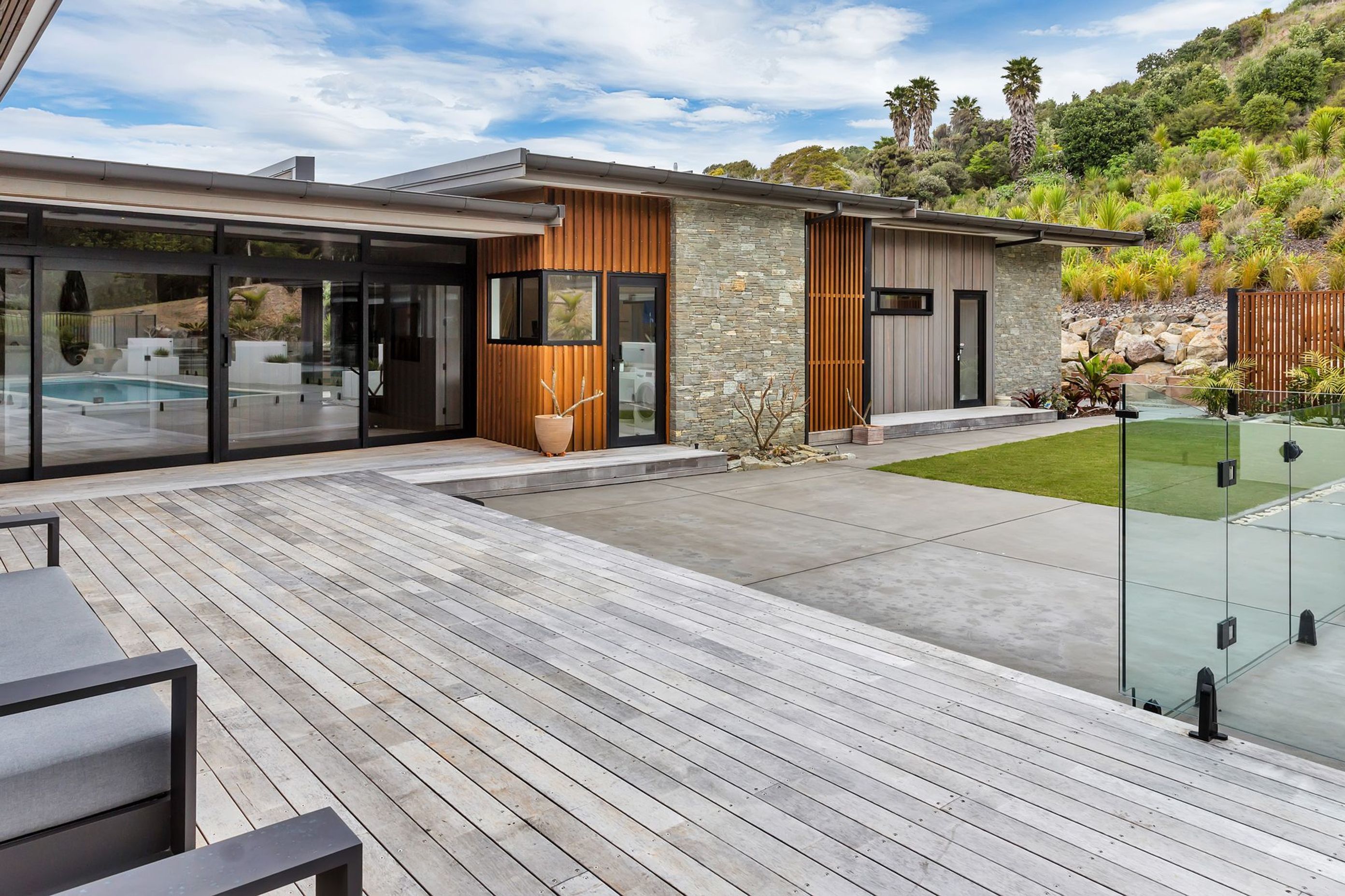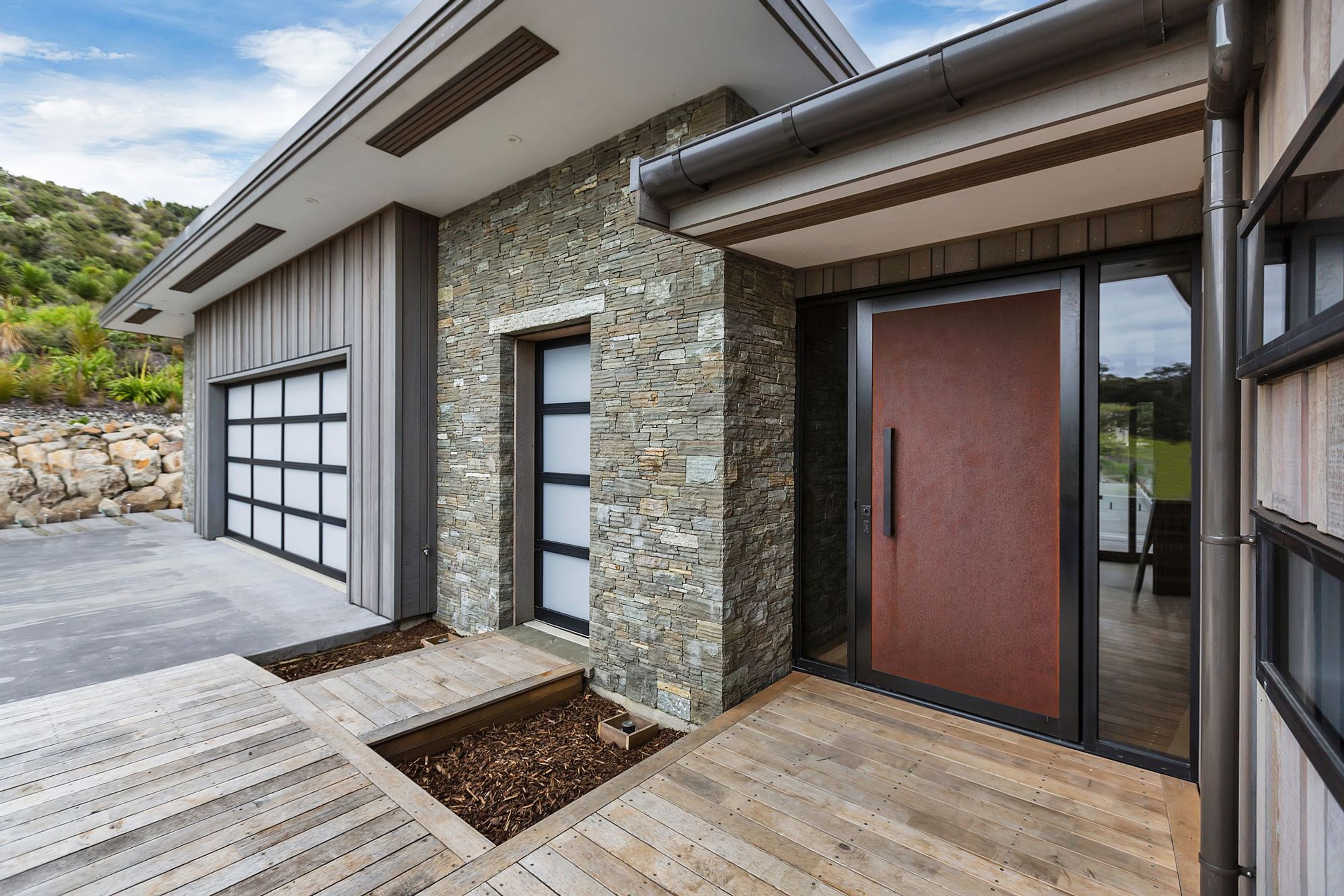 ArchiPro Project Summary - The Bream Bay Home combines modern design with farmhouse charm, featuring a porch, elegant siding, and garden buildings on a scenic slope.