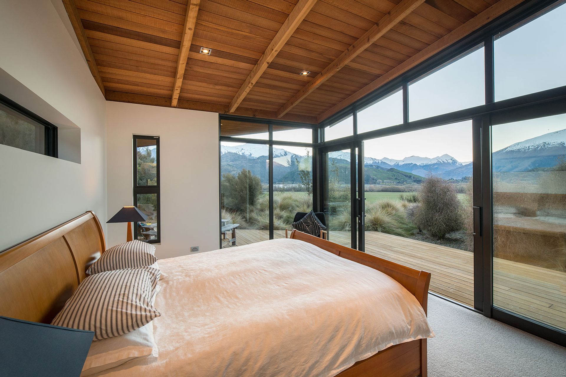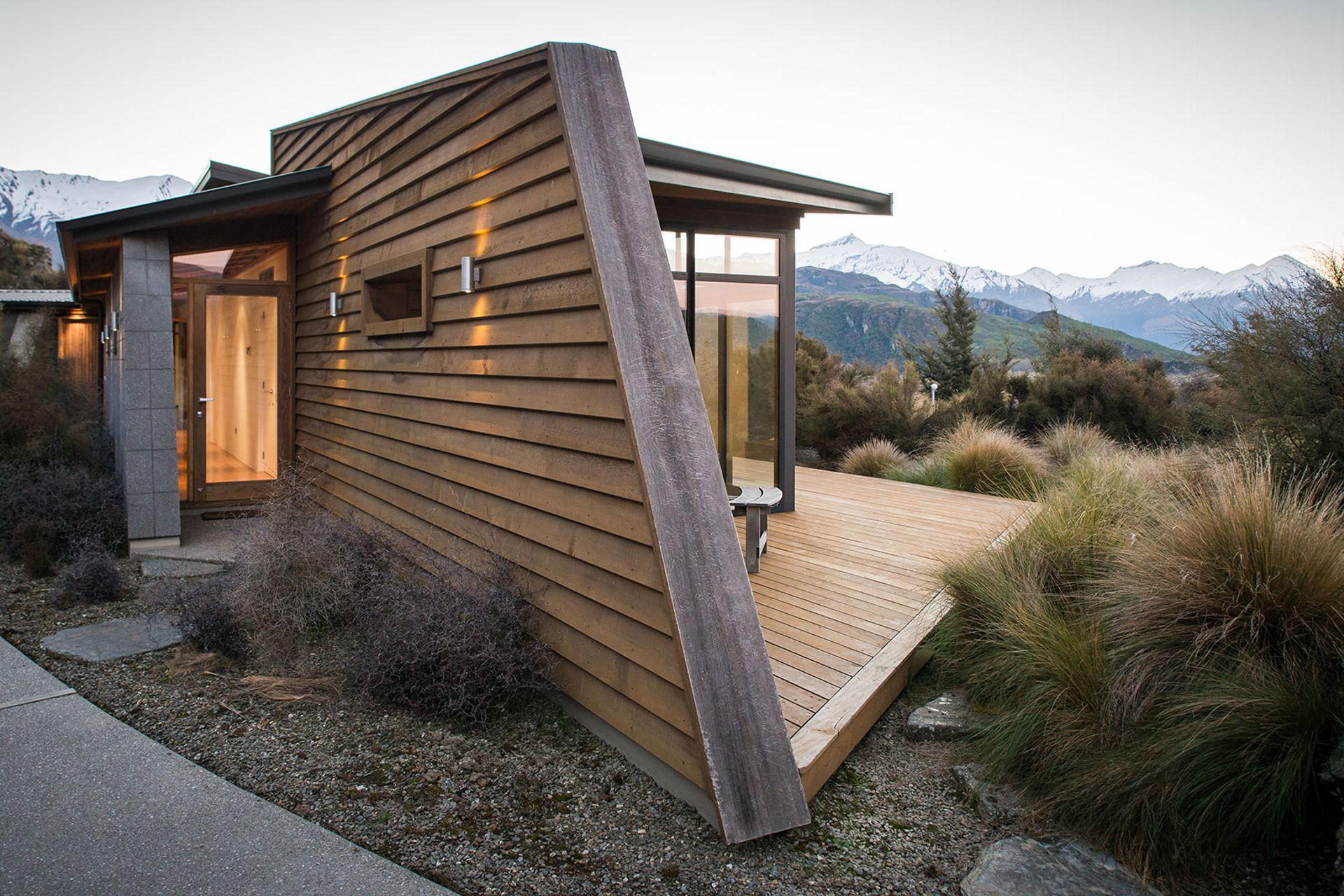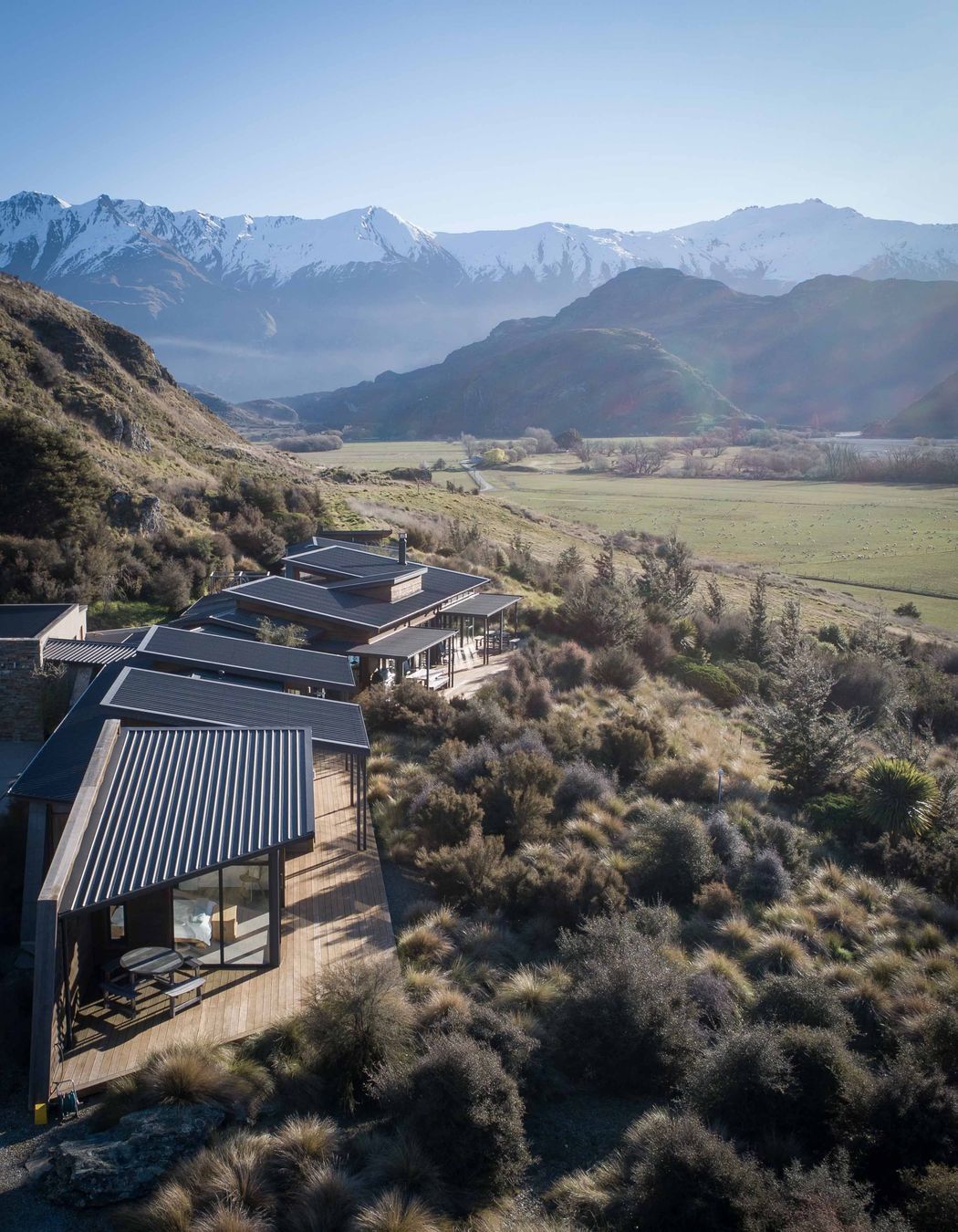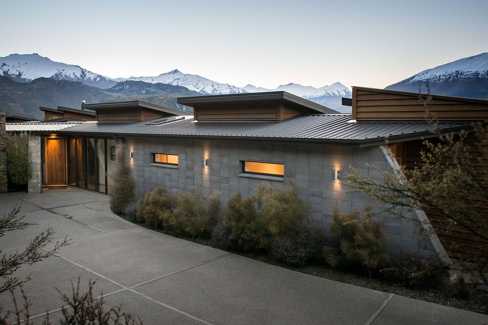 ArchiPro Project Summary - A thoughtfully designed residence in Wanaka, featuring a non-rectangular form that harmonizes with the landscape, comprising a main living space and two bedroom wings, all while respecting the natural contours and rocky outcrops of its stunning South Island surroundings.