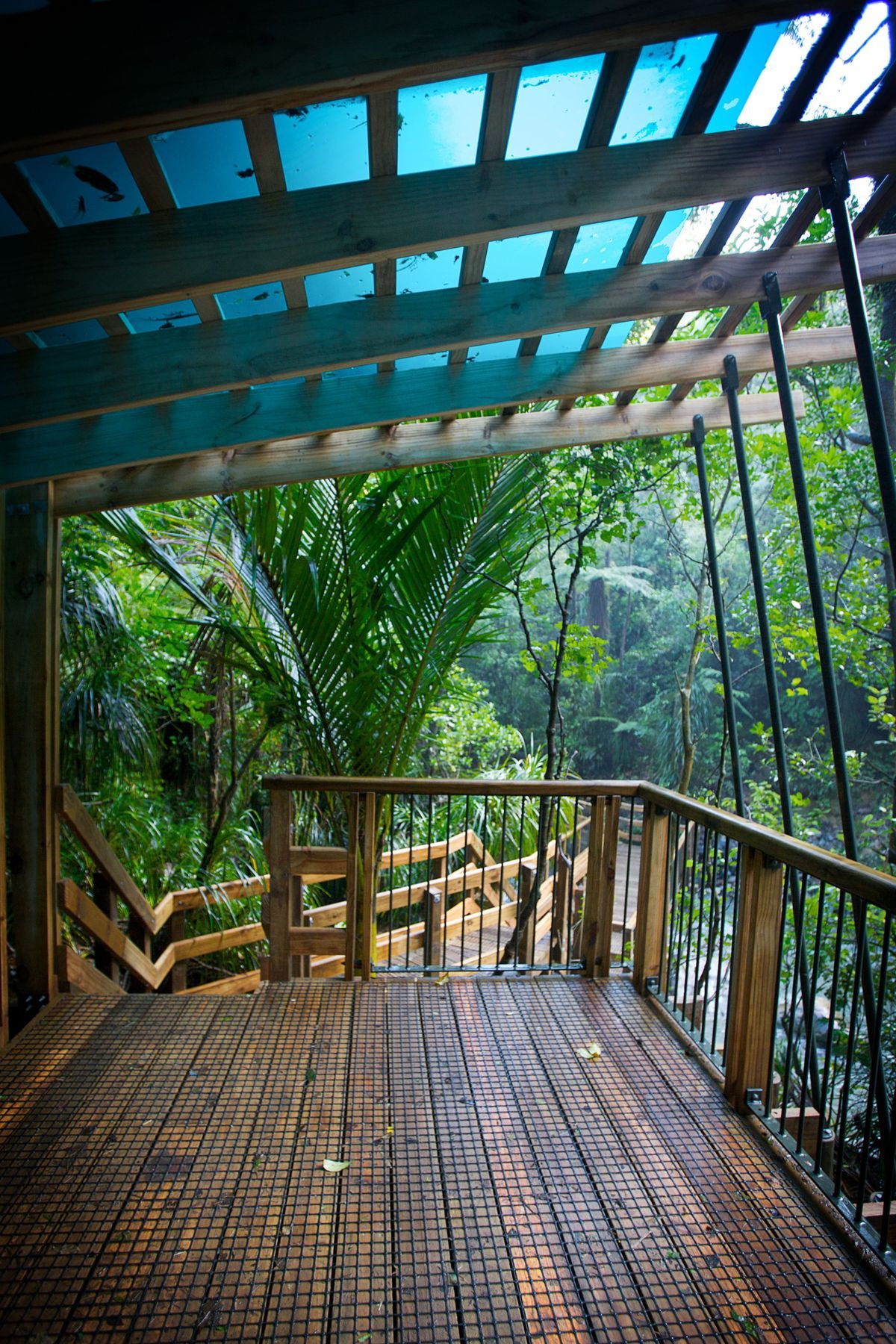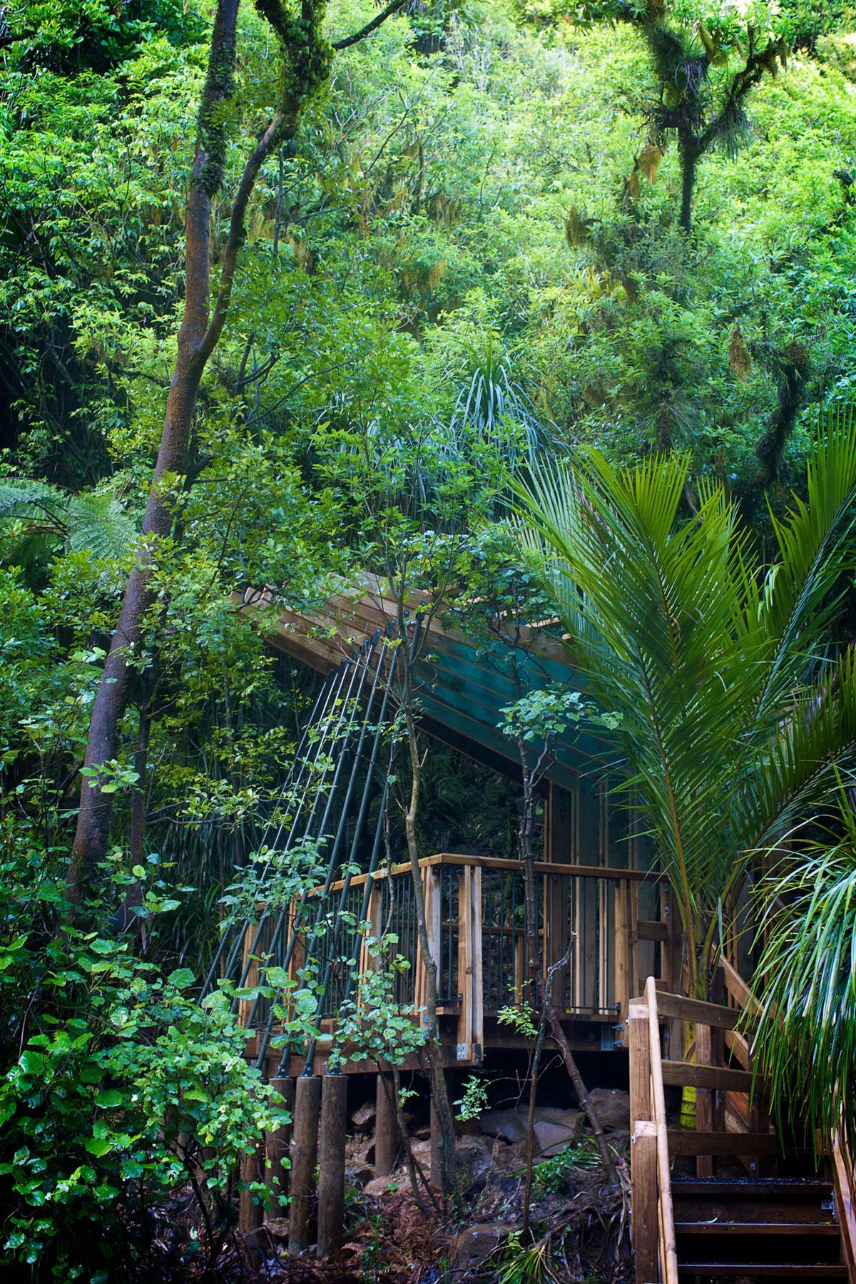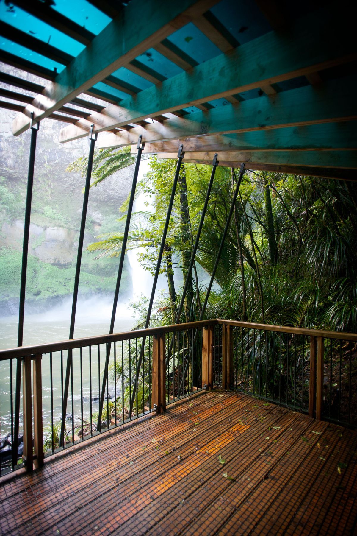 ArchiPro Project Summary - A sculptural viewing shelter at Bridal Veil Falls, designed for the Department of Conservation to enhance accessibility and environmental awareness, featuring a twisted roof and natural materials that invite visitors to experience the beauty of the waterfall.